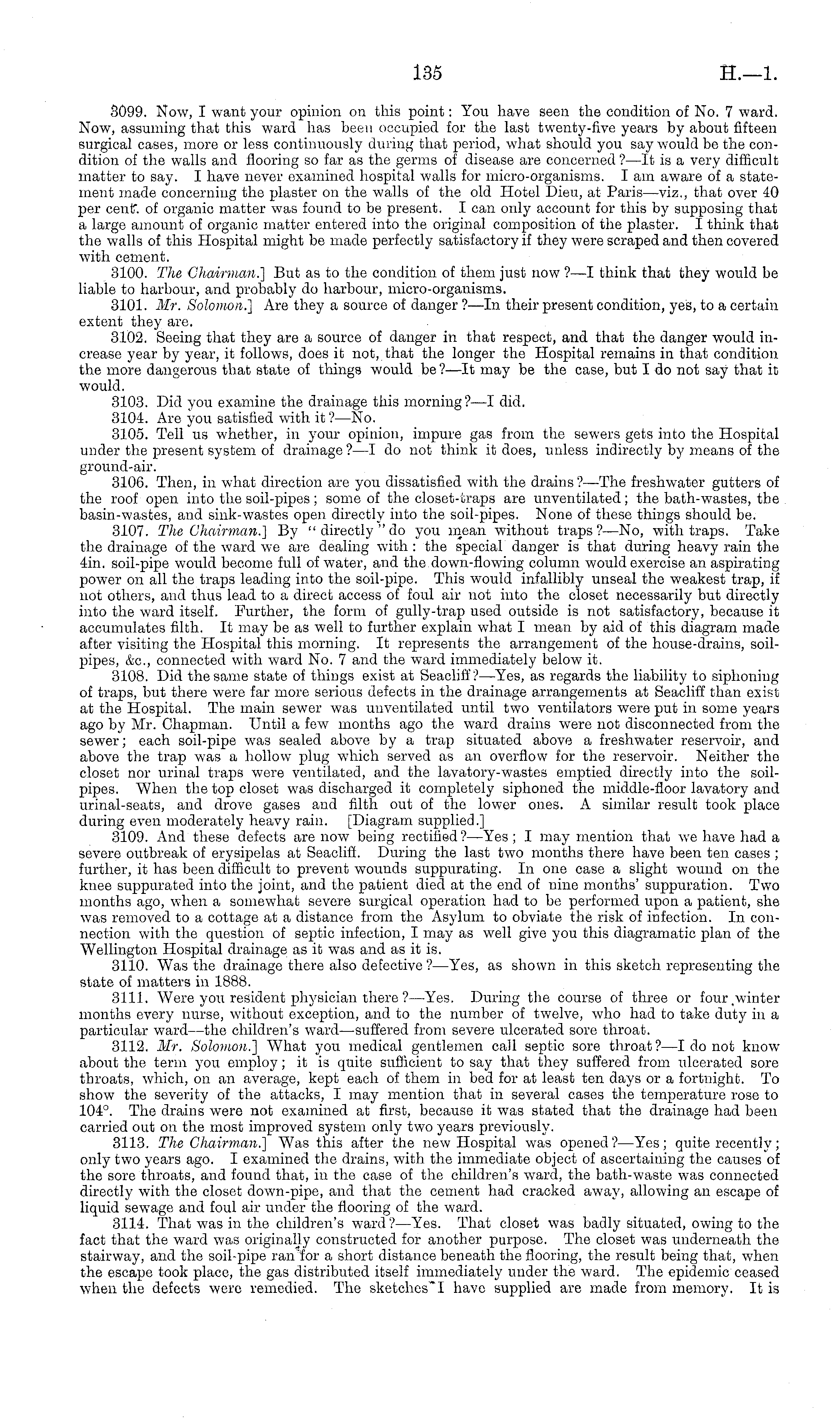 3099. Now, I want your opinion on this point: You have seen the condition of No. 7 ward. Now, assuming that this ward has been occupied for the last twenty-five years by about fifteen surgical cases, more or less continuously during that period, what should you say would be the condition of the walls and flooring so far as the germs of disease are concerned ?—lt is a very difficult matter to say. I have never examined hospital walls for micro-organisms. lam aware of a statement made concerning the plaster on the walls of the old Hotel Dieu, at Paris—viz., that over 40 per centf. of organic matter was found to be present. I can only account for this by supposing that a large amount of organic matter entered into the original composition of the plaster. I think that the walls of this Hospital might be made perfectly satisfactory if they were scraped and then covered with cement. 3100. The Chairman.} But as to the condition of them just now ?—I think that they would be liable to harbour, and probably do harbour, micro-organisms. 3101. Mr. Solomon.] Are they a source of danger ? —ln their present condition, yes, to a certain extent they are. 3102. Seeing that they are a source of danger in that respect, and that the danger would increase year by year, it follows, does it not, that the longer the Hospital remains in that condition the more dangerous that state of things would be ?—lt may be the case, but I do not say that it would. 3103. Did you examine the drainage this morning?—l did. 3104. Are you satisfied with it ?—No. 3105. Tell us whether, in your opinion, impure gas from the sewers gets into the Hospital under the present system of drainage ?—I do not think it does, unless indirectly by means of the ground-air. 3106. Then, in what direction are you dissatisfied with the drains ?—The freshwater gutters of the roof open into the soil-pipes; some of the closet-traps are unventilated; the bath-wastes, the basin-wastes, and sink-wastes open directly into the soil-pipes. None of these things should be. 3107. The Chairman.] By " directly "do you mean without traps ?—No, with traps. Take the drainage of the ward we are dealing with : the special danger is that during heavy rain the 4in. soil-pipe would become full of water, and the down-flowing column would exercise an aspirating power on all the traps leading into the soil-pipe. This would infallibly unseal the weakest trap, if not others, and thus lead to a direct access of foul air not into the closet necessarily but directly into the ward itself. Further, the form of gully-trap used outside is not satisfactory, because it accumulates filth. It may be as well to further explain what I mean by aid of this diagram made after visiting the Hospital this morning. It represents the arrangement of the house-drains, soilpipes, &c, connected with ward No. 7 and the ward immediately below it. 3108. Did the same state of things exist at Seacliff?—Yes, as regards the liability to siphoning of traps, but there were far more serious defects in the drainage arrangements at Seacliff than exist at the Hospital. The main sewer was uuventilated until two ventilators were put in some years ago by Mr. Chapman. Until a few months ago the ward drains were not disconnected from the sewer; each soil-pipe was sealed above by a trap situated above a freshwater reservoir, and above the trap was a hollow plug which served as an overflow for the reservoir. Neither the closet nor urinal traps were ventilated, and the lavatory-wastes emptied directly into the soilpipes. When the top closet was discharged it completely siphoned the middle-floor lavatory and urinal-seats, and drove gases and filth out of the lower ones. A similar result took place during even moderately heavy rain. [Diagram supplied.] 3109. And these defects are now being rectified? —Yes ; I may mention that we have had a severe outbreak of erysipelas at Seacliff. During the last two months there have been ten cases ; further, it has been difficult to prevent wounds suppurating. In one case a slight wound on the knee suppurated into the joint, and the patient died at the end of nine months' suppuration. Two months ago, when a somewhat severe surgical operation had to be performed upon a patient, she was removed to a cottage at a distance from the Asylum to obviate the risk of infection. In connection with the question of septic infection, I may as well give you this diagramatic plan of the Wellington Hospital drainage as it was and as it is. 3110. Was the drainage there also defective?— Yes, as shown in this sketch representing the state of matters in 1888. 3111. Were you resident physician there ?—Yes. During the course of three or four winter months every nurse, without exception, and to the number of twelve, who had to take duty in a particular ward—the children's ward—suffered from severe ulcerated sore throat. 3112. Mr. Solomon.'] What you medical gentlemen call septic sore throat?—l do not know about the term you employ; it is quite sufficient to say that they suffered from ulcerated sore throats, which, on an average, kept each of them in bed for at least ten days or a fortnight. To show the severity of the attacks, I may mention that in several cases the temperature rose to 104°. The drains were not examined at first, because it was stated that the drainage had been carried out on the most improved system only two years previously. 3113. The Chairman.] Was this after the new Hospital was opened ? —Yes ; quite recently; only two years ago. I examined the drains, with the immediate object of ascertaining the causes of the sore throats, and found that, in the case of the children's ward, the bath-waste was connected directly with the closet down-pipe, and that the cement had cracked away, allowing an escape of liquid sewage and foul air under the flooring of the ward. 3114. That was in the children's ward ?—Yes. That closet was badly situated, owing to the fact t