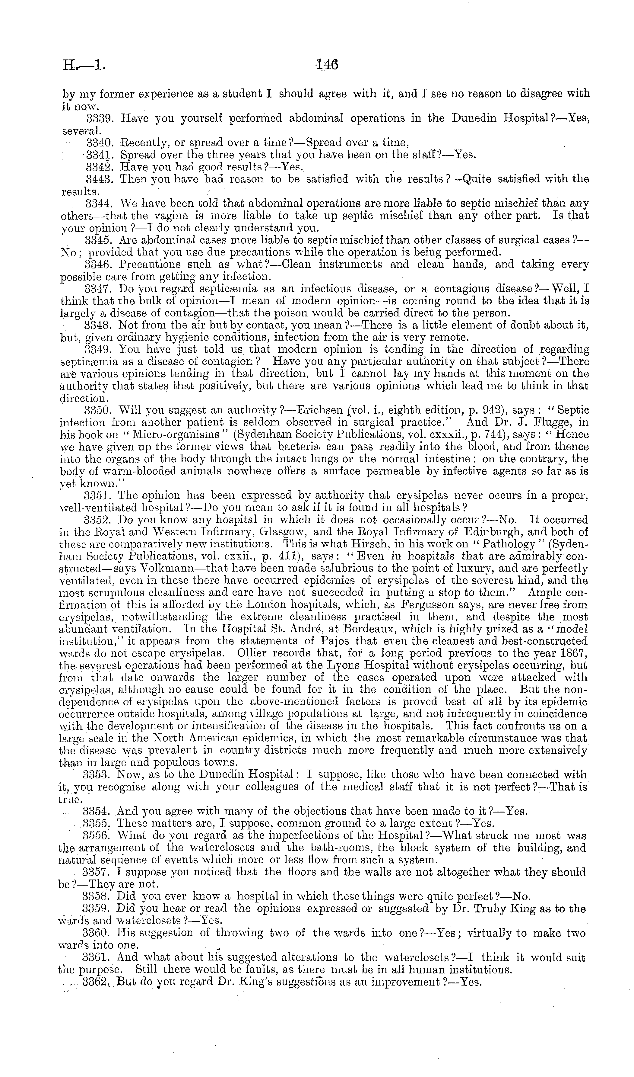 by my former experience as a student I should agree with it, and I see no reason to disagree with it now. 3339. Have you yourself performed abdominal operations in the Dunedin Hospital?— Yes, several. 3340. Eecently, or spread over a time?— Spread over a time. 3341. Spread over the three years that you have been on the staff?— Yes. 3342. Have you had good results?— Yes. 3443. Then you have had reason to be satisfied with the results ?—Quite satisfied with the results. 3344. We have been told that abdominal operations are more liable to septic mischief than any others —that the vagina is more liable to take up septic mischief than any other part. Is that your opinion ? —I do not clearly understand you. 3345. Are abdominal cases more liable to septic mischief than other classes of surgical cases ?— No ; provided that you use due precautions while the operation is being performed. 3346. Precautions such as what?— Clean instruments and clean hands, and taking every possible care from getting any infection. 3347. Do you regard septicaemia as an infectious disease, or a contagious disease? —Well, I think that the bulk of opinion—l mean of modern opinion—is coming round to the idea that it is largely a disease of contagion—that the poison would be carried direct to the person. 3348. Not from the air but by contact, you mean ? —There is a little element of doubt about it, but, given ordinary hygienic conditions, infection from the air is very remote. 3349. You have just told us that modern opinion is tending in the direction of regarding septicaomia as a disease of contagion ? Have you any particular authority on that subject ? —There are various opinions tending in that direction, but I cannot lay my hands at this moment on the authority that states that positively, but there are various opinions which lead me to think in that direction. 3350. Will you suggest an authority ?—Erichsen (vol. i., eighth edition, p. 942), says : " Septic infection from another patient is seldom observed in surgical practice." And Dr. J. Flugge, in his book on " Micro-organisms " (Sydenham Society Publications, vol. cxxxii., p. 744), says : " Hence we have given up the former views that bacteria can pass readily into the blood, and from thence into the organs of the body through the intact lungs or the normal intestine : on the contrary, the body of warm-blooded animals nowhere offers a surface permeable by infective agents so far as is yet known." 3351. The opinion has been expressed by authority that erysipelas never occurs in a proper, well-ventilated hospital ? —Do you mean to ask if it is found in all hospitals ? 3352. Do you know any hospital in which it does not occasionally occur ?—No. It occurred in the Eoyal and Western Infirmary, Glasgow, and the Eoyal Infirmary of Edinburgh, and both of these are comparatively new institutions. This is what Hirsch, in his work on " Pathology " (Sydenham Society Publications, vol. cxxii., p. 411), says: "Even in hospitals that are admirably constructed —says Volkmanu —that have been made salubrious to the point of luxury, and are perfectly ventilated, even in these there have occurred epidemics of erysipelas of the severest kind, and the most scrupulous cleanliness and care have not succeeded in putting a stop to them." Ample confirmation of this is afforded by the London hospitals, which, as Fergusson says, are never free from erysipelas, notwithstanding the extreme cleanliness practised in them, and despite the most abundant ventilation. In the Hospital St. Andre, at Bordeaux, which is highly prized as a "model institution," it appears from the statements of Pajos that even the cleanest and best-constructed wards do not escape erysipelas. Oilier records that, for a long period previous to the year 1867, the- severest operations had been performed at the Lyons Hospital without erysipelas occurring, but from that date onwards the larger number of the cases operated upon were attacked with erysipelas, although no cause could be found for it in the condition of the place. But the nondependence of erysipelas upon the above-mentioned factors is proved best of all by its epidemic occurrence outside hospitals, among village populations at large, and not infrequently in coincidence with the development or intensification of the disease in the hospitals. This fact confronts us on a large scale in the North American epidemics, in which the most remarkable circumstance was that the disease was prevalent in country districts much more frequently and much more extensively than in large and populous towns. 3353. Now, as to the Dunedin Hospital: I suppose, like those who have been connected with it, you recognise along with your colleagues of the medical staff that it is not perfect ?—That is true. 3354. And you agree with many of the objections that have been made to it?— Yes. 3355. These matters are, I suppose, common ground to a large extent ?—Yes. 3556. What do you regard as the imperfections of the Hospital?— What struck me most was the arrangement of the waterclosets and the bath-rooms, the block system of the building, and natural sequence of events which more or less flow from such a system. 3357. I suppose you noticed that the floors and the walls are not altogether what they should be ?—They are not. 3358. Did you ever know a hospital in which these things were quite perfect ?—No. 3359. Did you hear or read the opinions expressed or suggested by Dr. Truby King as to the wards and waterclosets ?—Yes. 3360. His suggestion of throwing two of the wards into one ? —Yes; virtually to make two wards into one. 3361. And what about his suggested alterations to the waterclosets?—l think it would suit the purpose. Still there would be faults, as there must be in all human institutions. . ~: 3362. But do you regard Dr. King's suggestions as an improvement ? —Yes.