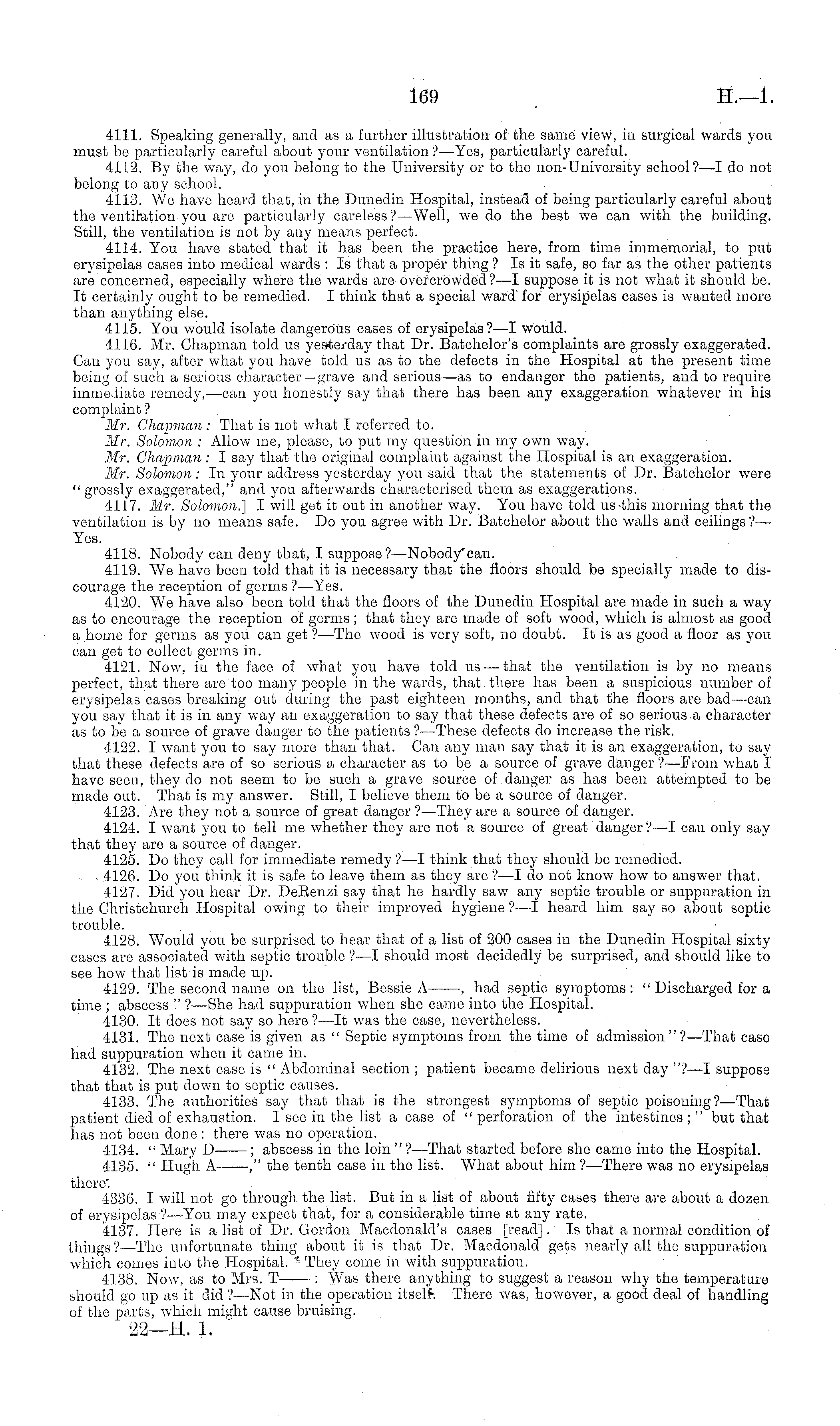 4111. Speaking generally, and as a further illustration of the same view, in surgical wards you must be particularly careful about your ventilation ?—Yes, particularly careful. 4112. By the way, do you belong to the University or to the non-University school?—I do not belong to any school. 4113. We have heard that, in the Dunedin Hospital, instea3 of being particularly careful about the ventilation you are particularly careless ? —Well, we do the best we can with the building. Still, the ventilation is not by any means perfect. 4114. You have stated that it has been the practice here, from time immemorial, to put erysipelas cases into medical wards : Is that a proper thing ? Is it safe, so far as the other patients are concerned, especially where the wards are overcrowded?—l suppose it is not what it should be. It certainly ought to be remedied. I think that a special ward for erysipelas cases is wanted more than anything else. 4115. You would isolate dangerous cases of erysipelas?—l would. 4116. Mr. Chapman told us yesterday that Dr. Batchelor's complaints are grossly exaggerated. Can you say, after what you have told us as to the defects in the Hospital at the present time being of such a serious character —grave and serious—as to endanger the patients, and to require immediate remedy,—can you honestly say that there has been any exaggeration whatever in his complaint ? Mr. Chapman : That is not what I referred to. Mr. Solomon : Allow me, please, to put my question in my own way. Mr. Chapman: I say that the original complaint against the Hospital is an exaggeration. Mr. Solomon: In your address yesterday you said that the statements of Dr. Batchelor were "grossly exaggerated," and you afterwards characterised them as exaggerations. 4117. Mr. Solomon.] I will get it out in another way. You have told us-this morning that the ventilation is by no means safe. Do you agree with Dr. Batchelor about the walls and ceilings ?— Yes. 4118. Nobody can deny that, I suppose? —Nobody'cau. 4119. We have been told that it is necessary that the floors should be specially made to discourage the reception of germs ? —Yes. 4120. We have also been told that the floors of the Dunedin Hospital are made in such a way as to encourage the reception of germs; that they are made of soft wood, which is almost as good a home for germs as you can get ?—The wood is very soft, no doubt. It is as good a floor as you can get to collect germs in. 4121. Now, in the face of what you have told us — that the ventilation is by no means perfect, that there are too many people in the wards, that there has been a suspicious number of erysipelas cases breaking out during the past eighteen months, and that the floors are bad—can you say that it is in any way an exaggeration to say that these defects are of so serious a character as to be a source of grave danger to the patients ?—These defects do increase the risk. 4122. I want you to say more than that. Can any man say that it is an exaggeration, to say that these defects are of so serious a character as to be a source of grave danger ?—From what I have seen, they do not seem to be such a grave source of danger as has been attempted to be made out. That is my answer. Still, I believe them to be a source of danger. 4123. Are they not a source of great danger ?—They are a source of danger. 4124. I want you to tell me whether they are not a source of great danger ? —1 can only say that they are a source of danger. 4125. Do they call for immediate remedy?—l think that they should be remedied. . 4126. Do you think it is safe to leave them as they are ?—I do not know how to answer that. 4127. Did you hear Dr. Deßenzi say that he hardly saw any septic trouble or suppuration in the Christchurch Hospital owing to their improved hygiene ?—I heard him say so about septic trouble. 4128. W Tould you be surprised to hear that of a list of 200 cases in the Dunedin Hospital sixty cases are associated with septic trouble ?—I should most decidedly be surprised, and should like to see how that list is made up. 4129. The second name on the list, Bessie A , had septic symptoms: " Discharged for a time ; abscess " ? —She had suppuration when she came into the Hospital. 4130. It does not say so here ?—lt was the case, nevertheless. 4131. The next case is given as " Septic symptoms from the time of admission"?— That case had suppuration when it came in. 4132. The next case is " Abdominal section ; patient became delirious next day "?—I suppose that that is put down to septic causes. 4133. The authorities say that that is the strongest symptoms of septic poisoning?— That patient died of exhaustion. I see in the list a case of " perforation of the intestines ; " but that has not been done : there was no operation. 4134. " Mary D ; abscess in the loin " ?—That started before she came into the Hospital. 4135. " Hugh A ," the tenth case in the list. What about him ?—There was no erysipelas there*. 4336. I will not go through the list. But in a list of about fifty cases there are about a dozen of erysipelas ?—You may expect that, for a considerable time at any rate. 4137. Here is a list of Dr. Gordon Macdonald's cases [read]. Is that a normal condition of things ?—The unfortunate thing about it is that Dr. Macdonald gets nearly all the suppuration which comes into the Hospital. * They come in with suppuration. 4138. Now, as to Mrs. T : Was there anything to suggest a reason why the temperature should go up as it did?— Not in the operation itself. There was, however, a good deal of handling of the parts, which might cause bruising. 22— H. 1.