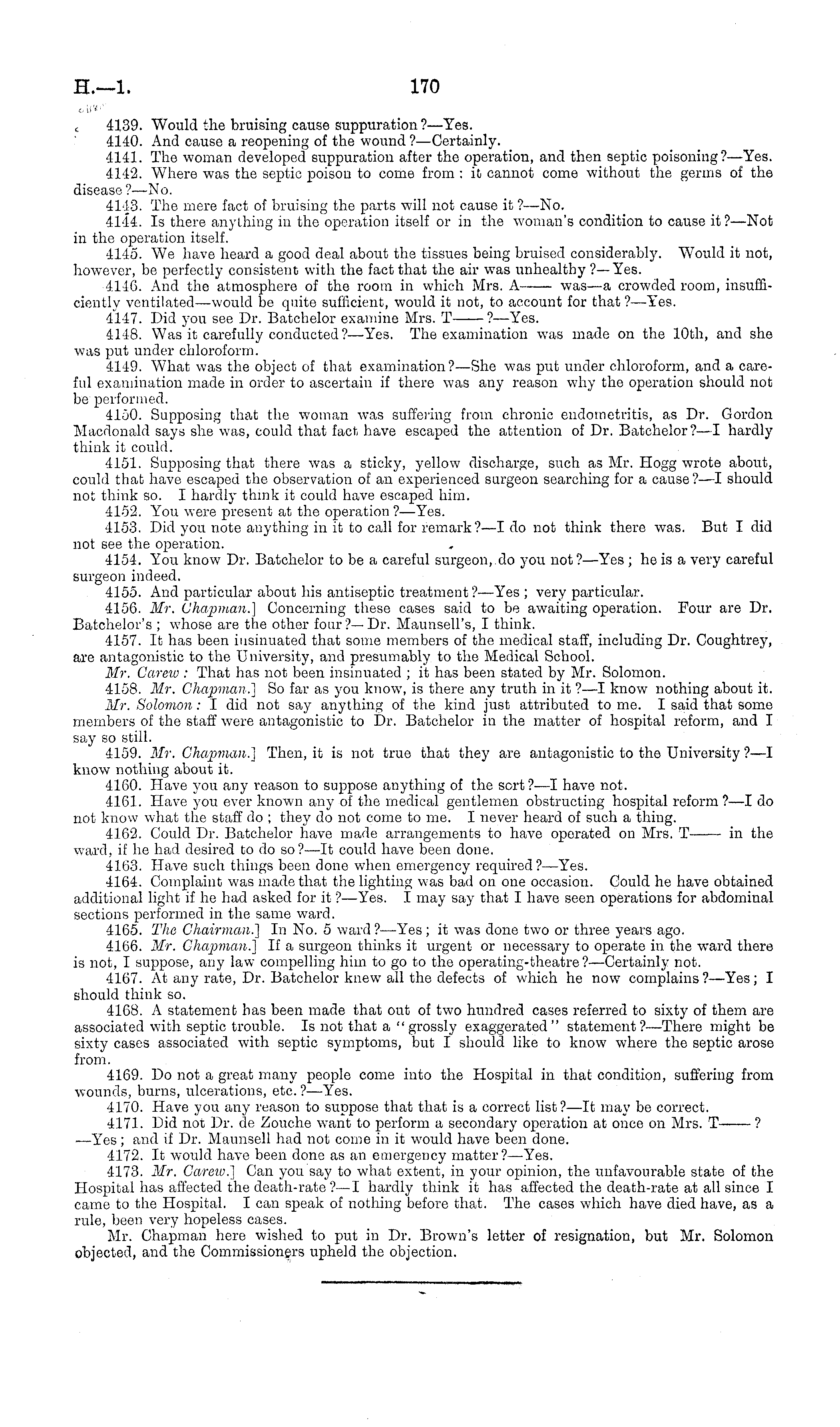c 4139. Would the bruising cause suppuration ?—Yes. 4140. And cause a reopening of the wound ?—Certainly. 4141. The woman developed suppuration after the operation, and then septic poisoning?— Yes. 4142. Where was the septic poison to come from : it cannot come without the germs of the disease ?—No. 4143. The mere fact of bruising the parts will not cause it ?—No. 4144. Is there anything in the operation itself or in the woman's condition to cause it?— Not in the operation itself. 4145. We have heard a good deal about the tissues being bruised considerably. Would it not, however, be perfectly consistent with the fact that the air was unhealthy ? —Yes. 4146. And the atmosphere of the room in which Mrs. A was—a crowded room, insufficiently ventilated—would be quite sufficient, would it not, to account for that ?—Yes. 4147. Did you see Dr. Batchelor examine Mrs. T—— ?—Yes. 4148. Was it carefully conducted ?-—Yes. The examination was made on the 10th, and she was put under chloroform. 4149. What was the object of that examination?— She was put under chloroform, and a careful examination made in order to ascertain if there was any reason why the operation should not be performed. 4150. Supposing that the woman was suffering from chronic endoinetritis, as Dr. Gordon Macdonald says she was, could that fact have escaped the attention of Dr. Batchelor ?—I hardly think it could. 4151. Supposing that there was a sticky, yellow discharge, such as Mr. Hogg wrote about, could that have escaped the observation of an experienced surgeon searching for a cause?—l should not think so. I hardly think it could have escaped him. 4152. You were present at the operation ?—Yes. 4153. Did you note anything in it to call for remark?—-I do not think there was. But I did not see the operation. 4154. You know Dr. Batchelor to be a careful surgeon,do you not?— Yes ;heis a very careful surgeon indeed. 4155. And particular about his antiseptic treatment? —Yes ; very particular. 4156. Mr. Chapman.} Concerning these cases said to be awaiting operation. Four are Dr. Batchelor's ; whose are the other four ?— Dr. Maunsell's, I think. 4157. It has been insinuated that some members of the medical staff, including Dr. Coughtrey, are antagonistic to the University, and presumably to the Medical School. Mr. Carew : That has not been insinuated ; it has been stated by Mr. Solomon. 4158. Mr. Chapman.] So far as you know, is there any truth in it ?—I know nothing about it. Mr. Solomon: I did not say anything of the kind just attributed to me. I said that some members of the staff were antagonistic to Dr. Batchelor in the matter of hospital reform, and I say so still. 4159. Mr. Chapman.] Then, it is not true that they are antagonistic to the University ?—I know nothing about it. 4160. Have you any reason to suppose anything of the sort?—l have not. 4161. Have you ever known any of the medical gentlemen obstructing hospital reform?—l do not know what the staff do ; they do not come to me. I never heard of such a thing. 4162. Could Dr. Batchelor have made arrangements to have operated on Mrs. T——- in the ward, if he had desired to do so?—lt could have been done. 4163. Have such things been done when emergency required?— Yes. 4164. Complaint was made that the lighting was bad on one occasion. Could he have obtained additional light if he had asked for it ?—Yes. I may say that I have seen operations for abdominal sections performed in the same ward. 4165. The Chairman.] In No. 5 ward?— Yes; it was done two or three years ago. 4166. Mr. Chapman.] If a surgeon thinks it urgent or necessary to operate in the ward there is not, I suppose, any law compelling him to go to the operating-theatre?— Certainly not. 4167. At any rate, Dr. Batchelor knew all the defects of which he now complains ?—Yes; I should think so. 4168. A statement has been made that out of two hundred cases referred to sixty of them are associated with septic trouble. Is not that a "grossly exaggerated" statement?— There might be sixty cases associated with septic symptoms, but I should like to know where the septic arose from. 4169. Do not a great many people come into the Hospital in that condition, suffering from wounds, burns, ulcerations, etc. ? —Yes. 4170. Have you any reason to suppose that that is a correct list ?—lt may be correct. 4171. Did not Dr. de Zouche want to perform a secondary operation at once on Mrs. T ? —Yes; and if Dr. Maunsell had not come in it would have been done. 4172. It would have been done as an emergency matter? —Yes. 4173. Mr. Careiv.] Can you say to what extent, in your opinion, the unfavourable state of the Hospital has affected the death-rate ?—I hardly think it has affected the death-rate at all since I came to the Hospital. I can speak of nothing before that. The cases which have died have, as a rule, been very hopeless cases. Mr. Chapman here wished to put in Dr. Brown's letter of resignation, but Mr. Solomon objected, and the Commissioners upheld the objection.