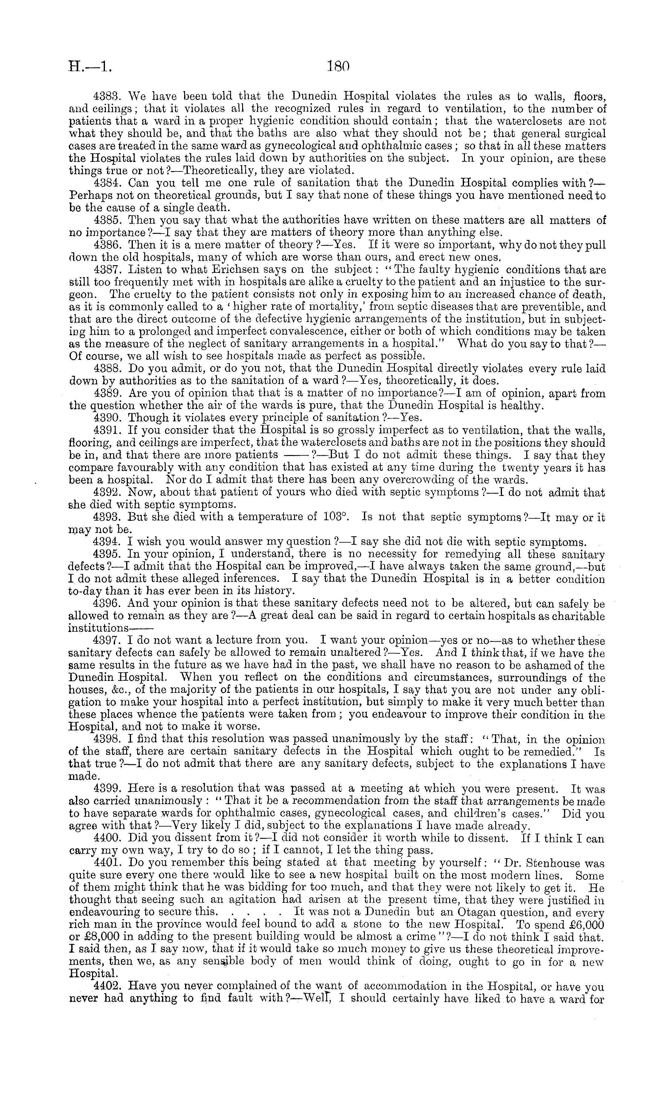 4383. We have been told that the Dunedin Hospital violates the rules as to walls, floors, and ceilings; that it violates all the recognized rules in regard to ventilation, to the number of patients that a ward in a proper hygienic condition should contain ; that the waterclosets are not what they should be, and that the baths are also what they should not be; that general surgical cases are treated in the same ward as gynecological and ophthalmic cases; so that in all these matters the Hospital violates the rules laid down by authorities on the subject. In your opinion, are these things true or not ?—Theoretically, they are violated. 4384. Can you tell me one rule of sanitation that the Dunedin Hospital complies with ?— Perhaps not on theoretical grounds, but I say that none of these things you have mentioned need to be the cause of a single death. 4385. Then you say that what the authorities have written on these matters are all matters of no importance ?—I say that they are matters of theory more than anything else. 4386. Then it is a mere matter of theory? —Yes. If it were so important, why do not they pull down the old hospitals, many of which are worse than ours, and erect new ones. 4387. Listen to what Erichsen says on the subject: " The faulty hygienic conditions that are still too frequently met with in hospitals are alike a cruelty to the patient and an injustice to the surgeon. The cruelty to the patient consists not only in exposing him to an increased chance of death, as it is commonly called to a ' higher rate of mortality,' from septic diseases that are preventible, and that are the direct outcome of the defective hygienic arrangements of the institution, but in subjecting him to a prolonged and imperfect convalescence, either or both of which conditions may be taken as the measure of the neglect of sanitary arrangements in a hospital." What do you say to that?— Of course, we all wish to see hospitals made as perfect as possible. 4388. Do you admit, or do you not, that the Dunedin Hospital directly violates every rule laid down by authorities as to the sanitation of a ward ?—Yes, theoretically, it does. 4389. Are you of opinion that that is a matter of no importance?—l am of opinion, apart from the question whether the air of the wards is pure, that the Dunedin Hospital is healthy. 4390. Though it violates every principle of sanitation ? —Yes. 4391. If you consider that the Hospital is so grossly imperfect as to ventilation, that the walls, flooring, and ceilings are imperfect, that the waterclosets and baths are not in the positions they should be in, and that there are more patients ?—But Ido not admit these things. I say that they compare favourably with any condition that has existed at any time during the twenty years it has been a hospital. Nor do I admit that there has been any overcrowding of the wards. 4392. Now, about that patient of yours who died with septic symptoms ?—I do not admit that she died with septic symptoms. 4393. But she died with a temperature of 103°. Is not that septic symptoms ? —lt may or it may not be. 4394. I wish you would answer my question ? —I say she did not die with septic symptoms. 4395. In your opinion, I understand, there is no necessity for remedying all these sanitary defects ?—I admit that the Hospital can be improved,—l have always taken the same ground,—but Ido not admit these alleged inferences. I say that the Dunedin Hospital is in a better condition to-day than it has ever been in its history. 4396. And your opinion is that these sanitary defects need not to be altered, but can safely be allowed to remain as they are ? —A great deal can be said in regard to certain hospitals as charitable institutions 4397. Ido not want a lecture from you. I want your opinion—yes or no—as to whether these sanitary defects can safely be allowed to remain unaltered?— Yes. And I think that, if we have the same results in the future as we have had in the past, we shall have no reason to be ashamed of the Dunedin Hospital. When you reflect on the conditions and circumstances, surroundings of the houses, &c, of the majority of the patients in our hospitals, I say that you are not under any obligation to make your hospital into a perfect institution, but simply to make it very much better than these places whence the patients were taken from ; you endeavour to improve their condition in the Hospital, and not to make it worse. 4398. I find that this resolution was passed unanimously by the staff: " That, in the opinion of the staff, there are certain sanitary defects in the Hospital which ought to be remedied." Is that true ?—I do not admit that there are any sanitary defects, subject to the explanations I have made. 4399. Here is a resolution that was passed at a meeting at which you were present. It was also carried unanimously : " That it be a recommendation from the staff that arrangements be made to have separate wards for ophthalmic cases, gynecological cases, and children's cases." Did you agree with that ? —Very likely I did, subject to the explanations I have made already. 4400. Did you dissent from it ? —I did not consider it worth while to dissent. If I think I can carry my own way, I try to do so ; if I cannot, I let the thing pass. 4401. Do you remember this being stated at that meeting by yourself: "Dr. Stenhouse was quite sure every one there would like to see a new hospital built on the most modern lines. Some of them might think that he was bidding for too much, and that they were not likely to get it. He thought that seeing such an agitation had arisen at the present time, that they were justified in endeavouring to secure this It was not a Dunedin but an Otagan question, and every rich man in the province would feel bound to add a stone to the new Hospital. To spend £6,000 or £8,000 in adding to the present building would be almost a crime "?—I do not think I said that. I said then, a