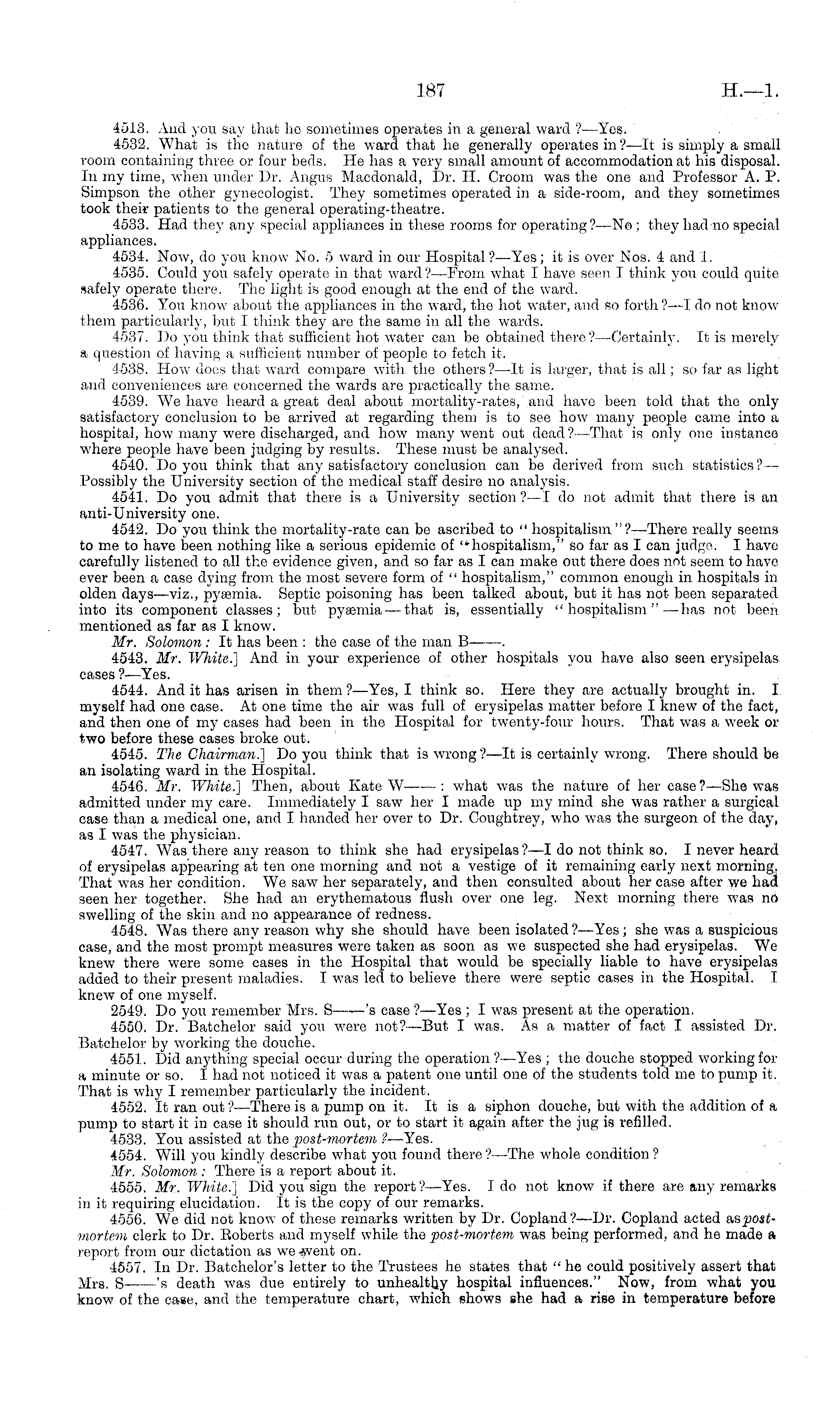 4513. And you say that ho sometimes operates in a general ward ?—Yes. 4532. What is the nature of the ward that he generally operates in ? —lt is simply a small room containing three or four beds. He has a very small amount of accommodation at his disposal. In my time, when under Dr. Angus Macdonald, Dr. 11. Croom was the one and Professor A. P. Simpson the other gynecologist. They sometimes operated in a side-room, and they sometimes took their patients to the general operating-theatre. 4533. Had they any special appliances in these rooms for operating?—No ; they had no special appliances. 4534. Now, do you know No. 5 ward in our Hospital. ? —Yes; it is over Nos. 4 and 1. 4535. Could you safely operate in that ward?— From what I have seen I think you could quite safely operate there. The light is good enough at the end of the ward. 4536. You know about the appliances in the ward, the hot water, and so forth?—l do not know them particular!}', but I think they are the same in all the wards. 4537. Do you think that sufficient hot water can bo obtained there?— Certainly. It is merely a question of having a sufficient number of people to fetch it. 4538. How does that ward compare with the others? —It is larger, that is all; so far as light and conveniences are concerned the wards are practically the same. 4539. We have heard a great deal about mortality-rates, and have been told that the only satisfactory conclusion to be arrived at regarding them is to see how many people came into a hospital, how many were discharged, and how many went oat dead?— That is only one instance where people have been judging by results. These must be analysed. 4540. Do you think that any satisfactory conclusion can be derived from such statistics?— ■ Possibly the University section of the medical staff desire no analysis. 4541. Do you admit that there is a University section? —I do not admit that there is an anti-University one. 4542. Do you think the mortality-rate can be ascribed to " hospitalism " ?—There really seems to me to have been nothing like a serious epidemic of "'hospitalism," so far as I can judge. I have carefully listened to all the evidence given, and so far as I can make out there does not seem to have ever been a case dying from the most severe form of " hospitalism," common enough in hospitals in olden days—viz., pyaemia. Septic poisoning has been talked about, but it has not been separated into its component classes; but pyaemia — that is, essentially "hospitalism"—has not been mentioned as far as I know. Mr. Solomon : It has been : the case of the man B . 4543. Mr. White] And in your experience of other hospitals you have also seen erysipelas cases ?—Yes. 4544. And it has arisen in them ? —Yes, I think so. Here they are actually brought in. I. myself had one case. At one time the air was full of erysipelas matter before I knew of the fact, and then one of my cases had been in the Hospital for twenty-four hours. That was a week or two before these cases broke out. 4545. The Chairman.] Do you think that is wrong ?—lt is certainly wrong. There should be an isolating ward in the Hospital. 4546. Mr. White.] Then, about Kate W : what was the nature of her case?— She was admitted under my care. Immediately I saw her I made up my mind she was rather a surgical case than a medical one, and I handed her over to Dr. Coughtrey, who was the surgeon of the day, as I was the physician. 4547. W 7as there any reason to think she had erysipelas?—l do not think so. I never heard of erysipelas appearing at ten one morning and not a vestige of it remaining early next morning. That was her condition. We saw 7 her separately, and then consulted about her case after we had seen her together. She had an erythematous flush over one leg. Next morning there was no swelling of the skin and no appearance of redness. 4548. Was there any reason why she should have been isolated ?—Yes ; she was a suspicious case, and the most prompt measures were taken as soon as we suspected she had erysipelas. We knew there were some cases in the Hospital that would be specially liable to have erysipelas added to their present maladies. I was led to believe there were septic cases in the Hospital. I knew of one myself. 2549. Do you remember Mrs. S 's case ?—Yes ; I was present at the operation. 4550. Dr. Batchelor said you were not? —But I was. As a matter of fact I assisted Dr. Batchelor by working the douche. 4551. Did anything special occur during the operation ?—Yes ; the douche stopped working for a minute or so. I had not noticed it was a patent one until one of the students told me to pump it. That is why I remember particularly the incident. 4552. It ran out? —There is a pump on it. It is a siphon douche, but with the addition of a pump to start it in case it should run out, or to start it again after the jug is refilled. 4533. You assisted at the post-mortem ?— Yes. 4554. Will you kindly describe what you found there ?—The whole condition ? Mr. Solomon : There is a report about it. 4555. Mr. White.] Did you sign the report?— Yes. Ido not know if there are any remarks in it requiring elucidation. It is the copy of our remarks. 4556. We did not know of these remarks written by Dr. Copland ? —Dr. Copland acted a,spostmortem clerk to Dr. Eoberts and myself while the post-mortem was being performed, and he made a report from our dictation as we-went on. 4557. In Dr. Batchelor's letter to the Trustees he states that "he could positively assert that Mrs. S——'s death was due entirely to unhealthy hospital influences." Now, from what you know of the case, and the temperature chart, which shows she had a rise in temperature before