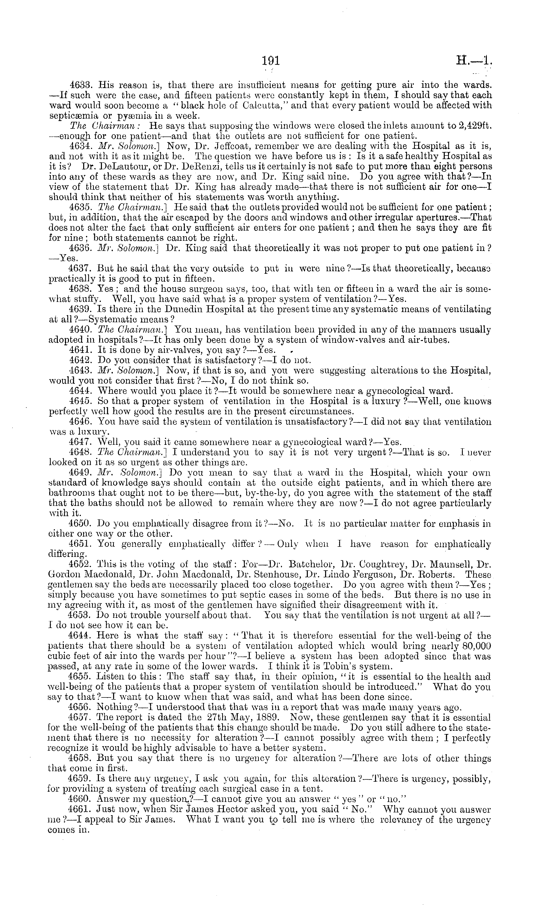 4683. His reason is, that there are insufficient means for getting pure air into the wards. —If such were the case, and fifteen patients were constantly kept in them, I should say that each ward would soon become a " black hole of Calcutta," and that every patient would be affected with septicaemia or pyaemia in a week. The Chairman : He says that supposing the windows were closed the inlets amount to 2,429 ft. —enough for one patient—and that the outlets are not sufficient for one patient. 4634. Mr. Solomon.] Now, Dr. Jeffcoat, remember we are dealing with the Hospital as it is, and not with it as it might be. The question we have before us is :Isit a safe healthy Hospital as it is? Dr. DeLautour, or Dr. DeEenzi, tells us it certainly is not safe to put more than eight persons into any of these wards as they are now, and Dr. King said nine. Do you agree with that?—ln view of the statement that Dr. King has already made —that there is not sufficient air for one —I should think that neither of his statements was worth anything. 4635. The Chairman.'] He said that the outlets provided would not be sufficient for one patient; but, in addition, that the air escaped by the doors and windows and other irregular apertures.—That does not alter the fact that only sufficient air enters for one patient; and then he says they are fit for nine ; both statements cannot be right. 4636. Mr. Solomon.'] Dr. King said that theoretically it was not proper to put one patient in ? — JL COi 4637. But he said that the very outside to put in were nine?—ls that theoretically, becauso practically it is good to put in fifteen. 4638. Yes ; and the house surgeon says, too, that with ten or fifteen in a ward the air is somewhat stuffy. Well, you have said what is a proper system of ventilation?— Yes. 4639. Is there in the Dunedin Hospital at the present time any systematic means of ventilating at all ? —Systematic means ? 4640. The Chairman.] You mean, has ventilation been provided in any of the manners usually adopted in hospitals ?—lt has only been done by a system of window-valves and air-tubes. 4641. It is done by air-valves, you say? —Yes. 4642. Do you consider that is satisfactory?—l do not. 4643. Mr. Solomon.] Now, if that is so, and you were suggesting alterations to the Hospital, would you not consider that first ?—No, I do not think so. 4644. Where would you place it ? —lt would be somewhere near a gynecological ward. 4645. So that a proper system of ventilation in the Hospital is a luxury ?—Well, one knows perfectly well how good the results are in the present circumstances. 4646. You have said the system of ventilation is unsatisfactory?—l did not say that ventilation was a luxury. 4647. Well, you said it came somewhere near a gynecological ward?— Yes. 4648. The Chairman.'] I understand you to say it is not very urgent ?—That is so. I never looked on it as so urgent as other things are. 4649. Mr. Solomon.'] Do you mean to say that a ward in the Hospital, which your own standard of knowledge says should contain at the outside eight patients, and in which there are bathrooms that ought not to be there—but, by-the-by, do you agree with the statement of the staff' that the baths should not be allowed to remain where they are now ?—I do not agree particularly with it. 4650. Do you emphatically disagree from it?— No. It is no particular matter for emphasis in. cither one way or the other. 4651. You generally emphatically differ? — Only when I have reason for emphatically differing. 4652. This is the voting of the staff: For—Dr. Batchelor, Dr. Goughtrey, Dr. Maunsell, Dr. Gordon Macdonald, Dr. John Macdonald, Dr. Stenhouse, Dr. Lindo Ferguson, Dr. Eoberts. These gentlemen say the beds are necessarily placed too close together. Do you agree with them ? —Yes ; simply because you have sometimes to put septic cases in some of the beds. But there is no use in my agreeing with it, as most of the gentlemen have signified their disagreement with it. 4653. Do not trouble yourself about that. You say that the ventilation is not urgent at all ?— I do not see how it can be. 4644. Here is what the staff say: " That it is therefore essential for the well-being of the patients that there should be a system of ventilation adopted which would bring nearly 80,000 cubic feet of air into the wards per hour "? —I believe a system has been adopted since that was passed, at any rate in some of the lower wards. I think it is Tobin's system. 4655. Listen to this : The staff say that, in their opinion, "it is essential to the health and well-being of the patients that a proper system of ventilation should be introduced." What do you say to that?—l want to know when that was said, and what has been done since. 4656. Nothing?—l understood that that was in a report that was made many years ago. 4657. The report is dated the 27th May, 1889. Now, these gentlemen say that it is essential for the well-being of the patients that this change should be made. Do you still adhere to the statement that there is no necessity for alteration ? —I cannot possibly agree with them ; I perfectly recognize it would be highly advisable to have a better system. 4658. But you say that there is no urgency for alteration?— There are lots of other things that come in first. 4659. Is there any urgency, I ask you again, for this alteration ?—There is urgency, possibly, for providing a system of treating each surgical case in a tent. 4660. Answer my question.?—l cannot give you an answer " yes "or " no." 4661. Just now, when Sir James Hector asked you, you said " No." Why cannot you answer me ?—I appeal to Sir James. What I want you to tell me is where the relevancy of the urgency comes in.