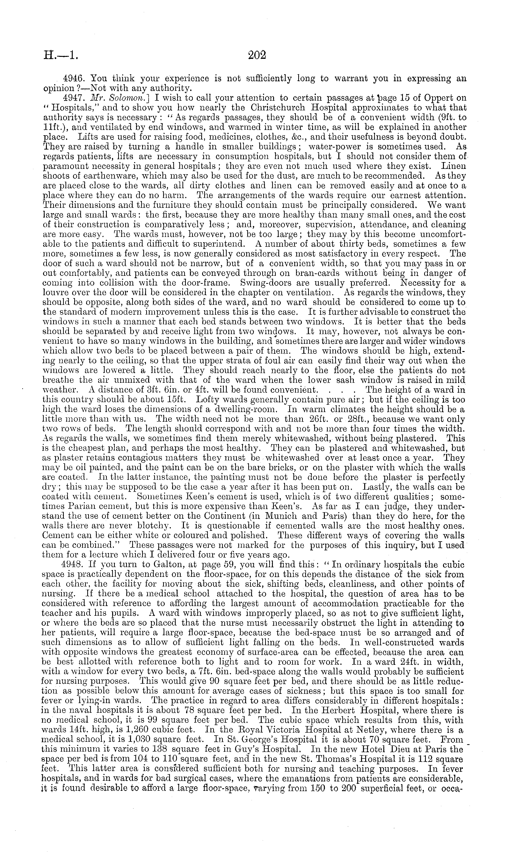 4946. You think your experience is not sufficiently long to warrant you in expressing an opinion ?—Not with any authority. 4947. Mr. Solomon.] I wish to call your attention to certain passages at }page 15 of Oppert on " Hospitals," and to show you how nearly the Christchurch Hospital approximates to what that authority says is necessary : " As regards passages, they should be of a convenient width (9ft. to lift.), and ventilated by end windows, and warmed in winter time, as will be explained in another place. Lifts are used for raising food, medicines, clothes, &c, and their usefulness is beyond doubt. They are raised by turning a handle in smaller buildings ; water-power is sometimes used. As regards patients, lifts are necessary in consumption hospitals, but I should not consider them of paramount necessity in general hospitals ; they are even not much used where they exist. Linen shoots of earthenware, which may also be used for the dust, are much to be recommended. As they are placed close to the wards, all dirty clothes and linen can be removed easily and at once to a place where they can do no harm. The arrangements of the wards require our earnest attention. Their dimensions and the furniture they should contain must be principally considered. We want large and small wards: the first, because they are more healthy than many small ones, and the cost of their construction is comparatively less ; and, moreover, supervision, attendance, and cleaning are more easy. The wards must, however, not be too large; they may by this become uncomfortable to the patients and difficult to superintend. A number of about thirty beds, sometimes a few more, sometimes a few less, is now generally considered as most satisfactory in every respect. The door of such a ward should not be narrow, but of a convenient width, so that you may pass in or out comfortably, and patients can be conveyed through on bran-cards without being in danger of coming into collision with the door-frame. Swing-doors are usually preferred. Necessity for a louvre over the door will be considered in the chapter on ventilation. As regards the windows, they should be opposite, along both sides of the ward, and no ward should be considered to come up to the standard of modern improvement unless this is the case. It is further advisable to construct the windows in such a manner that each bed stands between two windows. It is better that the beds should be separated by and receive light from two windows. It may, however, not always be convenient to have so many windows in the building, and 'sometimes there are larger and wider windows which allow two beds to be placed between a pair of them. The windows should be high, extending nearly to the ceiling, so that the upper strata of foul air can easily find their way out when the windows are lowered a little. They should reach nearly to the floor, else the patients do not breathe the air unmixed with that of the ward when the lower sash window is raised in mild weather. A distance of 3ft. 6in. or 4ft. will be found convenient. . . . The height of a ward in this country should be about 15ft. Lofty wards generally contain pure air; but if the ceiling is too high the ward loses the dimensions of a dwelling-room. In warm climates the height should be a little more than with us. The width need not be more than 26ft. or 28ft., because we want only two rows of beds. The length should correspond with and not be more than four times the width. As regards the walls, we sometimes find them merely whitewashed, without being plastered. This is the cheapest plan, and perhaps the most healthy. They can be plastered and whitewashed, but as plaster retains contagious matters they must be whitewashed over at least once a year. They may be oil painted, and the paint can be on the bare bricks, or on the plaster with which the walls are coated. In the latter instance, the painting must not be done before the plaster is perfectly dry; this may be supposed to be the case a year after it has been put on. Lastly, the walls can be coated with cement. Sometimes Keen's cement is used, which is of two different qualities ; sometimes Parian cement, but this is more expensive than Keen's. As far as I can judge, they understand the use of cement better on the Continent (in Munich and Paris) than they do here, for the walls there are never blotchy. It is questionable if cemented walls are the most healthy ones. Cement can be either white or coloured and polished. These different ways of covering the w ralls can be combined." These passages were not marked for the purposes of this inquiry, but I used them for a lecture which I delivered four or five years ago. 4948. If you turn to Galton, at page 59, you will find this : " In ordinary hospitals the cubic space is practically dependent on the floor-space, for on this depends the distance of the sick from each other, the facility for moving about the sick, shifting beds, cleanliness, and other points of nursing. If there be a medical school attached to the hospital, the question of area has to be considered with reference to affording the largest amount of accommodation practicable for the teacher and his pupils. A ward with windows improperly placed, so as not to give sufficient light, or where the beds are so placed that the nurse must necessarily obstruct the light in attending to her patients, will require a large floor-space, because the bed-space must be so arranged and of such dimensions as to allow of sufficient light falling on the beds. In well-constructed wards with opposite windows the greatest economy of surface-area can be effected, because the area can be best allotted with reference both to light and to room for work. In a w Tard 24ft. in width, with a window for every two beds, a 7ft. 6in. bed-space along the walls would probably be sufficient for nursing purposes. This would give 90 square feet per bed, and there should be as little reduction as possible 