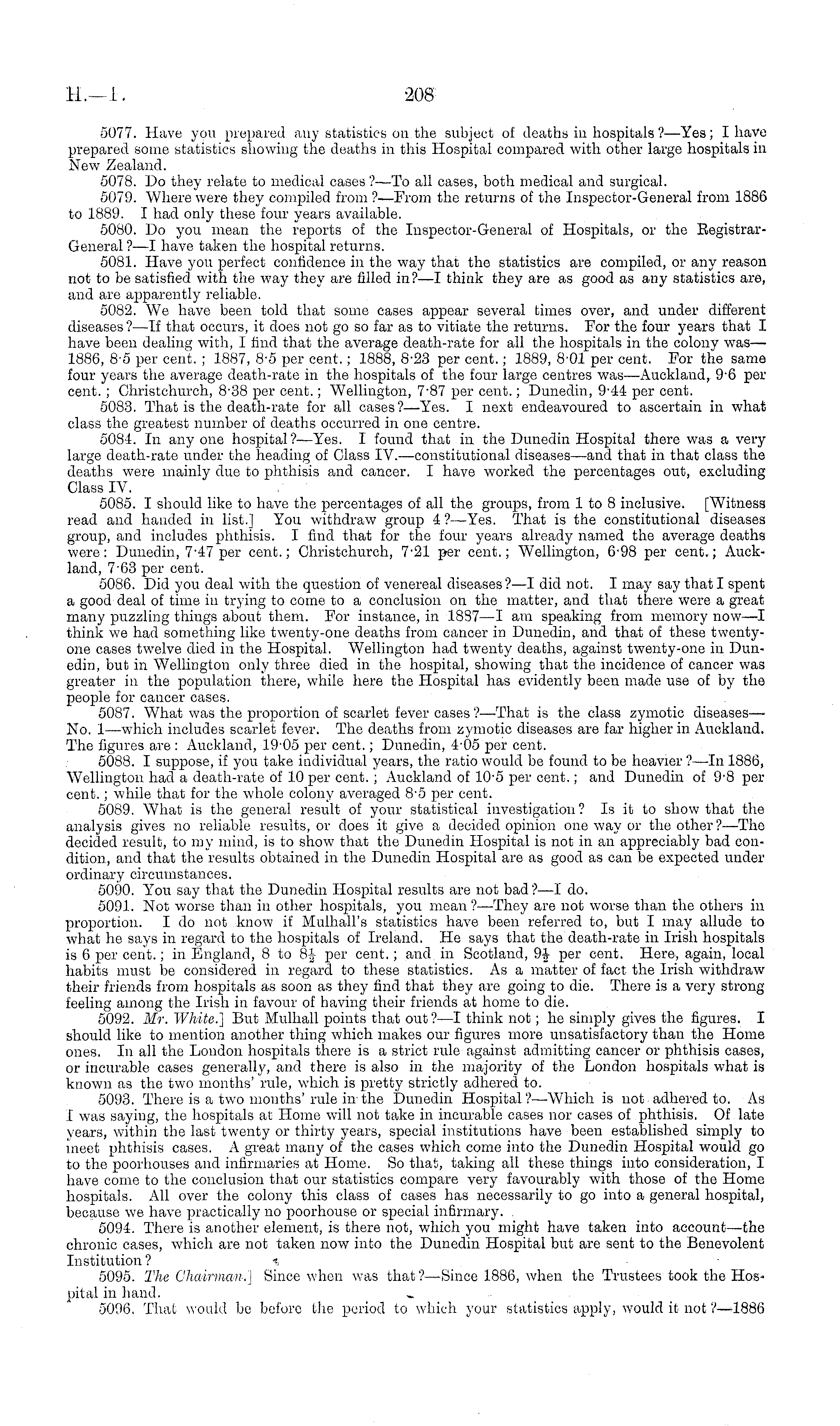 5077. Have you prepared auy statistics on the subject of deaths in hospitals ?—Yes; I have prepared some statistics showing the deaths in this Hospital compared with other large hospitals in New Zealand. 5078. Do they relate to medical cases'?—To all cases, both medical and surgical. 5079. Where were they compiled from ?—From the returns of the Inspector-General from 1886 to 1889. I had only these four years available. 5080. Do you mean the reports of the Inspector-General of Hospitals, or the EegistrarGeneral ?—I have taken the hospital returns. 5081. Have you perfect confidence in the way that the statistics are compiled, or any reason not to be satisfied with the way they are filled in?—l think they are as good as any statistics are, and are apparently reliable. 5082. We have been told that some cases appear several times over, and under different diseases?—lf that occurs, it does not go so far as to vitiate the returns. For the four years that I have been dealing with, I find that the average death-rate for all the hospitals in the colony was— 1886, 8-5 per cent. ; 1887, 8-5 per cent.; 1888, 8-23 per cent.; 1889, 8-01 per cent. For the same four years the average death-rate in the hospitals of the four large centres was—Auckland, 96 per cent. ; Christchurch, 8-38 per cent.; Wellington, 787 per cent.; Dunedin, 9-44 per cent. 5083. That is the death-rate for all cases?— Yes. I next endeavoured to ascertain in what class the greatest number of deaths occurred in one centre. 5084. In any one hospital ?—Yes. I found that in the Dunedin Hospital there was a very large death-rate under the heading of Class IV.—constitutional diseases—and that in that class the deaths were mainly due to phthisis and cancer. I have worked the percentages out, excluding Class IV. 5085. I should like to have the percentages of all the groups, from Ito 8 inclusive. [Witness read and handed in list.] You withdraw group 4 ? —Yes. That is the constitutional diseases group, and includes phthisis. I find that for the four years already named the average deaths were: Dunedin, 747 per cent.; Christchurch, 721 per cent.; Wellington, 698 per cent.; Auckland, 763 per cent. 5086. Did you deal with the question of venereal diseases? —I did not. I may say that I spent a good deal of time in trying to come to a conclusion on the matter, and that there were a great many puzzling things about them. For instance, in 1837 —I am speaking from memory now—l think we had something like twenty-one deaths from cancer in Duuedin, and that of these twentyone cases twelve died in the Hospital. Wellington had twenty deaths, against twenty-one in Dunedin, but in Wellington only three died in the hospital, showing that the incidence of cancer was greater in the population there, while here the Hospital has evidently been made use of by the people for cancer cases. 5087. What was the proportion of scarlet fever cases ?—That is the class zymotic diseases— No. I—which includes scarlet fever. The deaths from zymotic diseases are far higher in Auckland. The figures are : Auckland, 19-05 per cent.; Dunedin, 4-05 per cent. 5088. I suppose, if you take individual years, the ratio would be found to be heavier ? —ln 1886, Wellington had a death-rate of 10 per cent. ; Auckland of 10-5 per cent.; and Dunedin of 9-8 per cent.; while that for the whole colony averaged 8-5 per cent. 5089. What is the general result of your statistical investigation? Is it to show that the analysis gives no reliable results, or does it give a decided opinion one way or the other?— The decided result, to my mind, is to show that the Dunedin Hospital is not in an appreciably bad condition, and that the results obtained in the Dunedin Hospital are as good as can be expected under ordinary circumstances. 5090. You say that the Dunediu Hospital results are not bad ?— 1 do. 5091. Not worse than in other hospitals, you mean? —They are not worse than the others in proportion. Ido not know if Mulhall's statistics have been referred to, but I may allude to what he says in regard to the hospitals of Ireland. He says that the death-rate in Irish hospitals is 6 per cent.; in England, Bto 8J per cent.; and in Scotland, 9-J per cent. Here, again, local habits must be considered in regard to these statistics. As a matter of fact the Irish withdraw their friends from hospitals as soon as they find that they are going to die. There is a very strong feeling among the Irish in favour of having their friends at home to die. 5092. Mr. White.] But Mulhall points that out?—l think not; he simply gives the figures. I should like to mention another thing which makes our figures more unsatisfactory than the Home ones. In all the London hospitals there is a strict rule against admitting cancer or phthisis cases, or incurable cases generally, and there is also in the majority of the London hospitals what is known as the two months' rule, which is pretty strictly adhered to. 5093. There is a two mouths' rule in the Dunedin Hospital ?—Which is not adhered to. As 1 was saying, the hospitals at Home will not take in incurable cases nor cases of phthisis. Of late years, within the last twenty or thirty years, special institutions have been established simply to meet phthisis cases. A great many of the cases which come into the Dunedin Hospital would go to the poorhouses and infirmaries at Home. So that, taking all these things into consideration, I have come to the conclusion that our statistics compare very favourably with those of the Home hospitals. All over the colony this class of cases has necessarily to go into a general hospital, because we have practically no poorhouse or special infirmary. 5094. There is another element, is there not, which you might have taken into account—the chronic cases, which are not taken now into the Dunedin Hospital but are sent to the Benevolent Institution ? 5095. The Chairman.] Since when was that?— Since 1886, when