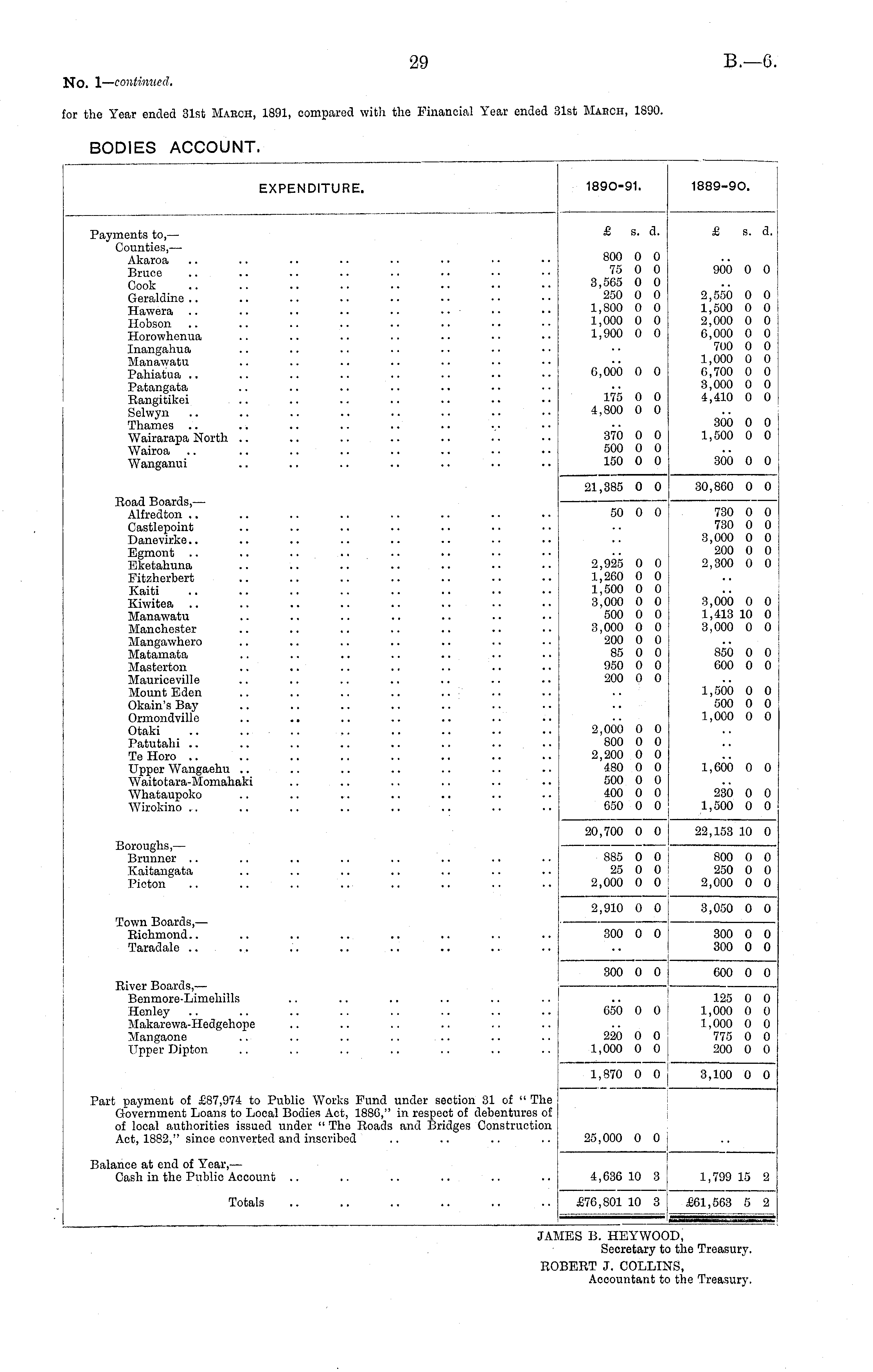 EXPENDITURE. 1890-91. 1889-90. Payments to, — Counties, — Akaroa Bruce Cook Geraldine .. Hawera .. .. .. .. ■ ■ Hobson Horowhenua Inangahua Manawatu Pahiatua Patangata Eangitikei Selwyn Thames Wairarapa North Wairoa Wanganui £ s. d. £ s. a. 800 0 0 75 0 0 3,565 0 0 250 0 0 1,800 0 0 1,000 0 0 1,900 0 0 900 0 0 2,550 0 0 1,500 0 0 2,000 0 0 6,000 0 0 700 0 0 1,000 0 0 6,700 0 0 3,000 0 0 4,410 0 0 6,000 0 0 175 0 0 4,800 0 0 370 0 0 500 0 0 150 0 0 300 0 0 1,500 0 0 300 0 0 Boad Boards, — Alfredton Castlepoint Danevirke.. Egmont .. .. .. .. Eketahuna Fitzherbert Kaiti Kiwitea Manawatu Manchester JIangawhero Matamata Masterton Mauriceville Mount Eden .. .. .. .. .. ■ Okain's Bay Ormondville .. .. Otaki Patutahi .. Te Horo Upper Wangaehu .. Waitotara-Momahaki Whataupoko Wirokino 21,385 0 0 50 0 0 2,925 0 0 1,260 0 0 1,500 0 0 3,000 0 0 500 0 0 3,000 0 0 200 0 0 85 0 0 950 0 0 200 0 0 30,860 0 0 730 0 0 730 0 0 3,000 0 0 200 0 0 2,300 0 0 3,000 0 0 1,413 10 0 3,000 0 0 850 0 0 600 0 0 1,500 0 0 500 0 0 1,000 0 0 2,000 0 0 800 0 0 2,200 0 0 480 0 0 500 0 0 400 0 0 650 0 0 1,600 0 0 230 0 0 1,500 0 0 Boroughs,— Brunner .. Kaitangata Pioton 20,700 0 0 885 0 0 25 0 0 2,000 0 0 22,153 10 0 800 0 0 250 0 0 2,000 0 0 Town Boards, — Richmond Taradale 2,910 0 0 300 0 0 3,050 0 0 300 0 0 300 0 0 River Boards, — Benmore-Limehills Henley Makarewa-Hedgehope Mangaone .. .. .. .. Upper Dipton 650 0 0 220 0 0 1,000 0 0 300 0 0 125 0 0 1,000 0 0 1,000 0 0 775 0 0 200 0 0 600 0 0 1,870 0 0 3,100 0 0 Part payment of £87,974 to Public Works Fund under section 31 of " The Government Loans to Local Bodies Act, 1886," in respect of debentures of of local authorities issued under " The Roads and Bridges Construction Act, 1882," since converted and inscribed 25,000 0 0 Balance at end of Year, — Cash in the Public Account 4,636 10 3 1,799 15 2 Totals £76,801 10 3 £61,563 5 2