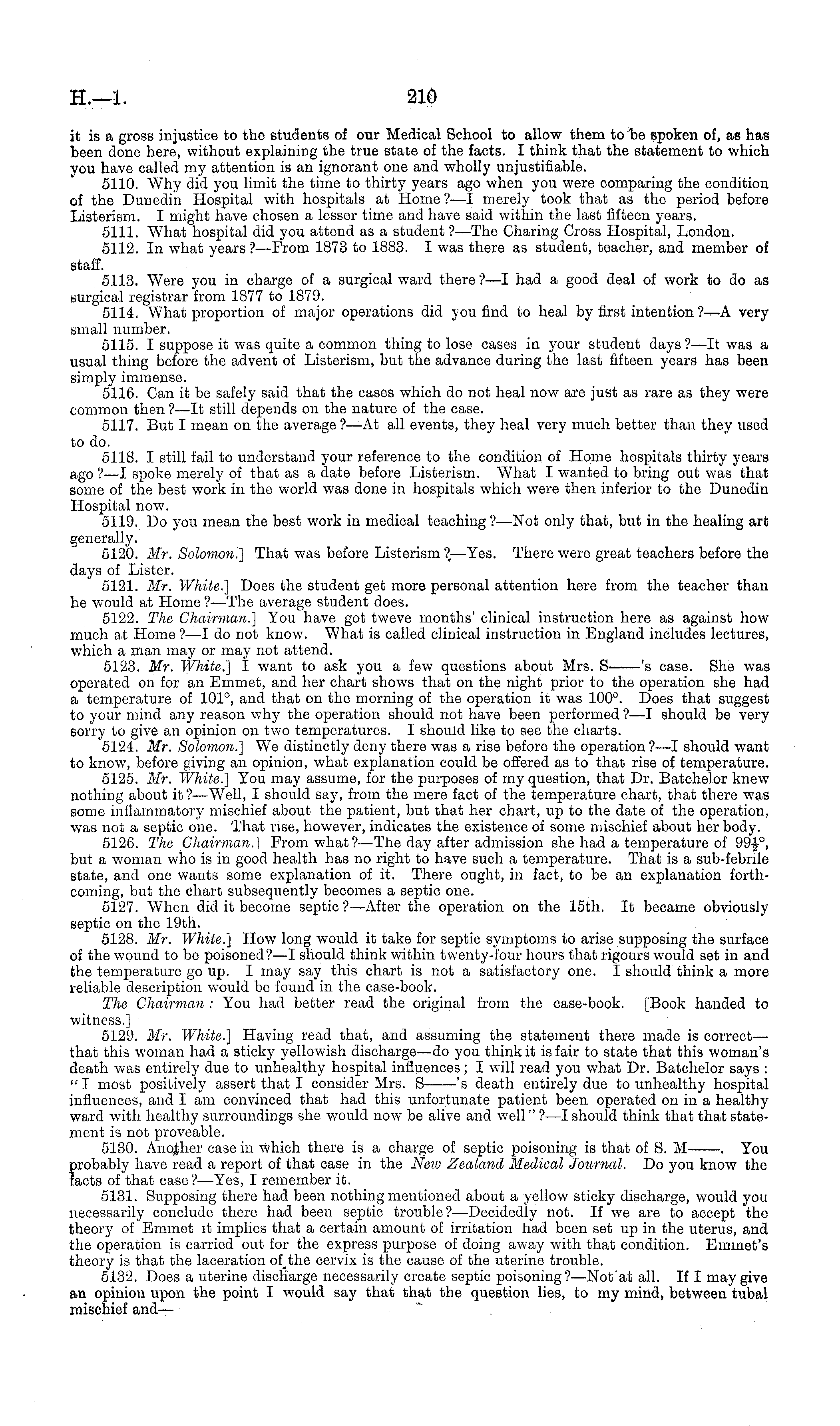 it is a gross injustice to the students of our Medical School to allow them to be spoken of, as has been done here, without explaining the true state of the facts. I think that the statement to which you have called my attention is an ignorant one and wholly unjustifiable. 5110. Why did you limit the time to thirty years ago when you were compariug the condition of the Dunedin Hospital with hospitals at Home?—l merely took that as the period before Listerism. I might have chosen a lesser time and have said within the last fifteen years. 5111. What hospital did you attend as a student ?—The Charing Cross Hospital, London. 5112. In what years ? —From 1873 to 1883. I was there as student, teacher, and member of staff. 5113. Were you in charge of a surgical ward there ?—I had a good deal of work to do as surgical registrar from 1877 to 1879. 5114. What proportion of major operations did you find to heal by first intention ?—A very small number. 5115. I suppose it was quite a common thing to lose cases in your student days ?—lt was a usual thing before the advent of Listerism, but the advance during the last fifteen years has been simply immense. 5116. Can it be safely said that the cases which do not heal now are just as rare as they were common then ?—lt still depends on the nature of the case. 5117. But I mean on the average ? —At all events, they heal very much better than they used to do. 5118. I still fail to understand your reference to the condition of Home hospitals thirty years ago ?—I spoke merely of that as a date before Listerism. What I wanted to bring out was that some of the best work in the world was done in hospitals which were then inferior to the Dunedin Hospital now. 5119. Do you mean the best work in medical teaching ?—Not only that, but in the healing art generally. 5120. Mr. Solomon.] That was before Listerism ?—Yes. There were great teachers before the days of Lister. 5121. Mr. White.] Does the student get more personal attention here from the teacher than he would at Home ?—The average student does. 5122. The Chairman.] You have got tweve months' clinical instruction here as against how much at Home ? —I do not know. What is called clinical instruction in England includes lectures, which a man may or may not attend. 5123. Mr. White.] I want to ask you a few questions about Mrs. S 's case. She was operated on for an Emmet, and her chart shows that on the night prior to the operation she had a temperature of 101°, and that on the morning of the operation it was 100°. Does that suggest to your mind any reason why the operation should not have been performed ?—I should be very sorry to give an opinion on two temperatures. I should like to see the charts. 5124. Mr. Solomon.] We distinctly deny there was a rise before the operation ?—I should want to know, before giving an opinion, what explanation could be offered as to that rise of temperature. 5125. Mr. White.] You may assume, for the purposes of my question, that Dr. Batchelor knew nothing about it ?—Well, I should say, from the mere fact of the temperature chart, that there was some inflammatory mischief about the patient, but that her chart, up to the date of the operation, was not a septic one. That rise, however, indicates the existence of some mischief about her body. 5126. The Chairman.] From what?— The day after admission she had a temperature of 99£°, but a woman who is in good health has no right to have such a temperature. That is a sub-febrile state, and one wants some explanation of it. There ought, in fact, to be an explanation forthcoming, but the chart subsequently becomes a septic one. 5127. When did it become septic? —After the operation on the 15th. It became obviously septic on the 19th. 5128. Mr. White.] How long would it take for septic symptoms to arise supposing the surface of the wound to be poisoned?—l should think within twenty-four hours that rigours would set in and the temperature go up. I may say this chart is not a satisfactory one. I should think a more reliable description would be found in the case-book. The Chairman : You had better read the original from the case-book. [Book handed to witness.] 5129. Mr. White.] Having read that, and assuming the statemeut there made is correct— that this woman had a sticky yellowish discharge—do you think it is fair to state that this woman's death was entirely due to unhealthy hospital influences; I will read you what Dr. Batchelor says : " I most positively assert that I consider Mrs. S 's death entirely due to unhealthy hospital influences, and I am convinced that had this unfortunate patient been operated on in a healthy ward with healthy surroundings she would now be alive and well" ?—I should think that that statement is not proveable. 5130. Another case in which there is a charge of septic poisoning is that of S. M . You probably have read a report of that case in the Neiv Zealand Medical Journal. Do you know the facts of that case?: —Yes, I remember it. 5131. Supposing there had been nothing mentioned about a yellow sticky discharge, would you necessarily conclude there had been septic trouble?— Decidedly not. If we are to accept the theory of Emmet it implies that a certain amount of irritation had been set up in the uterus, and the operation is carried out for the express purpose of doing away with that condition. Emmet's theory is that the laceration of the cervix is the cause of the uterine trouble. 5132. Does a uterine discharge necessarily create septic poisoning?—Not'at all. If I may give an opinion upon the point I would say that that the question lies, to my mind, between tubal mischief and—