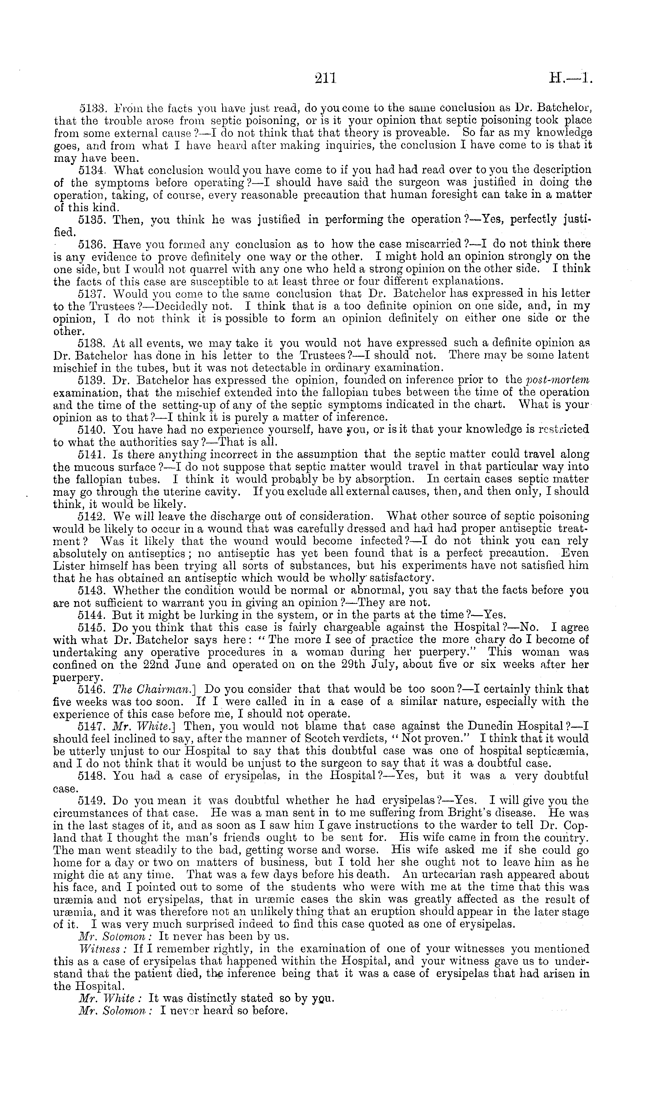■5133. From the facts you have just read, do you come to the same conclusion as Dr. Batehelor, that the trouble arose from septic poisoning, or is it your opinion that septic poisoning took place from some external cause ?—I do not think that that theory is proveable. So far as my knowledge goes, and from what I have heard after making inquiries, the conclusion I have come to is that it may have been. 5134. What conclusion would you have come to if you had had read over to you the description of the symptoms before operating ? —I should have said the surgeon was justified in doing the operation, taking, of course, every reasonable precaution that human foresight can take in a matter of this kind. 5135. Then, you think he was justified in performing the operation ?—Yes, perfectly justified. 5136. Have you formed any conclusion as to how the case miscarried ?—I do not think there is any evidence to prove definitely one way or the other. I might hold an opinion strongly on the one side, but I would not quarrel with any one who held a strong opinion on the other side. I think the facts of this ease are susceptible to at least three or four different explanations. 5137. Would you come to the same conclusion that Dr. Batchelor has expressed in his letter to the Trustees ?—Decidedly not. I think that is a too definite opinion on one side, and, in my opinion, T do not think it is possible to form an opinion definitely on either one side or the other. 5138. At all events, we may take it you would not have expressed such a definite opinion as Dr. Batchelor has done in his letter to the Trustees ?—I should not. There may be some latent mischief in the tubes, but it was not detectable in ordinary examination. 5139. Dr. Batchelor has expressed the opinion, founded on inference prior to the post-mortem examination, that the mischief extended into the fallopian tubes between the time of the operation and the time of the setting-up of any of the septic symptoms indicated in the chart. What is your opinion as to that ?—I think it is purely a matter of inference. 5140. You have had no experience yourself, have you, or is it that your knowledge is restricted to what the authorities say ? —That is all. 5141. Is there anything incorrect in the assumption that the septic matter could travel along the mucous surface ? —I do not suppose that septic matter would travel in that particular way into the fallopian tubes. 1 think it would probably be by absorption. In certain cases septic matter may go through the uterine cavity. If you exclude all external causes, then, and then only, I should think, it would be likely. 5142. We will leave the discharge out of consideration. What other source of septic poisoning would be likely to occur in a wound that was carefully dressed and had had proper antiseptic treatment ? Was it likely that the wound would become infected ?—I do not think you can rely absolutely on antiseptics ; no antiseptic has yet been found that is a perfect precaution. Even Lister himself has been trying all sorts of substances, but his experiments have not satisfied him that he has obtained an antiseptic which would be wholly satisfactory. 5143. Whether the condition would be normal or abnormal, you say that the facts before you are not sufficient to warrant you in giving an opinion ? —They are not. 5144. But it might be lurking in the system, or in the parts at the time?— Yes. 5145. Do you think that this case is fairly chargeable against the Hospital?— No. I agree with what Dr. Batchelor says here: " The more I see of practice the more chary do I become of undertaking any operative procedures in a woman during her puerpery." This woman was confined on the 22nd June and operated on on the 29th July, about five or six weeks after her puerpery. 5146. The Chairman.} Do you consider that that would be too soon?—I certainly think that five weeks was too soon. If I were called in in a case of a similar nature, especially with the experience of this case before me, I should not operate. 5147. Mr. White.} Then, you would not blame that case against the Dunedin Hospital ?—I should feel inclined to say, after the manner of Scotch verdicts, " Not proven." I think that it would be utterly unjust to our Hospital to say that this doubtful case was one of hospital septicaemia', and Ido not think that it would be unjust to the surgeon to say that it w Tas a doubtful case. 5148. You had a case of erysipelas, in the Hospital ?—Yes, but it was a very doubtful case. 5149. Do you mean it was doubtful whether he had erysipelas?— Yes. I will give you the circumstances of that case. He was a man sent in to me suffering from Bright's disease. He was in the last stages of it, and as soon as I saw him I gave instructions to the warder to tell Dr. Copland that I thought the man's friends ought to be sent for. His wife came in from the country. The man went steadily to the bad, getting worse and worse. His wife asked me if she could go home for a day or two on matters of business, but I told her she ought not to leave him as he might die at any time. That was a few days before his death. An urtecarian rash appeared about his face, and I pointed out to some of the students who were with me at the time that this was uraemia and not erysipelas, that in urssmic cases the skin was greatly affected as the result of uraemia, and it was therefore not an unlikely thing that an eruption should appear in the later stage of it. I was very much surprised indeed to find this case quoted as one of erysipelas. Mr. Solomon : It never has been by us. Witness : If I remember rightly, in the examination of one of your witnesses you mentioned this as a case of erysipelas that happened within the Hospital, and your witness gave us to understand that the patient died, the inference being that it was a case of erysipelas that had arisen in the Hospital. Mr. White : It was distinctly stated so by you. Mr. Solomon : I