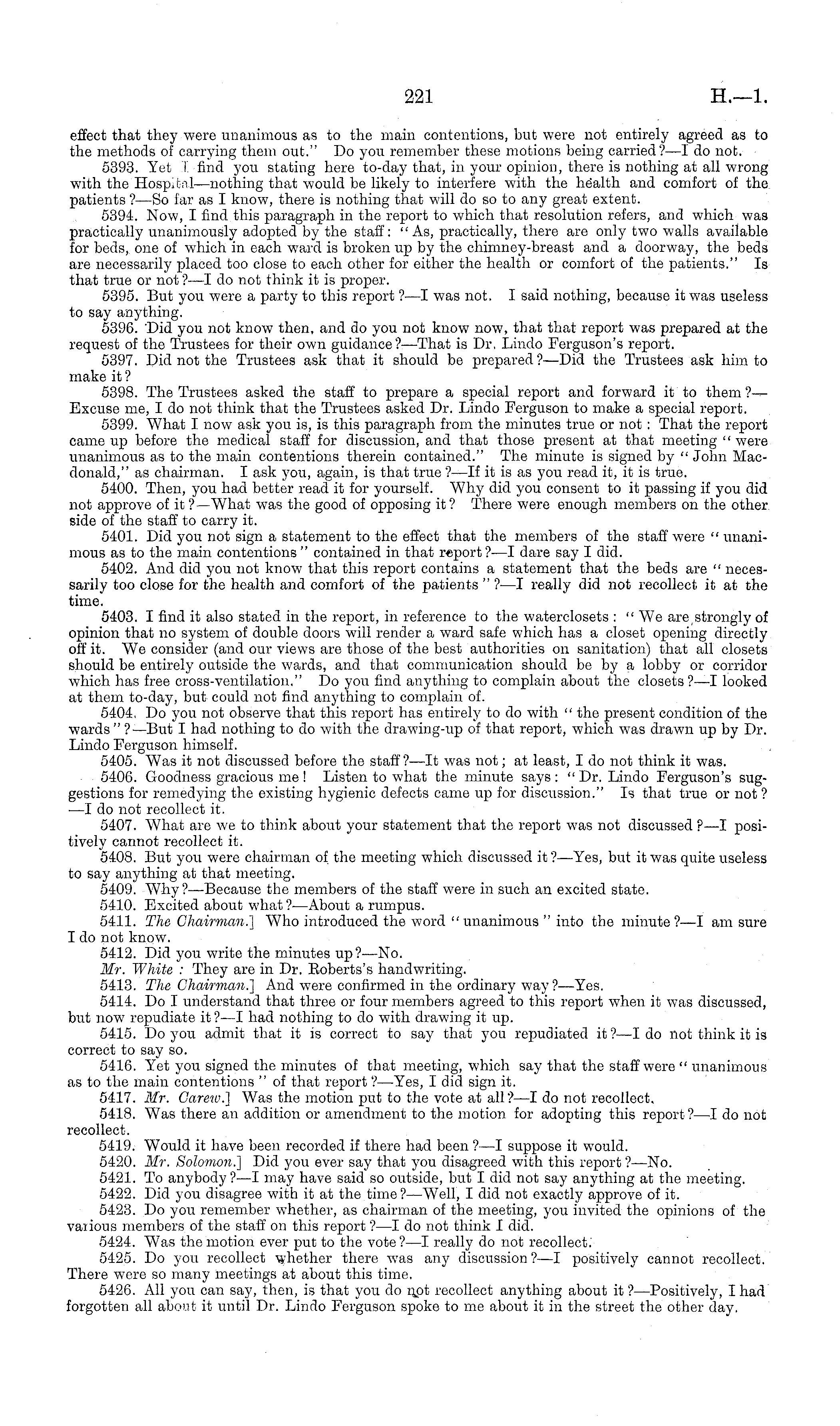 effect that they were unanimous as to the main contentions, but were not entirely agreed as to the methods of carrying them out." Do you remember these motions being carried?—l do not. 5393. Yet I find you stating here to-day that, in your opinion, there is nothing at all wrong with the Hospjrnl—nothing that would be likely to interfere with the health and comfort of the patients ?—So far as I know, there is nothing that will do so to any great extent. 5394. Now, I find this paragraph in the report to which that resolution refers, and which was practically unanimously adopted by the staff: "As, practically, there are only two walls available for beds, one of which in each ward is broken up by the chimney-breast and a doorway, the beds are necessarily placed too close to each other for either the health or comfort of the patients." Is that true or not ? —I do not think it is proper. 5395. But you were a party to this report ?—I was not. I said nothing, because it was useless to say anything. 5396. 'Did you not know then, and do you not know now, that that report was prepared at the request of the Trustees for their own guidance?— That is Dr, Lindo Ferguson's report. 5397. Did not the Trustees ask that it should be prepared?— Did the Trustees ask him to make it ? 5398. The Trustees asked the staff to prepare a special report and forward it to them ?-— Excuse me, I do not think that the Trustees asked Dr. Lindo Ferguson to make a special report. 5399. What I now ask you is, is this paragraph from the minutes true or not : That the report came up before the medical staff for discussion, and that those present at that meeting " were unanimous as to the main contentions therein contained." The minute is signed by " John Macdonald," as chairman. I ask you, again, is that true ?—lf it is as you read it, it is true. 5400. Then, you had better read it for yourself. Why did you consent to it passing if you did not approve of it ?— What was the good of opposing it? There were enough members on the other side of the staff to carry it. 5401. Did you not sign a statement to the effect that the members of the staff were " unanimous as to the main contentions " contained in that report? —I dare say I did. 5402. And did you not know that this report contains a statement that the beds are " necessarily too close for the health and comfort of the patients " ? —I really did not recollect it at the time. 5403. I find it also stated in the report, in reference to the waterclosets : " We are strongly of opinion that no system of double doors will render a ward safe which has a closet opening directly off it. We consider (and our views are those of the best authorities on sanitation) that all closets should be entirely outside the wards, and that communication should be by a lobby or corridor which has free cross-ventilation." Do you find anything to complain about the closets?—l looked at them to-day, but could not find anything to complain of. 5404. Do you not observe that this report has entirely to do with " the present condition of the wards " ? —But I had nothing to do with the drawing-up of that report, which was drawn up by Dr. Lindo Ferguson himself. 5405. Was it not discussed before the staff? —It was not; at least, Ido not think it was. 5406. Goodness gracious me ! Listen to what the minute says : " Dr. Lindo Ferguson's suggestions for remedying the existing hygienic defects came up for discussion." Is that true or not ? —I do not recollect it. 5407. What are we to think about your statement that the report was not discussed ? —I positively cannot recollect it. 5408. But you were chairman of the meeting which discussed it ?—Yes, but it was quite useless to say anything at that meeting. 5409. Why?— Because the members of the staff were in such an excited state. 5410. Excited about what?— About a rumpus. 5411. The Chairman.'] Who introduced the word " unanimous " into the minute?—l am sure I do not know. 5412. Did you write the minutes up?— No. Mr. White : They are in Dr. Eoberts's handwriting. 5413. The Chairman.] And were confirmed in the ordinary way?— Yes. 5414. Do I understand that three or four members agreed to this report when it was discussed, but now repudiate it ? —I had nothing to do with drawing it up. 5415. Do you admit that it is correct to say that you repudiated it?—l do not think it is correct to say so. 5416. Yet you signed the minutes of that meeting, which say that the staff were " unanimous as to the main contentions " of that report ?—Yes, I did sign it. 5417. Mr. Garew.] Was the motion put to the vote at all?—I do not recollect. 5418. Was there an addition or amendment to the motion for adopting this report ?—I do not recollect. 5419. Would it have been recorded if there had been ?—I suppose it would. 5420. Mr. Solomon.'] Did you ever say that you disagreed with this report ?—No. 5421. To anybody? —I may have said so outside, but I did not say anything at the meeting. 5422. Did you disagree with it at the time?— Well, I did not exactly approve of it. 5423. Do you remember whether, as chairman of the meeting, you invited the opinions of the various members of the staff on this report ? —I do not think I did. 5424. Was the motion ever put to the vote? —I really do not recollect. 5425. Do you recollect whether there was any discussion?—l positively cannot recollect. There were so many meetings at about this time. 5426. All you can say, then, is that you do not recollect anything about it ? —Positively, I had forgotten all about it until Dr. Lindo Ferguson spoke to me about it in the street the other day.