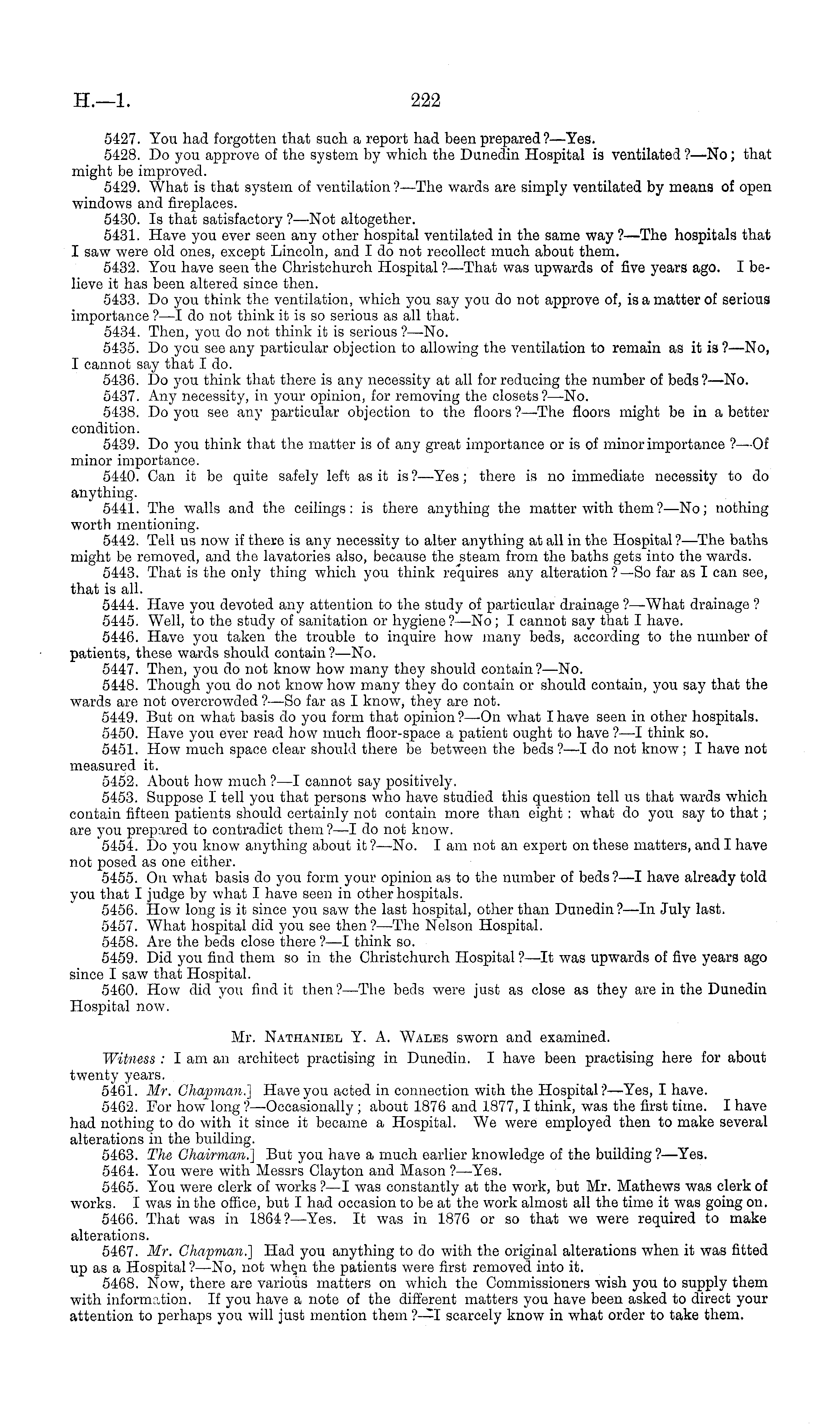 5427. You had forgotten that such a report had been prepared ?—Yes. 5428. Do you approve of the system by which the Dunedin Hospital is ventilated ?—No; that might be improved. 5429. What is that system of ventilation ?—The wards are simply ventilated by means of open windows and fireplaces. 5430. Is that satisfactory ? —Not altogether. 5431. Have you ever seen any other hospital ventilated in the same way ?—The hospitals that I saw were old ones, except Lincoln, and I do not recollect much about them. 5432. You have seen the Christchurch Hospital?— That was upwards of five years ago. I believe it has been altered since then. 5433. Do you think the ventilation, which you say you do not approve of, is a matter of serious importance ? —I do not think it is so serious as all that. 5434. Then, you do not think it is serious ?—No. 5435. Do you see any particular objection to allowing the ventilation to remain as it is ?—No, I cannot say that I do. 5436. Do you think that there is any necessity at all for reducing the number of beds ?—No. 5437. Any necessity, in your opinion, for removing the closets?— No. 5438. Do you see any particular objection to the floors ? —-The floors might be in a better condition. 5439. Do you think that the matter is of any great importance or is of minor importance ?—Of minor importance. 5440. Can it be quite safely left as it is ?—Yes; there is no immediate necessity to do anything. 5441. The walls and the ceilings: is there anything the matter with them?—No; nothing worth mentioning. 5442. Tell us now if there is any necessity to alter anything at all in the Hospital?— The baths might be removed, and the lavatories also, because the steam from the baths gets into the wards. 5443. That is the only thing which you think requires any alteration? —So far as I can see, that is all. 5444. Have you devoted any attention to the study of particular drainage ? —-What drainage ? 5445. Well, to the study of sanitation or hygiene?—No; I cannot say that I have. 5446. Have you taken the trouble to inquire how many beds, according to the number of patients, these wards should contain? —No. 5447. Then, you do not know how many they should contain?— No. 5448. Though you do not know how many they do contain or should contain, you say that the wards are not overcrowded ?—So far as I know, they are not. 5449. But on what basis do you form that opinion?—On what I have seen in other hospitals. 5450. Have you ever read how much floor-space a patient ought to have ?—I think so. 5451. How much space clear should there be between the beds ?—I do not know ; I have not measured it. 5452. About how much? —I cannot say positively. 5453. Suppose I tell you that persons who have studied this question tell us that wards which contain fifteen patients should certainly not contain more than eight : what do you say to that; are you prepared to contradict them ?—I do not know. 5454. Do you know anything about it ?—No. I am not an expert on these matters, and I have not posed as one either. 5455. On what basis do you form your opinion as to the number of beds ?—I have already told you that I judge by what I have seen in other hospitals. 5456. How long is it since you saw the last hospital, other than Dunedin ?—ln July last. 5457. What hospital did you see then?— The Nelson Hospital. 5458. Are the beds close there ?—I think so. 5459. Did you find them so in the Ohristehurch Hospital ?—lt was upwards of five years ago since I saw that Hospital. 5460. How did you find it then ?—The beds were just as close as they are in the Dunedin Hospital now. Mr. Nathaniel Y. A. Wales sworn and examined. Witness : lam an architect practising in Dunedin. I have been practising here for about twenty years. 5461. Mr. Chapman.} Have you acted in connection with the Hospital?— Yes, I have. 5462. For how long ?—Occasionally ; about 1876 and 1877,1 think, was the first time. I have had nothing to do with it since it became a Hospital. We were employed then to make several alterations in the building. 5463. The Chairman.] But you have a much earlier knowledge of the building ?—Yes. 5464. You were with Messrs Clayton and Mason ? —Yes. 5465. You were clerk of works ?—I was constantly at the work, but Mr. Mathews was clerk of works. I was in the office, but I had occasion to be at the work almost all the time it was going on. 5466. That was in 1864? —Yes. It was in 1876 or so that we were required to make alterations. 5467. Mr. Chapman.] Had you anything to do with the original alterations when it was fitted up as a Hospital?—No, not when the patients were first removed into it. 5468. Now, there are various matters on which the Commissioners wish you to supply them with information. If you have a note of the different matters you have been asked to direct your attention to perhaps you will just mention them ?—I scarcely know in what order to take them.