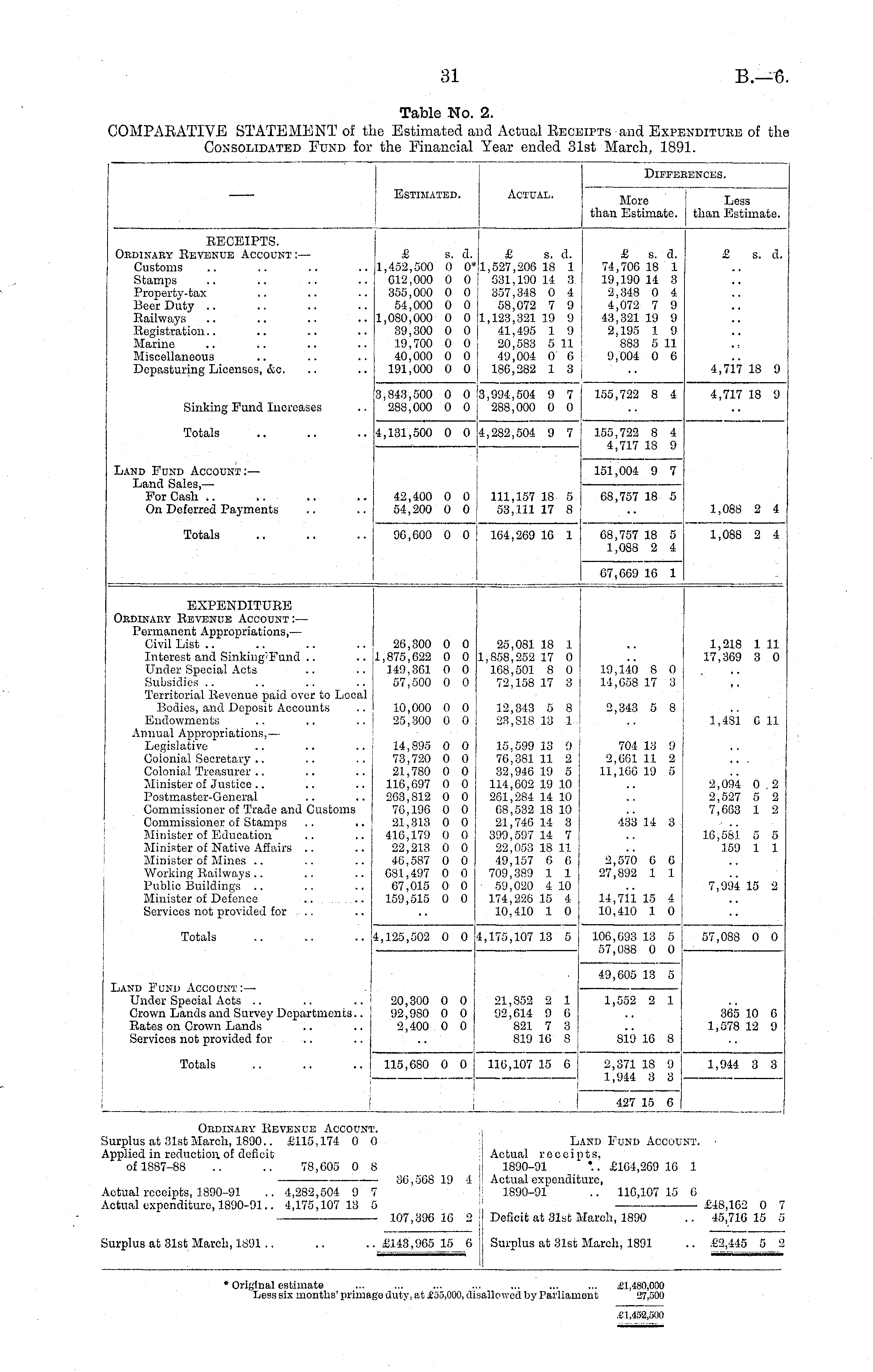 DlFFEBENCES. Estimated. Actual. More Less than Estimate, than Estimate. BECEIPTS. Okdinaby Bevenue Account:— Customs Stamps Property-tax Beer Duty Railways Begistration.. Marine Miscellaneous Depasturing Licenses, &c. £ s. d. 1,452,500 0 0* 612,000 0 0 355,000 0 0 54,000 0 0 1,080,000 0 0 39,300 0 0 19,700 0 0 40,000 0 0 191,000 0 0 £ s. d. 1,527,206 18 1 i 631,190 14 3 357,348 0 4 58,072 7 9 1,123,321 19 9 41,495 1 9 20,583 5 11 49,004 0 6 186,282 1 3 £ s. d. 74,706 18 1 19,190 14 3 2,348 0 4 4,072 7 9 43,321 19 9 2,195 1 9 883 5 11 9,004 0 6 £ s. d. 4,717 18 9 Sinking Fund Increases 3,843,500 0 0 ! 288,000 0 0 3,994,504 9 7 288,000 0 0 155,722 8 4 4,717 18 9 Totals 4,131,500 0 0 ! 4,282,504 9 7 155,722 8 4 4,717 18 9 151,004 9 7 Land Fond Account :— Land Sales, — For Cash .. On Deferred Payments 42,400 0 0 54,200 0 0 111,157 IS 5 53,111 17 8 68,757 18 5 1,088 2 4 Totals 90,600 0 0 164,269 10 1 68,757 18 5 1,088 2 4 1,088 2 4 07,669 16 1 EXPENDITUBE Obdinaby Bevenue Account: — Permanent Appropriations,— Civil List Interest and Sinking'Fund Under Special Acts Subsidies Territorial Bevenue paid over to Local Bodies, and Deposit Accounts Endowments Annual Appropriations,— Legislative Colonial Secretary Colonial Treasurer Minister of Justice Postmaster-General Commissioner of Trade and Customs Commissioner of Stamps Minister of Education Minister of Native Affairs Minister of Mines Working Kailways Public Buildings Minister of Defence Services not provided for 26,300 0 0 1,875,622 0 0 149,361 0 0 57,500 0 0 10,000 0 0 25,300 0 0 14,895 0 0 73,720 0 0 21,780 0 0 116,697 0 0 263,812 0 0 70,196 0 0 21,813 0 0 416,179 0 0 22,213 0 0 46,587 0 0 681,497 0 0 67,015 0 0 159,515 0 0 25,081 18 1 1,858,252 17 0 168,501 8 0 72,158 17 3 12,843 5 S 23,818 13 1 15,599 13 9 76,381 11 2 32,940 19 5 114,002 19 10 261,284 14 10 68,532 18 10 21,746 14 3 399,597 14 7 22,053 18 11 49,157 6 6 709,389 1 1 59,020 4 10 174,226 15 4 10,410 1 0 19,140 8 0 14,058 17 3 2,343 5 8 704 13 9 2,661 11 2 11,160 19 5 1,218 1 11 17,309 3 0 1,481 0 11 2,094 0 2 2,527 5 2 7,063 1 2 433 14 3 16,881 5 5 159 1 1 2,570 6 6 27,892 1 1 7,094 15 2 14,711 15 4 10,410 1 0 Totals 4,125,502 0 0 4,175,107 13 5 106,093 13 5 57,088 0 0 57,088 0 0 Land Pond Account:— Under Special Acts Crown Lands and Survey Departments.. Bates on Crown Lands Services not provided for 20,300 0 0 92,980 0 0 2,400 0 0 21,852 2 1 92,614 9 6 821 7 8 819 16 8 49,605 13 5 1,552 2 1 365 10 6 1,578 12 9 819 16 8 Totals .. .. .. 115,680 0 0 Totals 110,107 15 6 2,371 18 9 1,944 3 3 1,944 3 3 I _ I L 427 15 6 Obdumbt Revenue Account. Surplus at 31st March, 1890.. £115,174 0 0 Obdinaby Revenue Accoun iurplus at 31st March, 1890.. £115,174 0 Lpplied in reduction of deficit of 1887-88 .. .. 78,605 0 Land Fund Account. Actual receipts, 1890-91 '.. £104,269 Iβ 1 AnnlinrI in rnrlnntinn nF rlnfinifi Actual recci 1890-91 Actual expendi 1890-91 of 1887-88 .. .. 78,605 0 8 8 SO,568 19 4 Actual reoeipts, 1890-91 .. 4,282,504 9 7 Actual expenditure, 1890-91.. 4,175,107 13 5 107,396 16 2 ! Actual expenditure, 1890-91 .. 110,107 15 0 Deficit at 31st March, 1890 Surplus at 31st March, 1891 £48,162 0 7 45,71(5 15 5 £2,445 5_2 iurplus at 31st March, 1891.. .. £143^905_15_ 6