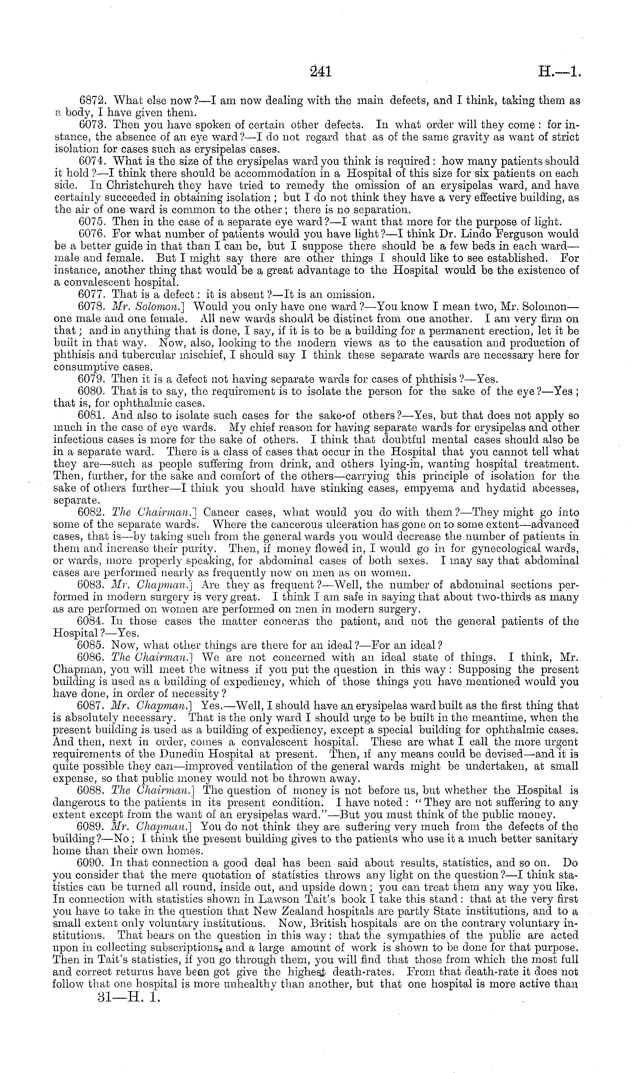 6872. What else now ?—I am now dealing with the main defects, and I think, taking them as a body, I have given them. 6073. Then you have spoken of certain other defects. In what order will they come : for instance, the absence of an eye ward ?—I do not regard that as of the same gravity as want of strict isolation for cases such as erysipelas cases. 6074. What is the size of the erysipelas ward you think is required : how many patients should it hold ?—I think there should be accommodation in a Hospital of this size for six patients on each side. In Christchurch they have tried to remedy the omission of an erysipelas ward, and have certainly succeeded in obtaining isolation ; but I do not think they have a very effective building, as the air of one ward is common to the other; there is no separation. 6075. Then in the case of a separate eye ward?—l want that more for the purpose of light. 6076. For what number of patients would you have light ?—I think Dr. Lindo Ferguson would be a better guide in that than I can be, but I suppose there should be a few beds in each ward— male and female. But I might say there are other things I should like to see established. For instance, another thing that would be a great advantage to the Hospital would be the existence of a convalescent hospital. 6077. That is a defect: it is absent ?—lt is an omission. 6078. Mr. Solomon.] Would you only have one ward ?—You know I mean two, Mr. Solomon— one male and one female. All new wards should be distinct from one another. lam very firm on that; and in anything that is done, I say, if it is to be a building for a permanent erection, let it be built in that way. Now, also, looking to the modern views as to the causation and production of phthisis and tubercular mischief, I should say I think these separate wards are necessary here for consumptive cases. 6079. Then it is a defect not having separate wards for cases of phthisis?— Yes. 6080. That is to say, the requirement is to isolate the person for the sake of the eye ?—Yes ; that is, for ophthalmic cases. 6081. And also to isolate such cases for the sake-of others?—-Yes, but that does not apply so much in the case of eye wards. My chief reason for having separate wards for erysipelas and other infectious cases is more for the sake of others. I think that doubtful mental cases should also be in a separate ward. There is a class of cases that occur in the Hospital that you cannot tell what they are —such as people suffering from drink, and others lying-in, wanting hospital treatment. Then, further, for the sake and comfort of the others—carrying this principle of isolation for the sake of others further—l think you should have stinking cases, empyema and hydatid abcesses, separate. 6082. The Chairman.'] Cancer cases, what would you do with them?— They might go into some of the separate wards. Where the cancerous ulceration has gone on to some extent—advanced cases, that is—by taking such from the general wards you would decrease the number of patients in them and increase their purity. Then, if money flowed in, I would go in for gynecological wards, or wards, more properly speaking, for abdominal cases of both sexes. I may say that abdominal cases are performed nearly as frequently now on men as on women. 6083. Mr. Chapman.'] Are they as frequent ?— Well, the number of abdominal sections performed in modern surgery is very great. I think lam safe in saying that about two-thirds as many as are performed on women are performed on men in modern surgery. 6084. In those cases the matter concerns the patient, and not the general patients of the Hospital ?—Yes. 6085. Now, what other things are there for an ideal?— For an ideal? 6086. The Chairman.] We are not concerned with an ideal state of things. I think, Mr. Chapman, you will meet the witness if you put the question in this way : Supposing the present building is used as a building of expediency, which of those things you have mentioned would you have done, in order of necessity ? 6087. Mr. Chapman.] Yes.—Well, I should have an erysipelas ward built as the first thing that is absolutely necessary. That is the only ward I should urge to be built in the meantime, when the present building is used as a building of expediency, except a special building for ophthalmic cases. And then, next in order, comes a convalescent hospital. These are what I call the more urgent requirements of the Dunedin Hospital at present. Then, if any means could be devised—and it is quite possible they can —improved ventilation of the general wards might be undertaken, at small expense, so that public money would not be thrown away. 6088. The Chairman.] The question of money is not before us, but whether the Hospital is dangerous to the patients in its present condition. I have noted : " They are not suffering to any extent except from the want of an erysipelas ward."—But you must think of the public money. 6089. Mr. Chapman.'] You do not think they are suffering very much from the defects of the building? —No ; I think the present building gives to the patients who use it a much better sanitary home than their own homes. 6090. In that connection a good deal has been said about results, statistics, and so on. Do you consider that the mere quotation of statistics throws any light on the question ?—I think statistics can be turned all round, inside out, and upside down; you can treat them any way you like. In connection with statistics shown in Lawson Tait's book I take this stand : that at the very first you have to take in the question that New Zealand hospitals are partly State institutions, and to a small extent only voluntary institutions. Now, British hospitals are on the contrary voluntary institutions. That bears on the question in this way: that the sympathies of the public are acted upon in collecting subscriptions*, and a large amount of work is shown to be done for that purpose. Th