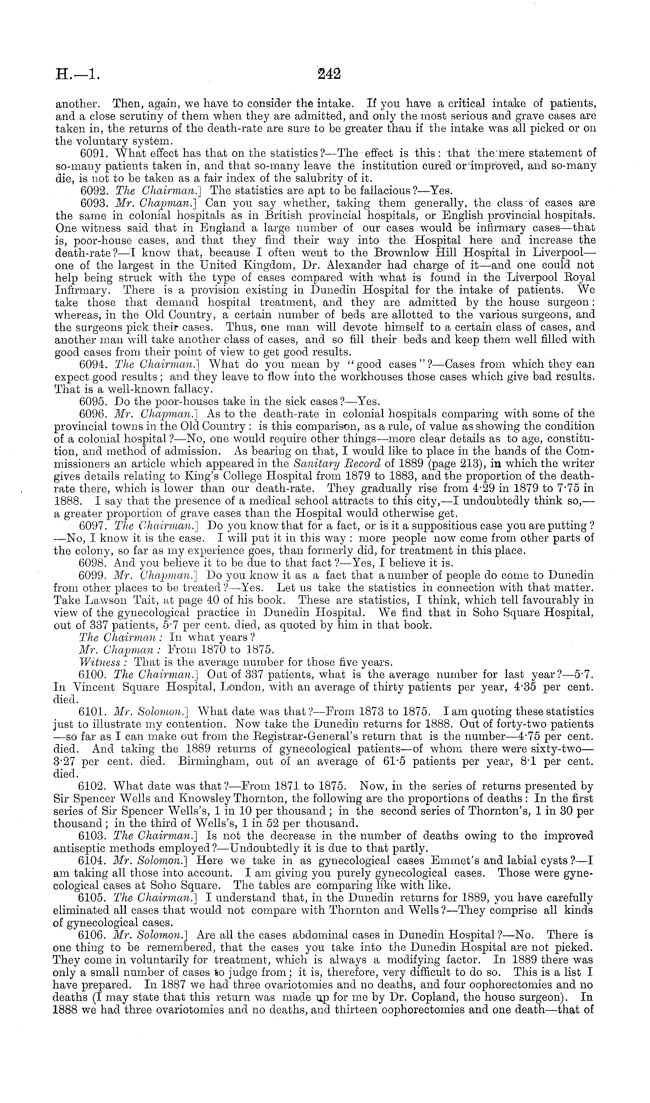 another. Then, again, we have to consider the intake. If you have a critical intake of patients, and a close scrutiny of them when they are admitted, and only the most serious and grave cases are taken in, the returns of the death-rate are sure to be greater than if the intake was all picked or on the voluntary system. 6091. What effect has that on the statistics?— The effect is this : that the mere statement of so-many patients taken in, and that so-many leave the institution cured or improved, and so-many die, is not to be taken as a fair index of the salubrity of it. 6092. The Chairman."] The statistics are apt to be fallacious ?—Yes. 6093. Mr. Chapman.'] Can you say whether, taking them generally, the class of cases are the same in colonial hospitals as in British provincial hospitals, or English provincial hospitals. One witness said that in England a large number of our cases would be infirmary cases —that is, poor-house cases, and that they find their way into the Hospital here and increase the death-rate? —I know that, because I often went to the Brownlow Hill Hospital in Liverpool— one of the largest in the United Kingdom, Dr. Alexander had charge of it—and one could not help being struck with the type of cases compared with what is found in the Liverpool Eoyal Infirmary. There is a provision existing in Dunedin Hospital for the intake of patients. We take those that demand hospital treatment, and they are admitted by the house surgeon: whereas, in the Old Country, a certain number of beds are allotted to the various surgeons, and the surgeons pick their cases. Thus, one man will devote himself to a certain class of cases, and another man will take another class of cases, and so fill their beds and keep them well filled with good cases from their point of view to get good results. 6094. The Chairman.] What do you mean by "good cases"? —Cases from which they can expect good results; and they leave to flow into the workhouses those cases which give bad results. That is a well-known fallacy. 6095. Do the poor-houses take in the sick cases?— Yes. 6096. Mr. Chapman.] As to the death-rate in colonial hospitals comparing with some of the provincial towns in the Old Country : is this comparison, as a rule, of value as showing the condition of a colonial hospital ? —No, one would require other things—more clear details as to age, constitution, and method of admission. As bearing on that, I would like to place in the hands of the Commissioners an article which appeared in the Sanitary Becord of 1889 (page 213), in which the writer gives details relating to King's College Hospital from 1879 to 1883, and the proportion of the deathrate there, which is lower than our death-rate. They gradually rise from 4-29 in 1879 to 775 in 1888. I say that the presence of a medical school attracts to this city, —I undoubtedly think so, — a greater proportion of grave cases than the Hospital would otherwise get. 6097. The Chairman.] Do you know that for a fact, or is it a suppositious case you are putting ? —No, I know it is the case. I will put it in this way : more people now come from other parts of the colony, so far as my experience goes, than formerly did, for treatment in this place. 6098. And you believe it to be due to that fact ?—Yes, I believe it is. 6099. Mr. Chapman.] Do you know it as a fact that a number of people do come to Dunedin from other places to be treated ?—Yes. Let us take the statistics in connection with that matter. Take Lawson Tait, at page 40 of his book. These are statistics, I think, which tell favourably in view of the gynecological practice in Dunedin Hospital. We find that in Soho Square Hospital, out of 337 patients, 5-7 per cent, died, as quoted by him in that book. The Chairman : In what years ? Mr. Chapman : IVom 1870 to 1875. Witness : That is the average number for those five years. 6100. The Chairman.] Out of 337 patients, what is the average number for last year? —5-7. In Vincent Square Hospital, London, with an average of thirty patients per year, 4-35 per cent, died. 6101. Mr. Solomon.] What date was that ?—From 1873 to 1875. lam quoting these statistics just to illustrate my contention. Now take the Dunedin returns for 1888. Out of forty-two patients —so far as I can make out from the Eegistrar-General's return that is the number—4-75 per cent, died. And taking the 1889 returns of gynecological patients —of whom there were sixty-two — 3-27 per cent. died. Birmingham, out of an average of 61-5 patients per year, B'l per cent, died. 6102. What date was that?— Prom 1871 to 1875. Now, in the series of returns presented by Sir Spencer Wells and Knowsley Thornton, the following are the proportions of deaths: In the first series of Sir Spencer Wells's, 1 in 10 per thousand ; in the second series of Thornton's, 1 in 30 per thousand; in the third of Wells's, lin 52 per thousand. 6103. The Chairman.] Is not the decrease in the number of deaths owing to the improved antiseptic methods employed ?—Undoubtedly it is due to that partly. 6104. Mr. Solomon.] Here we take in as gynecological cases Emmet's and labial cysts ?—I am taking all those into account. lam giving you purely gynecological cases. Those were gynecological cases at Soho Square. The tables are comparing like with like. 6105. The Chairman.] I understand that, in the Dunedin returns for 1889, you have carefully eliminated all cases that would not compare with Thornton and Wells ? —They comprise all kinds of gynecological cases. 6106. Mr. Solomon.] Are all the cases abdominal cases in Dunedin Hospital ?—No. There is one thing to be remembered, that the cases you take into the Dunedin Hospital are not picked. They come in voluntarily for treatment, which is always a modifying factor. In 1889 there was only a small number of cases to judge from ; it is, therefore, very difficult to do so. This is a list I have prepared. In 1887 we had three ovariotomies and no dea
