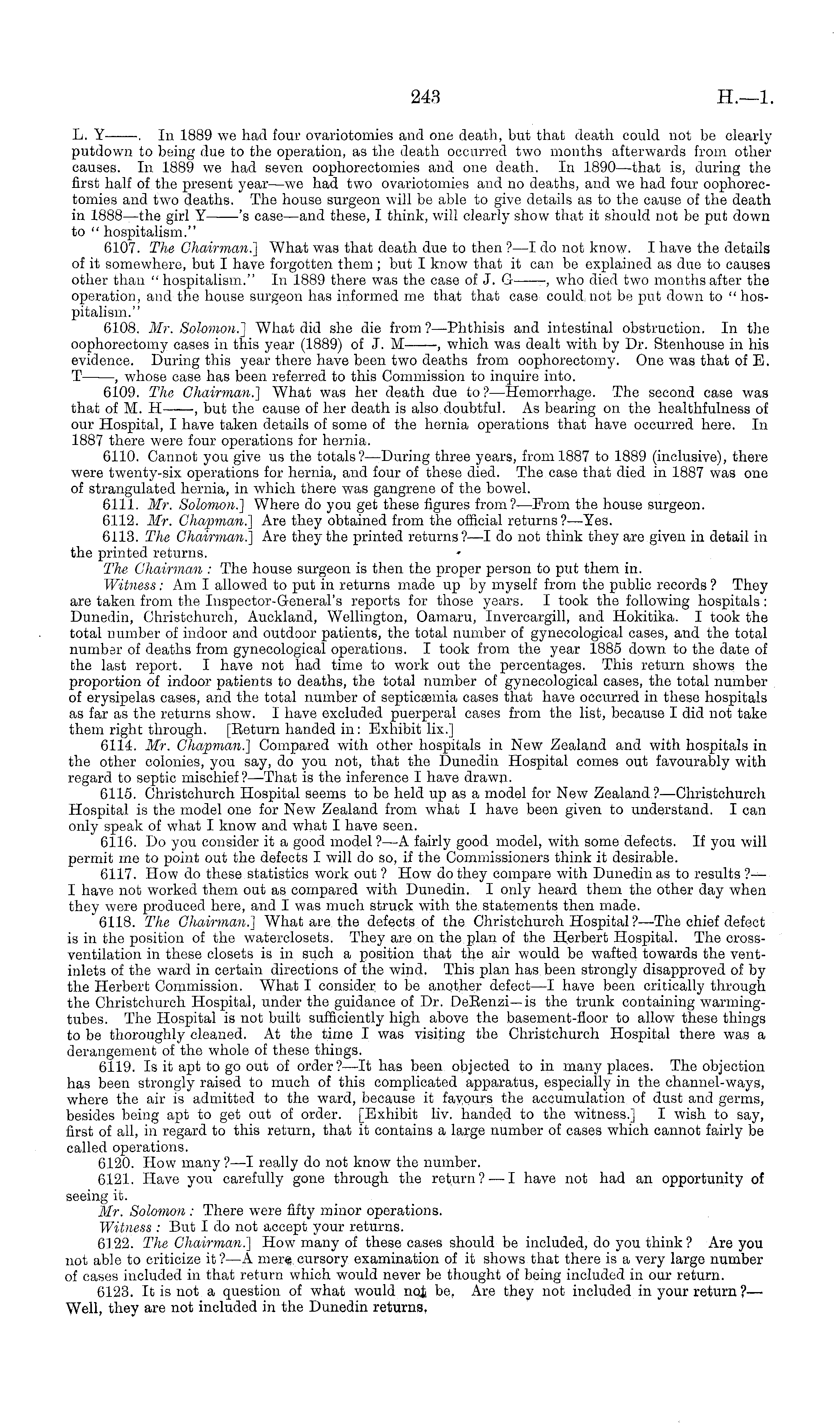 L. V . In 1889 we had four ovariotomies and one death, but that death could not be clearly putdown to being due to the operation, as the death occurred two months afterwards from other causes. In 1889 we had seven oophorectomies and one death. In 1890—that is, during the first half of the present year —we had two ovariotomies and no deaths, and we had four oophorectomies and two deaths. The house surgeon will be able to give details as to the cause of the death in 1888—the girl V 'sease —and these, I think, will clearly show that it should not be put down to " hospitalism." 6107. The Chairman.] "What was that death due to then ?—I do not know. I have the details of it somewhere, but I have forgotten them ; but I know that it can be explained as due to causes other than " hospitalism." In 1889 there was the case of J. G , who died two months after the operation, and the house surgeon has informed me that that case could not be put down to "hospitalism." 6108. Mr. Solomon.~\ What did she die from ?—Phthisis and intestinal obstruction. In the oophorectomy cases in this year (1889) of J. M , which was dealt with by Dr. Stenhouse in his evidence. During this year there have been two deaths from oophorectomy. One was that of E. T , whose case has been referred to this Commission to inquire into. 6109. The Chairman.] What was her death due to? —Hemorrhage. The second case was that of M. H , but the cause of her death is also doubtful. As bearing on the healthfulness of our Hospital, I have taken details of some of the hernia operations that have occurred here. In 1887 there were four operations for hernia. 6110. Cannot you give us the totals?— During three years, from 1887 to 1889 (inclusive), there were twenty-six operations for hernia, and four of these died. The case that died in 1887 was one of strangulated hernia, in which there was gangrene of the bowel. 6111. Mr. Solomon.] Where do you get these figures from?— Prom the house surgeon. 6112. Mr. Chapman.] Are they obtained from the official returns ?—Yes. 6113. The Chairman.] Are they the printed returns ?—I do not think they are given in detail in the printed returns. The Chairman : The house surgeon is then the proper person to put them in. Witness: Am I allowed to put in returns made up by myself from the public records ? They are taken from the Inspector-General's reports for those years. I took the following hospitals : Dunedin, Christchurch, Auckland, Wellington, Oamaru, Invercargill, and Hokitika. I took the total number of indoor and outdoor patients, the total number of gynecological cases, and the total number of deaths from gynecological operations. I took from the year 1885 down to the date of the last report. I have not had time to work out the percentages. This return shows the proportion of indoor patients to deaths, the total number of gynecological cases, the total number of erysipelas cases, and the total number of septicaemia cases that have occurred in these hospitals as far as the returns show. I have excluded puerperal cases from the list, because I did not take them right through. [Return handed in: Exhibit lix.] 6114. Mr. Chapman.] Compared with other hospitals in New Zealand and with hospitals in the other colonies, you say, do you not, that the Dunedin Hospital comes out favourably with regard to septic mischief? —That is the inference I have drawn. 6115. Christchurch Hospital seems to be held up as a model for New Zealand?—Christchurch Hospital is the model one for New Zealand from what I have been given to understand. I can only speak of what I know and what I have seen. 6116. Do you consider it a good model ?—A fairly good model, with some defects. If you will permit me to point out the defects I will do so, if the Commissioners think it desirable. 6117. How do these statistics work out ? How do they compare with Dunedin as to results ?— I have not worked them out as compared with Dunedin. I only heard them the other day when they were produced here, and I was much struck with the statements then made. 6118. The Chairman.] What are the defects of the Christchurch Hospital ?—-The chief defect is in the position of the waterclosets. They are on the plan of the Herbert Hospital. The crossventilation in these closets is in such a position that the air would be wafted towards the ventinlets of the ward in certain directions of the wind. This plan has been strongly disapproved of by the Herbert Commission. What I consider to be another defect—l have been critically through the Christchurch Hospital, under the guidance of Dr. Deßenzi—is the trunk containing warmingtubes. The Hospital is not built sufficiently high above the basement-floor to allow these things to be thoroughly cleaned. At the time I was visiting the Christchurch Hospital there was a derangement of the whole of these things. 6119. Is it apt to go out of order?—lt has been objected to in many places. The objection has been strongly raised to much of this complicated apparatus, especially in the channel-ways, where the air is admitted to the ward, because it favours the accumulation of dust and germs, besides being apt to get out of order. [Exhibit liv. handed to the witness.] I wish to say, first of all, in regard to this return, that it contains a large number of cases which cannot fairly be called operations. 6120. How many ?—I really do not know the number. 6121. Have you carefully gone through the return? — I have not had an opportunity of seeing it. Mr. Solomon : There were fifty minor operations. Witness : But I do not accept your returns. 6122. The Chairman.] How many of these cases should be included, do you think? Are you not able to criticize it ? —A mere cursory examination of it shows that there is a very large number of cases included in that return which would never be thought of being included in our return. 6123. It is not a question of what would noj be. Are they not included in your return ?