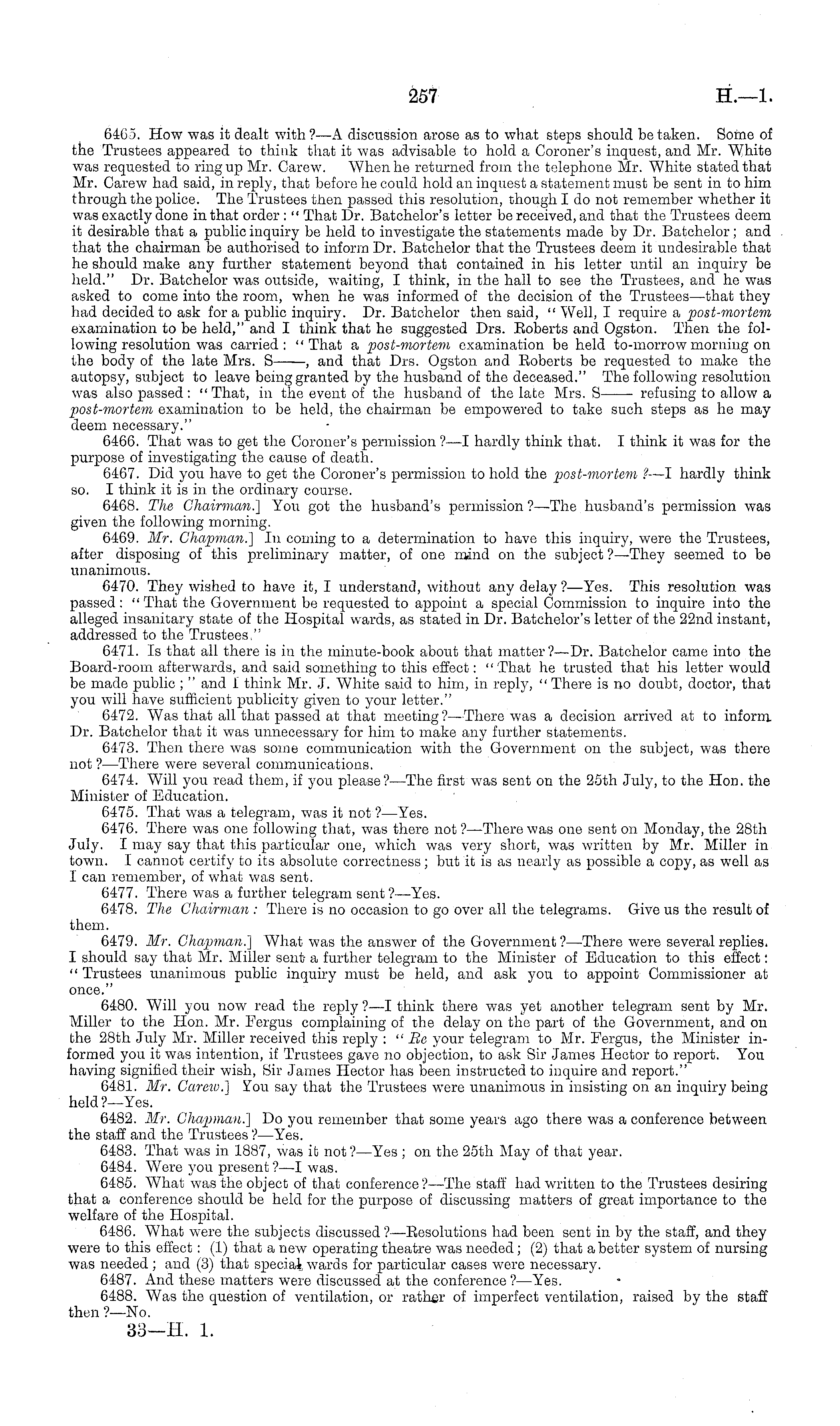 6465. How was it dealt with?—A discussion arose as to what steps should he taken. Some of the Trustees appeared to think that it was advisable to hold a Coroner's inquest, and Mr. White was requested to ring up Mr. Carew. When he returned from the telephone Mr. White stated that Mr. Carew had said, in reply, that before he could hold an inquest a statement must be sent in to him through the police. The Trustees then passed this resolution, though Ido not remember whether it was exactly done in that order : " That Dr. Batchelor's letter be received, and that the Trustees deem it desirable that a public inquiry be held to investigate the statements made by Dr. Batchelor ; and that the chairman be authorised to inform Dr. Batchelor that the Trustees deem it undesirable that he should make any further statement beyond that contained in hia letter until an inquiry be held." Dr. Batchelor was outside, waiting, I think, in the hall to see the Trustees, and he was asked to come into the room, when he was informed of the decision of the Trustees—that they had decided to ask for a public inquiry. Dr. Batchelor then said, " Well, I require a post-mortem examination to be held," and I think that he suggested Drs. Eoberts and Ogston. Then the following resolution was carried: "That a post-mortem examination be held to-morrow morning on the body of the late Mrs. S , and that Drs. Ogston and Eoberts be requested to make the autopsy, subject to leave being granted by the husband of the deceased." The following resolution was also passed : "That, in the event of the husband of the late Mrs. S refusing to allow a post-mortem examination to be held, the chairman be empowered to take such steps as he may deem necessary." 6466. That was to get the Coroner's permission ?—I hardly think that. I think it was for the purpose of investigating the cause of death. 6467. Did you have to get the Coroner's permission to hold the post-mortem ? —■I hardly think so. I think it is in the ordinary course. 6468. The Chairman.] You got the husband's permission ?—The husband's permission was given the following morning. 6469. Mr. Chapman.'] In coming to a determination to have this inquiry, were the Trustees, after disposing of this preliminary matter, of one mind on the subject ?—They seemed to be unanimous. 6470. They wished to have it, I understand, without any delay?— Yes. This resolution was passed : " That the Government be requested to appoint a special Commission to inquire into the alleged insanitary state of the Hospital wards, as stated in Dr. Batchelor's letter of the 22nd instant, addressed to the Trustees," 6471. Is that all there is in the minute-book about that matter? —Dr. Batchelor came into the Board-room afterwards, and said something to this effect: " That he trusted that his letter would be made public ; " and 1 think Mr. J. White said to him, in reply, " There is no doubt, doctor, that you will have sufficient publicity given to your letter." 6472. Was that all that passed at that meeting?— There was a decision arrived at to inform Dr. Batchelor that it was unnecessary for him to make any further statements. 6473. Then there was some communication with the Government on the subject, was there not ? —There were several communications. 6474. Will you read them, if you please?— The first was sent on the 25th July, to the Hon. the Minister of Education. 6475. That was a telegram, was it not ?—Yes. 6476. There was one following that, was there not ?—There was one sent on Monday, the 28th July. I may say that this particular one, which was very short, was written by Mr. Miller in town. I cannot certify to its absolute correctness; hut it is as nearly as possible a copy, as well as I can remember, of what was sent. 6477. There was a further telegram sent?— Yes. 6478. The Chairman : There is no occasion to go over all the telegrams. Give us the result of them. 6479. Mr. Chapman.] What was the answer of the Government? —There were several replies. I should say that Mr. Miller sent a further telegram to the Minister of Education to this effect: " Trustees unanimous public inquiry must be held, and ask you to appoint Commissioner at once." 6480. Will you now read the reply ?—I think there was yet another telegram sent by Mr. Miller to the Hon. Mr. Eergus complaining of the delay on the part of the Government, and on the 28th July Mr. Miller received this reply : " Be your telegram to Mr. Fergus, the Minister informed you it was intention, if Trustees gave no objection, to ask Sir James Hector to report. You having signified their wish, Sir James Hector has been instructed to inquire and report." 6481. Mr. Garew.] You say that the Trustees were unanimous in insisting on an inquiry being held?— Yes. 6482. Mr. Chapman.] Do you remember that some years ago there was a conference between the staff and the Trustees ?—Yes. 6483. That was in 1887, was it not ?—Yes ; on the 25th May of that year. 6484. Were you present ?—I was. 6485. What was the object of that conference ? —The staff had written to the Trustees desiring that a conference should be held for the purpose of discussing matters of great importance to the welfare of the Hospital. 6486. What were the subjects discussed ?—Eesolutions had been sent in by the staff, and they were to this effect: (1) that a new operating theatre was needed; (2) that a better system of nursing was needed ; and (3) that special, wards for particular cases were necessary. 6487. And these matters were discussed at the conference ? —Yes. 6488. Was the question of ventilation, or rather of imperfect ventilation, raised by the staff then ? —No. 33— H. 1.