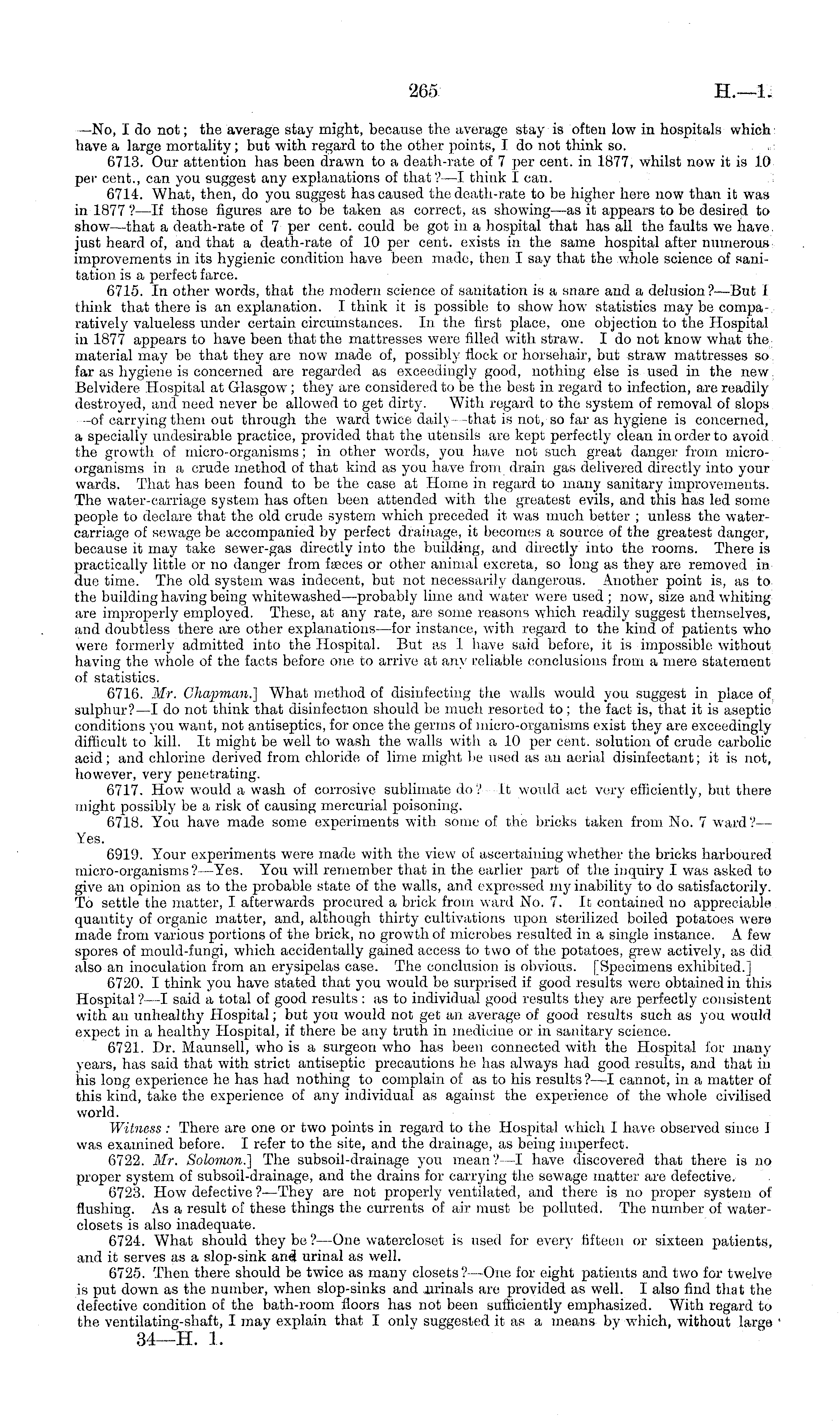 —No, Ido not; the average stay might, because the average stay is often low in hospitals which have a large mortality; but with regard to the other points, I do not think so. „: 6713. Our attention has been drawn to a death-rate of 7 per cent, in 1877, whilst now it is 10 per cent., can you suggest any explanations of that?—l think 1 can. 6714. What, then, do you suggest has caused the death-rate to be higher here now than it was in 1877 ?—lf those figures are to be taken as correct, as showing—as it appears to be desired to show—that a death-rate of 7 per cent, could be got in a hospital that has all the faults we have, just heard of, and that a death-rate of 10 per cent, exists in the same hospital after numerous improvements in its hygienic condition have been made, then I say that the whole science of sanitation is a perfect farce. 6715. In other words, that the modern science of sanitation is a snare and a delusion?— But 1 think that there is an explanation. I think it is possible to show how statistics may be comparatively valueless under certain circumstances. In the first place, one objection to the Hospital in 1877 appears to have been that the mattresses were filled with straw. I do not know what the material may be that they are now made of, possibly flock or horsehair, but straw mattresses so far as hygiene is concerned are regarded as exceedingly good, nothing else is used in the new. Belvidere Hospital at Glasgow; they are considered to be the best in regard to infection, are readily destroyed, and need never be allowed to get dirty. With regard to the system of removal of slops —of carrying them out through the ward twice daily -that is not, so far as hygiene is concerned, a specially undesirable practice, provided that the utensils are kept perfectly clean in order to avoid the growth of micro-organisms; in other words, you have not such great danger from microorganisms in a crude method of that kind as you have from drain gas delivered directly into your wards. That has been found to be the case at Home in regard to many sanitary improvements. The water-carriage system has often been attended with the greatest evils, and this has led some people to declare that the old crude system which preceded it was much better ; unless the watercarriage of sewage be accompanied by perfect drainage, it becomes a source of the greatest danger, because it may take sewer-gas directly into the building, and directly into the rooms. There is practically little or no danger from fasces or other animal excreta, so long as they are removed in due time. The old system was indecent, but not necessarily dangerous. Another point is, as to the building having being whitewashed —probably lime and water were used ; now, size and whiting are improperly employed. These, at any rate, are some reasons which readily suggest themselves, and doubtless there are other explanations —for instance, with regard to the kind of patients who were formerly admitted into the Hospital. But as I have said before, it is impossible without having the whole of the facts before one to arrive at any reliable conclusions from a mere statement of statistics. 6716. Mr. Chapman,'] What method of disinfecting the walls would you suggest in place, of. sulphur?—l do not think that disinfection should be much, resorted to; the fact is, that it is aseptic conditions you want, not antiseptics, for once the germs of micro-organisms exist they are exceedingly difficult to kill. It might be well to wash the walls with alO per cent, solution of crude carbolic acid; and chlorine derived from chloride of lime might be used as tin aerial disinfectant; it is not, however, very penetrating. 6717. How would a wash of corrosive sublimate do? Lt would act very efficiently, but there might possibly be a risk of causing mercurial poisoning. 6718. You have made some experiments with some of the bricks taken from No. 7 ward?— Yes. 6919. Your experiments were made with the view of ascertaining whether the bricks harboured micro-organisms? —Yes. You will remember that in the earlier part of the inquiry I was asked to give an opinion as to the probable state of the walls, and expressed my inability to do satisfactorily. To settle the matter, I afterwards procured a brick from ward No. 7. It contained no appreciable quantity of organic matter, and, although thirty cultivations upon sterilized boiled potatoes were made from various portions of the brick, no growth of microbes resulted in a single instance. A few spores of mould-fungi, which accidentally gained access to two of the potatoes, grew actively, as did also an inoculation from an erysipelas case. The conclusion is obvious. [ Specimens exhibited.] 6720. I think you have stated that you would be surprised if good results were obtained in this Hospital ?—I said a total of good results :as to individual good results they are perfectly consistent with an unhealthy Hospital; but you would not get an average of good results such as you would expect in a healthy Hospital, if there be any truth in medicine or in sanitary science. 6721. Dr. Maunsell, who is a surgeon who has been connected with the Hospital for many years, has said that with strict antiseptic precautions he has always had good results, and that in his long experience he has had nothing to complain of as to his results?—l cannot, in a matter of this kind, take the experience of any individual as against the experience of the whole civilised world. Witness : There are one or two points in regard to the Hospital which I have observed since J was examined before. I refer to the site, and the drainage, as being imperfect. 6722. Mr. Solomon.'] The subsoil-drainage you mean?—l have discovered that there is no proper system of subsoil-drainage, and the drains for carrying the sewage matter are defective. 6723. How defective ? —They are not properly ventilated, and there is no proper system of flushing. As a re