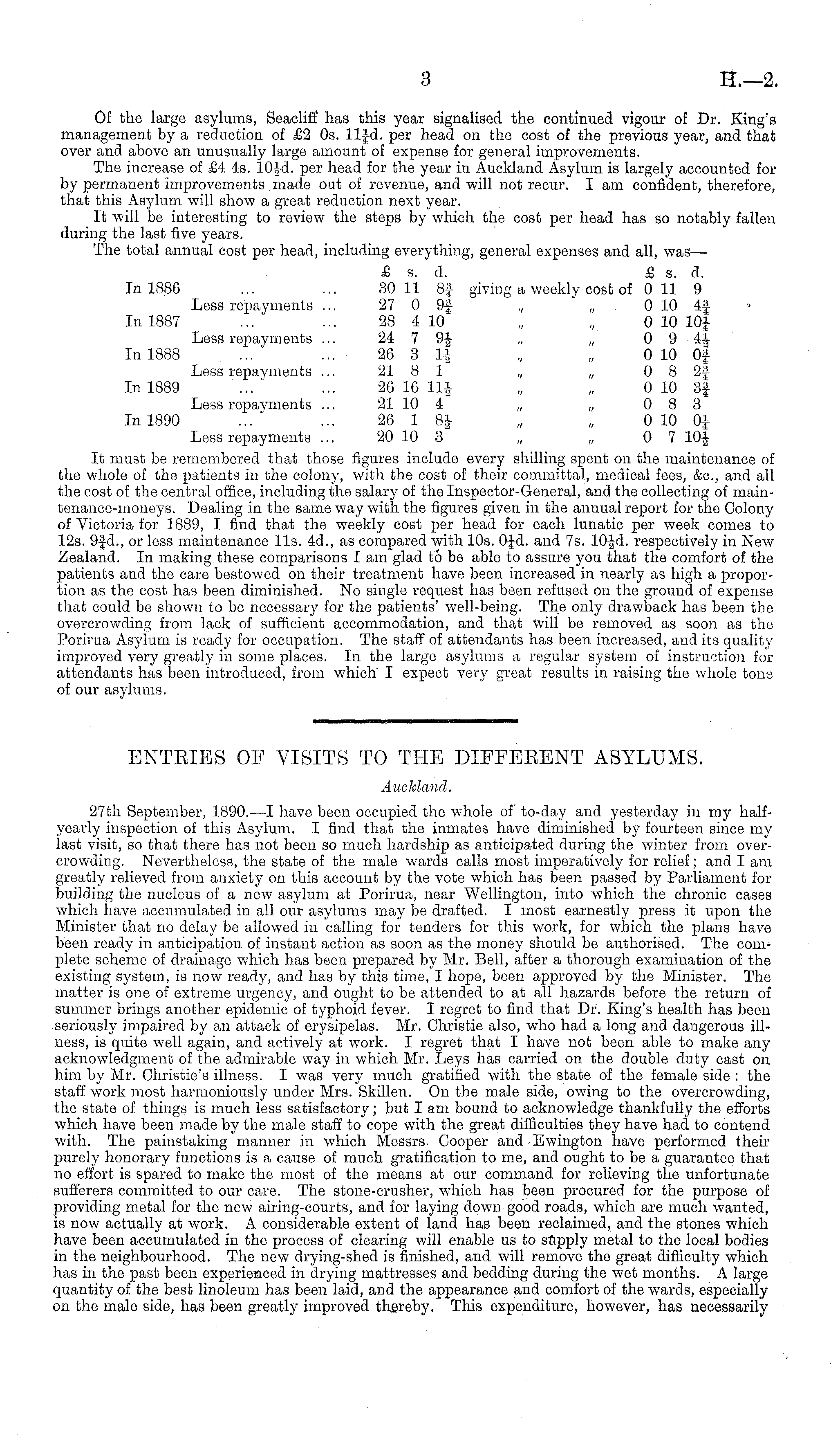 ENTRIES OP VISITS TO THE DIFFERENT ASYLUMS. Auckland. 27th September, 1890.—1 have been occupied the whole of to-day and yesterday in my halfyearly inspection of this Asylum. I find that the inmates have diminished by fourteen since my last visit, so that there has not been so much hardship as anticipated during the winter from overcrowding. Nevertheless, the state of the male wards calls most imperatively for relief; and lam greatly relieved from anxiety on this account by the vote which has been passed by Parliament for building the nucleus of a neAv asylum at Porirua, near Wellington, into which the chronic cases Avhich have accumulated in all our asylums may be drafted. I most earnestly press it upon the Minister that no delay be alloAved in calling for tenders for this work, for which the plans have been ready in anticipation of instant action as soon as the money should be authorised. The complete scheme of drainage which has been prepared by Mr. Bell, after a thorough examination of the existing system, is now ready, and has by this time, I hope, been approved by the Minister. The matter is one of extreme urgency, and ought to be attended to at all hazards before the return of summer brings another epidemic of typhoid fever. I regret to find that Dr. King's health has been seriously impaired by an attack of erysipelas. Mr. Christie also, who had a long and dangerous illness, is quite well again, and actively at work. I regret that I have not been able to make any acknowledgment of the admirable Avay in which Mr. Leys has carried on the double duty cast on him by Mr. Christie's illness. I Avas very much gratified with the state of the female side : the staff work most harmoniously under Mrs. Skillen. On the male side, owing to the overcrowding, the state of things is much less satisfactory; but lam bound to acknovvdedge thankfully the efforts Avhich have been made by the male staff to cope Avith the great difficulties they have had to contend with. The painstaking manner in which Messrs. Cooper and Ewington have performed their purely honorary functions is a cause of much gratification to me, and ought to be a guarantee that no effort is spared to make the most of the means at our command for relieving the unfortunate sufferers committed to our care. The stone-crusher, which has been procured for the purpose of providing metal for the new airing-courts, and for laying down good roads, Avhich are much wanted, is now actually at work. A considerable extent of land has been reclaimed, and the stones which have been accumulated in the process of clearing will enable us to supply metal to the local bodies in the neighbourhood. The new drying-shed is finished, and will remove the great difficulty which has in the past been experienced in drying mattresses and bedding during the wet months. A large quantity of the best linoleum has been laid, and the appearance and comfort of the wards, especially on the male side, has been greatly improved thereby. This expenditure, liOAvever, has necessarily