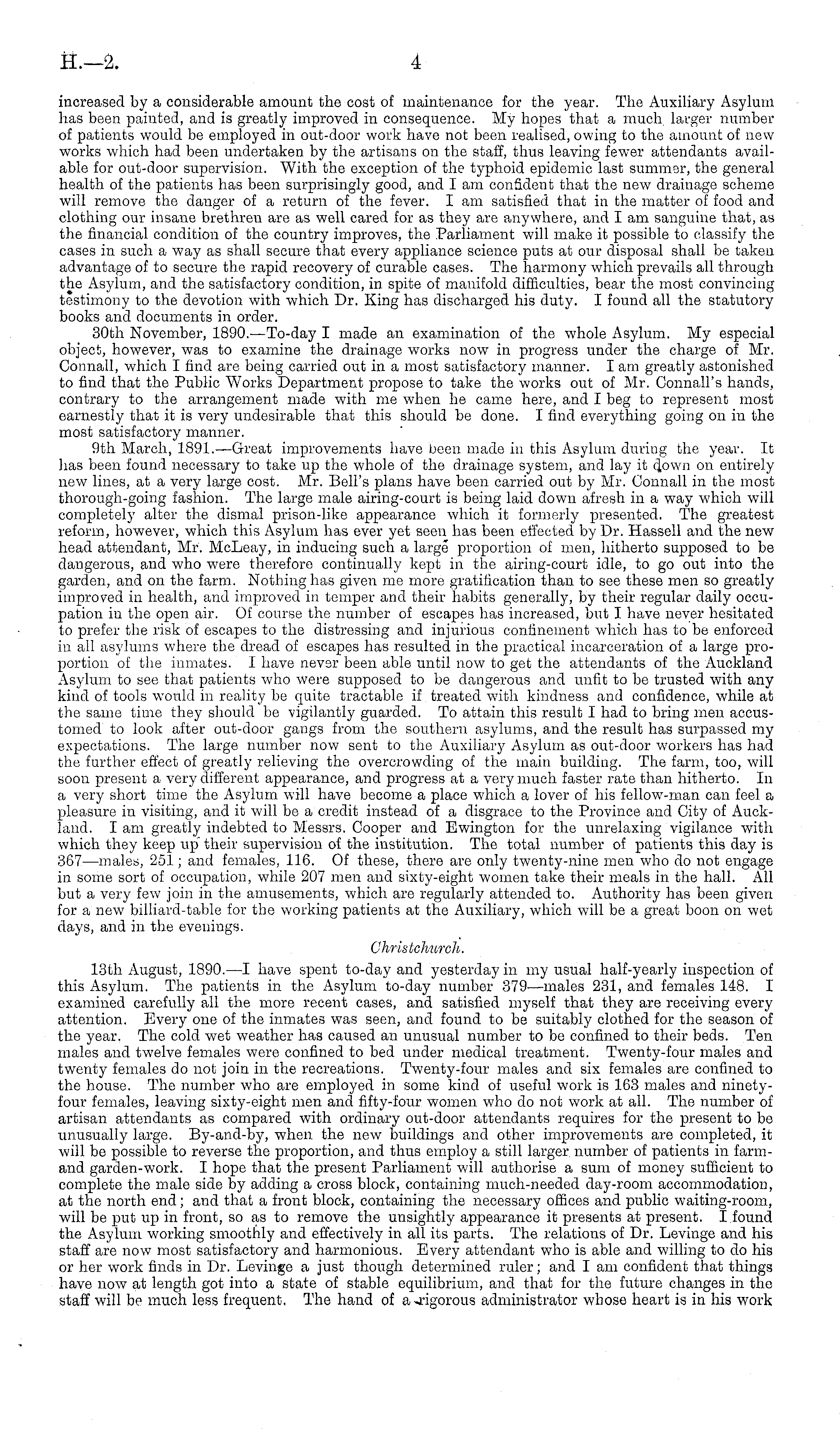 increased by a considerable amount the cost of maintenance for the year. The Auxiliary Asylum has been painted, and is greatly improved in consequence. My hopes that a much larger number of patients Avould be employed in out-door work have not been realised, owing to the amount of neAv works which had been undertaken by the artisans on the staff, thus leaving fewer attendants available for out-door supervision. With the exception of the typhoid epidemic last summer, the general health of the patients has been surprisingly good, and I am confident that the neAv drainage scheme will remove the danger of a return of the fever. I am satisfied that in the matter of food and clothing our insane brethren are as Avell cared for as they are anyAvhere, and I am sanguine that, as the financial condition of the country improves, the Parliament will make it possible to classify the cases in such a way as shall secure that every appliance science puts at our disposal shall be taken advantage of to secure the rapid recovery of curable cases. The harmony which prevails all through the Asylum, and the satisfactory condition, in spite of manifold difficulties, bear the most convincing testimony to the devotion with which Dr. King has discharged his duty. I found all the statutory books and documents in order. 30th November, 1890. —To-day I made an examination of the Avhole Asylum. My especial object, hoAvever, was to examine the drainage works hoav in progress under the charge of Mr. Connall, which I find are being carried out in a most satisfactory manner. lam greatly astonished to find that the Public Works Department propose to take the works out of Mr. Connall's hands, contrary to the arrangement made with me when he came here, and I beg to represent most earnestly that it is very undesirable that this should be done. I find everything going on in the most satisfactory manner. 9th March, 1891.—Great improvements have been made in this Asylum during the year. It has been found necessary to take up the whole of the drainage system, and lay it down on entirely new lines, at a very large cost. Mr. Bell's plans have been carried out by Mr. Connall in the most thorough-going fashion. The large male airing-court is being laid down afresh in a way w 7hich will completely alter the dismal prison-like appearance Avhich it formerly presented. The greatest reform, however, which this Asylum has ever yet seen has been effected by Dr. Hassell and the neAv head attendant, Mr. McLeay, in inducing such a large proportion of men, hitherto supposed to be dangerous, and who Avere therefore continually kept in the airing-court idle, to go out into the garden, and on the farm. Nothing has given me more gratification than to see these men so greatly improved in health, and improved in temper and their habits generally, by their regular daily occupation in the open air. Of course the number of escapes has increased, but I have never hesitated to prefer the risk of escapes to the distressing and injurious confinement which has to be enforced in all asylums where the dread of escapes has resulted in the practical incarceration of a large proportion of the inmates. I have never been able until hoav to get the attendants of the Auckland Asylum to see that patients Avho Avere supposed to be dangerous and unfit to be trusted Avith any kind of tools would in reality be quite tractable if treated AA'ith kindness and confidence, while at the same time they should be vigilantly guarded. To attain this result I had to bring men accustomed to look after out-door gangs from the southern asylums, and the result has surpassed my expectations. The large number noAv sent to the Auxiliary Asylum as out-door Avorkers has had the further effect of greatly relieving the overcrowding of the main building. The farm, too, will soon present a very different appearance, and progress at a Aery much faster rate than hitherto. In a very short time the Asylum will have become a place which a lover of his fellow-man can feel a pleasure in visiting, and it will be a credit instead of a disgrace to the Province and City of Auckland. lam greatly indebted to Messrs. Cooper and Ewington for the unrelaxing A'igilance with Avhich they keep up their supervision of the institution. The total number of patients this day is 367—males, 251; and females, 116. Of these, there are only twenty-nine men who do not engage in some sort of occupation, while 207 men and sixty-eight women take their meals in the hall. All but a very feAV join in the amusements, Avhich are regularly attended to. Authority has been given for a new billiard-table for the Avorking patients at the Auxiliary, which will be a great boon on wet days, and in the evenings. Ghristchurch. 13th August, 1890. —I have spent to-day and yesterday in my usual half-yearly inspection of this Asylum. The patients in the Asylum to-day number 379 —males 231, and females 148. I examined carefully all the more recent cases, and satisfied myself that they are receiving every attention. Every one of the inmates was seen, and found to be suitably clothed for the season of the year. The cold wet weather has caused an unusual number to be confined to their beds. Ten males and twelve females were confined to bed under medical treatment. Twenty-four males and twenty females do not join in the recreations. Twenty-four males and six females are confined to the house. The number who are employed in some kind of useful work is 163 males and ninetyfour females, leaving sixty-eight men and fifty-four women who do not Avork at all. The number of artisan attendants as compared with ordinary out-door attendants requires for the present to be unusually large. By-and-by, when the new buildings and other improvements are completed, it Avill be possible to reverse the proportion, and thus employ a still larger number of patients in farmand garden-work. I hope that the present Parliament will authorise a sum of money sufficient 