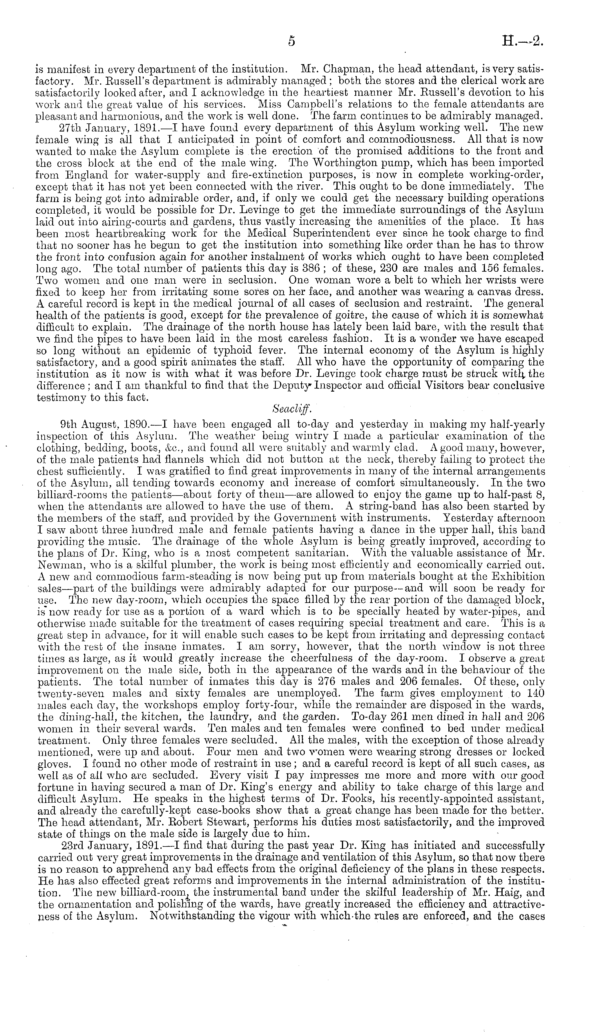 is manifest in every department of the institution. Mr. Chapman, the head attendant, is very satisfactory. Mr. Russell's department is admirably managed ; both the stores and the clerical work are satisfactorily looked after, and I acknowledge in the heartiest manner Mr. Russell's devotion to his work and the great value of his services. Miss Campbell's relations to the female attendants are pleasant and harmonious, and the work is well done. The farm continues to be admirably managed. 27th January, 1891.—1 have found every department of this Asylum working well. The new female wing is all that I anticipated in point of comfort and commodiousness. All that is noAv wanted to make the Asylum complete is the erection of the promised additions to the front and the cross block at the end of the male wing. The Worthington pump, Avhich has been imported from England for water-supply and fire-extinction purposes, is now in complete working-order, except that it has not yet been connected with the river. This ought to be done immediately. The farm is being got into admirable order, and, if only we could get the necessary building operations completed, it would be possible for Dr. Levinge to get the immediate surroundings of the Asylum laid out into airing-courts and gardens, thus vastly increasing the amenities of the place. It has been most heartbreaking work for the Medical Superintendent ever since he took charge to find that no sooner has he begun to get the institution into something like order than he has to throw the front into confusion again for another instalment of works Avhich ought to have been completed long ago. The total number of patients this day is 386 ; of these, 230 are males and 156 females. Two women and one man were in seclusion. One woman wore a belt to which her wrists were fixed to keep her from irritating some sores on her face, and another was wearing a canvas dress. A careful record is kept in the medical journal of all cases of seclusion and restraint. The general health of the patients is good, except for the prevalence of goitre, the cause of AA'hich it is somewhat difficult to explain. The drainage of the north house has lately been laid bare, with the result that we find the pipes to have been laid in the most careless fashion. It is a Avouder we have escaped so long Avithout an epidemic of typhoid fever. The internal economy of the Asylum is highly satisfactory, and a good spirit animates the staff. All who have the opportunity of comparing the institution as it now is with Avhat it Avas before Dr. Levinge took charge must be struck with the difference ; and I am thankful to find that the Deputy Inspector and official Visitors bear conclusive testimony to this fact. Seacliff. 9th August, 1890. —I haAe been engaged all to-day and yesterday in making my half-yearly inspection of this Asylum. The weather being wintry I made a particular examination of the clothing, bedding, boots, &c, and found all were suitably and warmly clad. A good many, however, of the male patients had flannels which did not button at the neck, thereby failing to protect the chest sufficiently. I Avas gratified to find great improvements in many of the internal arrangements of the Asylum, all tending towards economy and increase of comfort simultaneously. In the two billiard-rooms the patients—about forty of them—are allowed to enjoy the game up to half-past 8, when the attendants are allowed to have the use of them. A string-band has also been started by the members of the staff, and provided by the Government with instruments. Yesterday afternoon I saAV about three hundred male and female patients having a dance in the upper hall, this band providing the music. The drainage of the whole Asylum is being greatly improved, according to the plans of Dr. King, who is a most competent sanitarian. With the valuable assistance of Mr. Newman, avlio is a skilful plumber, the Avork is being most efficiently and economically carried out. A new and commodious farm-steading is noAv being put up from materials bought at the Exhibition sales—part of the buildings were admirably adapted for our purpose— and will soon be ready for use. The new day-room, which occupies the space filled by the rear portion of the damaged block, is" now ready for use as a portion of a Avard Avhich is to be specially heated by Avater-pipes, and otherwise made suitable for the treatment of cases requiring special treatment and care. This is a great step in advance, for it will enable such cases to be kept from irritating and depressing contact with the rest of the insane inmates. I am sorry, however, that the north window is not three times as large, as it would greatly increase the cheerfulness of the day-room. I observe a great improvement on the male side, both in the appearance of the Avards and in the behaviour of the patients. The total number of inmates this day is 276 males and 206 females. Of these, only twenty-seven males and sixty females are unemployed. The farm gives employment to 140 males each day, the workshops employ forty-four, while the remainder are disposed in the wards, the dining-hall, the kitchen, the laundry, and the garden. To-day 261 men dined in hall and 206 women in their several wards. Ten males and ten females were confined to bed under medical treatment. Only three females were secluded. All the males, AA'ith the exception of those already mentioned, were up and about. Four men and two women were wearing strong dresses or locked gloves. I found no other mode of restraint in use; and a careful record is kept of all such cases, as Avell as of all who are secluded. Every visit I pay impresses me more and more Avith our good fortune in having secured a man of Dr. King's energy and ability to take charge of this large and difficult Asylum. He speaks in the highest terms of Dr. Fooks, his recently-appointed assistant, and already the carefully-kept case-books show that a great change has bee