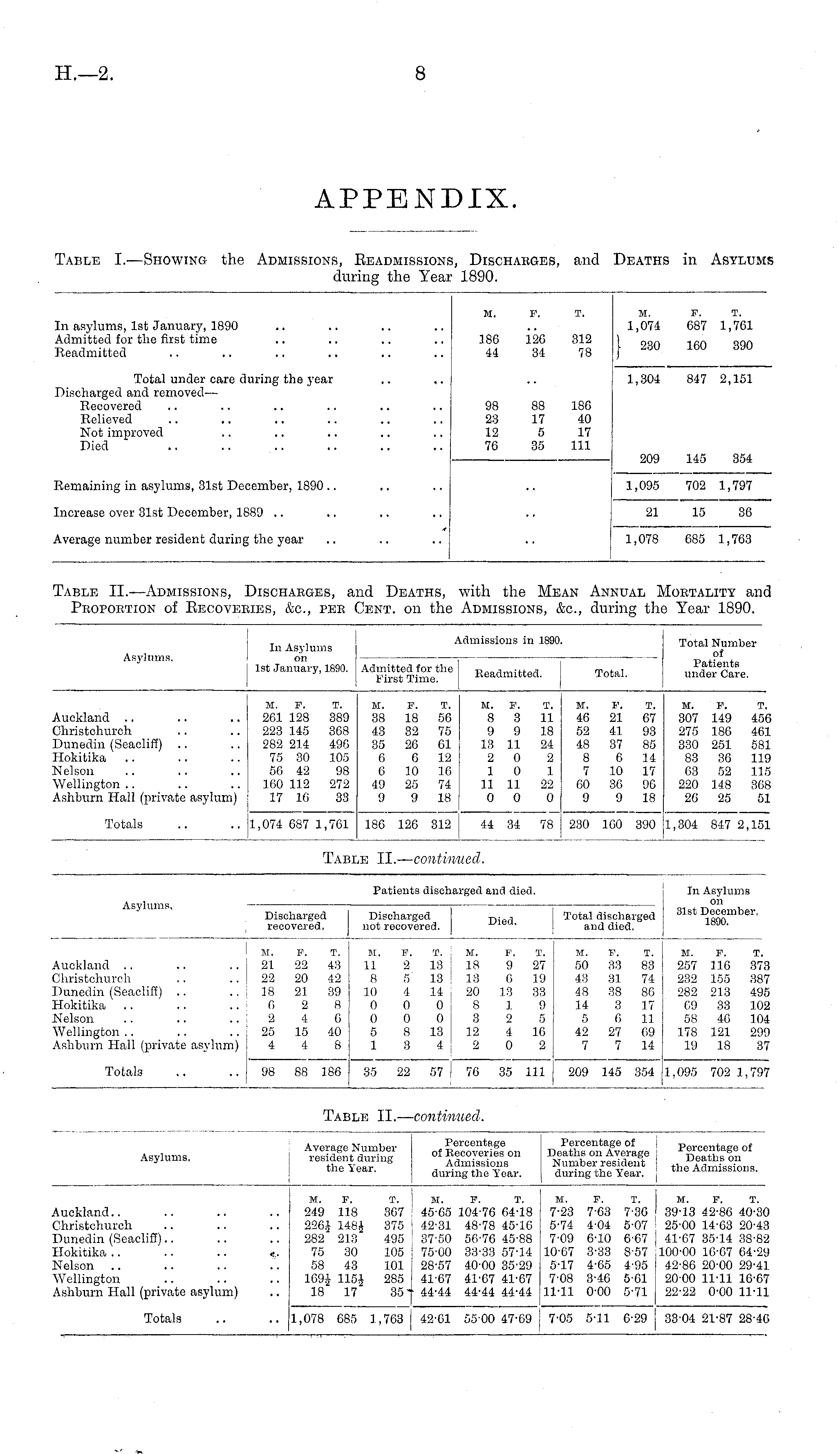 Asylums. Average Number resident during the Year. Percentage of Recoveries on Admissions during the Year. Percentage ol Vpr.m.n ._ nf Deaths on Average ; DiSthlon Number resident \ th6 Idmissions during the Year, j tne Admissions. Auckland.. Dhristchurch Dunedin (Seacliff) Hokitika Sfelson Wellington ishburn Hall (private asylum) *.-• M. F. 249 118 226* 1484 282 213 75 30 58 43 169& 115J 18 17 T. 367 375 495 105 101 285 35 M. F. _. 45-65 104-76 64-18 42-31 48-78 45-16 37'50 56-76 45-88 75-00 33-33 57-14 28-57 40-00 35-29 41-67 41-67 41-67 44-44 44-44 44-44 M. P. T. j M. F. T. 7-23 7-63 7-36 ' 39-13 42-86 40-3C 5-74 4-04 5-07 ! 25-00 14-63 20-4S 7-09 6-10 6-67 J 41-67 35-14 38-82 10-67 3-33 8-57 100-00 16-67 64-2'.: 5-17 4-65 4-95 42-86 20-00 29-41 708 3-46 5-61 20-00 11-11 16-61 11-11 0-00 5-71 22-22 0U0 11-11 Totals 1,078 685 1,763 42-61 55-00 47-69 7-05 5-11 6-29 33-04 21-87 28-41
