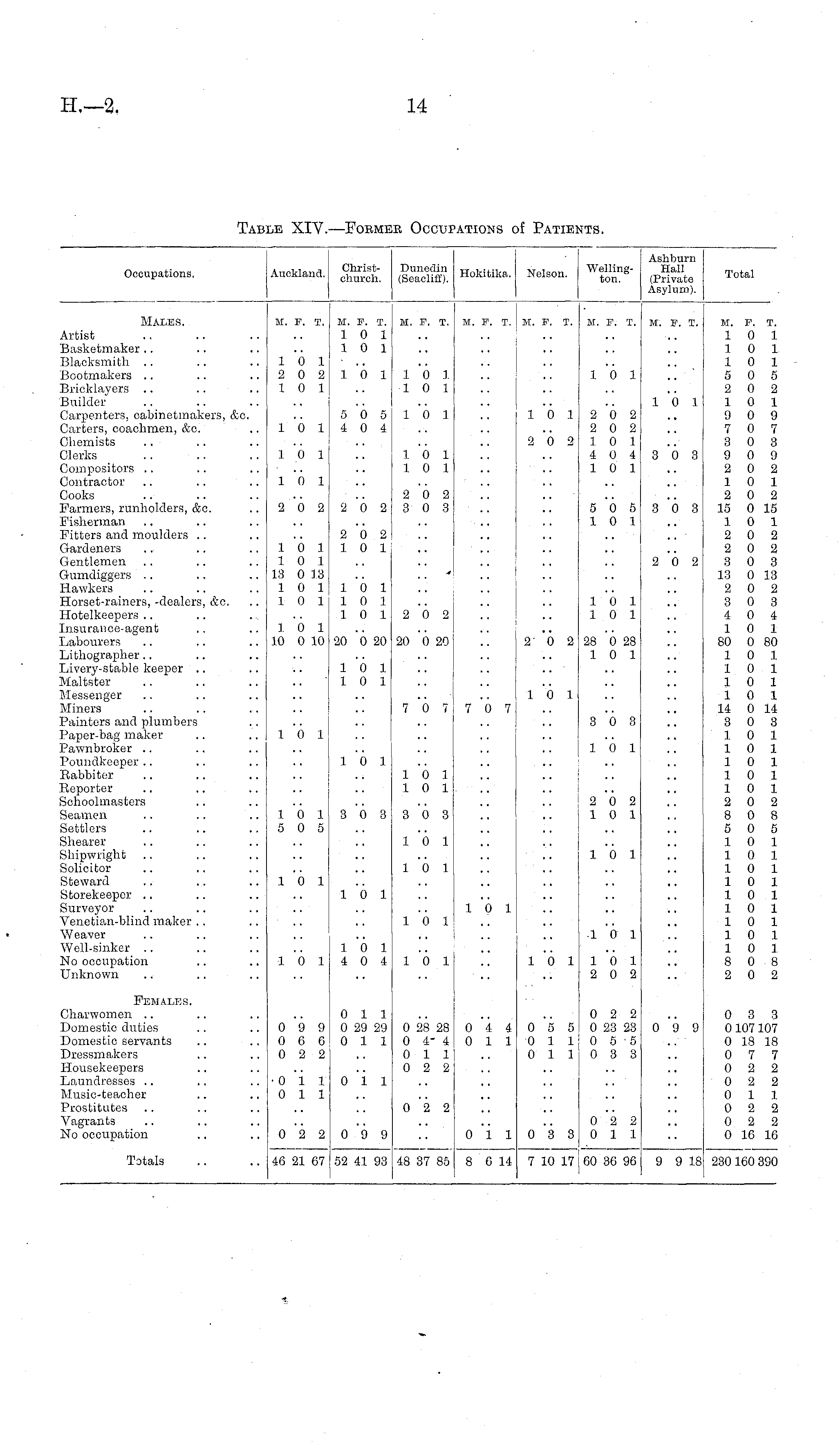 Occupations. Auckland. Dunedin (Seacliff). Hokitika. Nelson. Wellington. Ashburn Hall (Private Asylum). Total Males. SI. P. T. SI. F. T. 10 1 10 1 M. F. T. M, F. T. St. F. T. 31. F. T. 31. F. I. 31. P. T. 10 1 10 1 10 1 5 0 5 2 0 2 10 1 9 0 9 7 0 7 3 0 3 9 0 9 2 0 2 10 1 2 0 2 15 0 15 10 1 2 0 2 2 0 2 3 0 3 13 0 13 2 0 2 3 0 3 4 0 4 10 1 80 0 80 10 1 10 1 10 1 10 1 14 0 14 3 0 3 10 1 10 1 10 1 10 1 10 1 2 0 2 8 0 8 5 0 5 10 1 10 1 10 1 10 1 10 1 10 1 10 1 10 1 1 0 1 8 0 8 2 0 2 Artist Basketmaker Blacksmith Bootmakers Bricklayers Builder Carpenters, cabinetmakers, &c. Carters, coachmen, &o. Chemists Clerks 10 1 2 0 2 1 0 1 1 6 1 1 0 1 1 0 1 10 1 i '6 i 1 '6 1 5 0 5 4 0 4 1 0 1 1 '6 1 2 0 2 2 0 2 10 1 4 0 4 10 1 2 '6 2 i 1 0 1 1 '6 1 10 1 3 0 3 Compositors Contractor Cooks Farmers, runholders, &c. Fisherman Fitters and moulders Gardeners Gentlemen Gumdiggers .. Hawkers Horset-rainers, -dealers, &o. Hotelkeepers Insurance-agent Labourers Lithographer Livery-stable keeper Maltster Messenger Miners Painters and plumbers Paper-bag maker Pawnbroker Poundkeeper Rabbiter Reporter Schoolmasters 1 '0 1 2 '0 2 101 1 0 1 13 0 13 10 1 10 1 1 0 1 .10 0 10 2 '0 2 2 '0 2 1 0 1 10 1 1 0 1 10 1 20 0 20 2 '6 2 3 0 3 * 2 'o 2 20 '6 20 2- '6 2 5 "6 5 10 1 10 1 1 0 1 28 6 28 10 1 3 0 3 2 '6 2 1 '6 1 1 0 1 1 '6 1 7 '6 7 7 0 7 3 '6 3 1 '0 1 10 1 10 1 1 0 1 10 1 10 1 5 0 5 3 0 3 3 '6 3 2 '0 2 10 1 Seamen Settlors Shearer Shipwright Solicitor Steward Storekeeper Surveyor Venetian-blind maker Weaver Well-sinker No occupation Unknown 10 1 1 0 1 1 '6 1 10 1 10 1 10 1 1 '6 1 ! I " 10 1 1 '6 1 1 0 1 4 0 4 1 '6 1 I 1 1 10 1 10 1 2 0 2 Fesiales. 0 11 0 29 29 0 11 0 2 2 0 23 23 0 5 5 0 3 3 0 3 3 0107107 0 18 18 0 7 7 0 2 2 0 2 2 0 1 1 0 2 2 0 2 2 0 10 16 Charwomen Domestic duties Domestic servants Dressmakers Housekeepers Laundresses Music-teacher Prostitutes Vagrants No occupation 0 9 9 0 6 0 0 2 2 0 28 28 0 4-4 0 11 0 2 2 0 "_ _ Oil 0 5 5 0 11 0 11 0 '9 9 ■ 0 'i 1 0 11 X 1 1 •• I ! •• 0 2 2 0 "2 2 011 0 2 2 0 9 9 oil 0 '3 3 Tatals 46 21 67 52 41 93 48 37 85 8 6 14 7 10 17 I 60 36 96 9 9 18 230 100 3S0