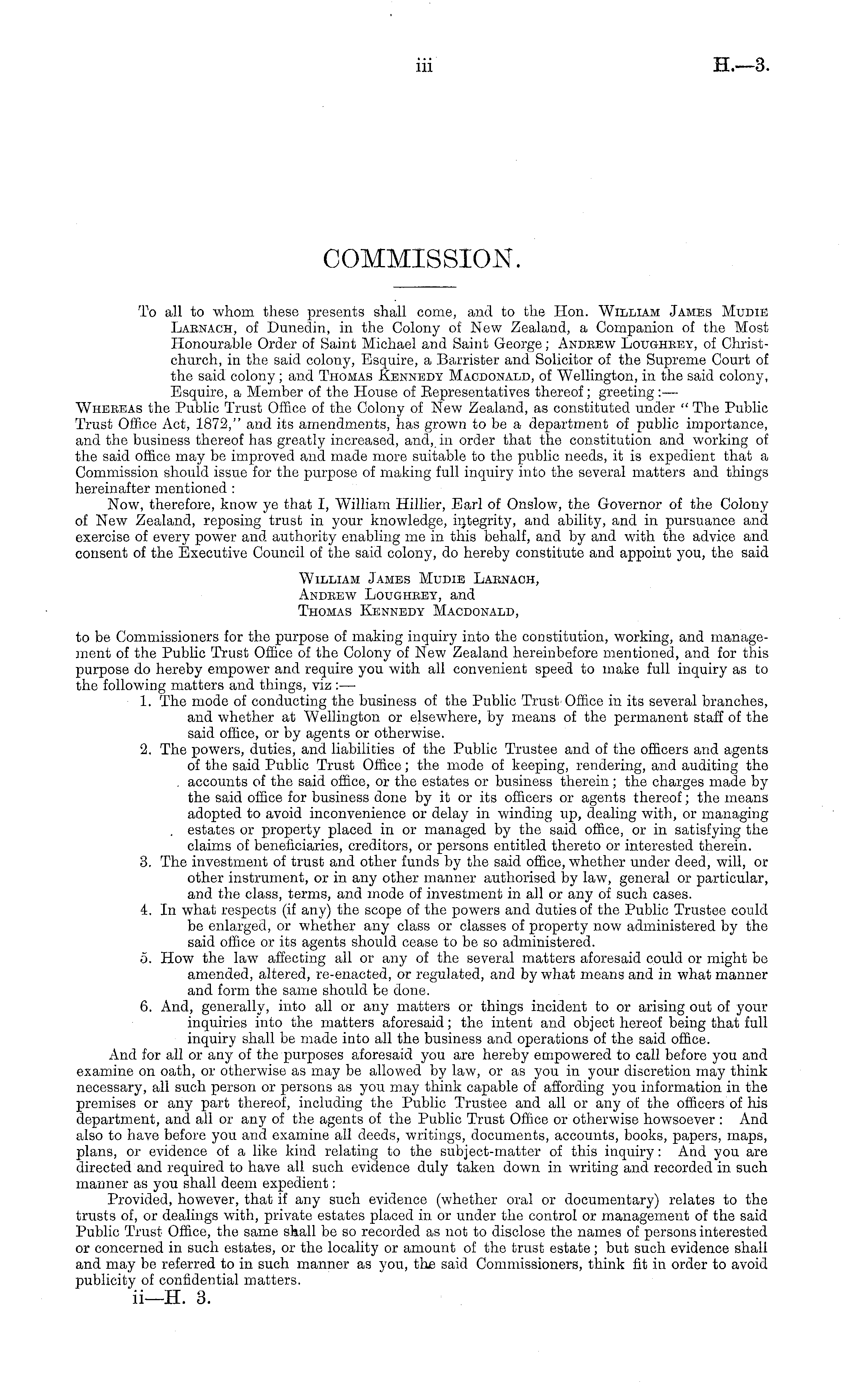 To all to whom these presents shall come, and to the Hon. William Jambs Mudie Laenach, of Dunedin, in the Colony of New Zealand, a Companion of the Most Honourable Order of Saint Michael and Saint George; Andebw Lougheey, of Christchurch, in the said colony, Esquire, a Barrister and Solicitor of the Supreme Court of the said colony; and Thomas Kennedy Macdonald, of Wellington, in the said colony, Esquire, a Member of the House of Representatives thereof; greeting : — Wheeeas the Public Trust Office of the Colony of New Zealand, as constituted under " The Public Trust Office Act, 1872," and its amendments, has grown to be a department of public importance, and the business thereof has greatly increased, and, in order that the constitution and working of the said office may be improved and made more suitable to the public needs, it is expedient that a Commission should issue for the purpose of making full inquiry into the several matters and things hereinafter mentioned : Now, therefore, know ye that I, William Hillier, Earl of Onslow, the Governor of the Colony of New Zealand, reposing trust in your knowledge, integrity, and ability, and in pursuance and exercise of every power and authority enabling me in this behalf, and by and with the advice and consent of the Executive Council of the said colony, do hereby constitute and appoint you, the said William James Mudie Laenach, Andbew Lougheey, and Thomas Kennedy Macdonald, to be Commissioners for the purpose of making inquiry into the constitution, working, and management of the Public Trust Office of the Colony of New Zealand hereinbefore mentioned, and for this purpose do hereby empower and require you with all convenient speed to make full inquiry as to the following matters and things, viz : — 1. The mode of conducting the business of the Public Trust Office in its several branches, and whether at Wellington or elsewhere, by means of the permanent staff of the said office, or by agents or otherwise. 2. The powers, duties, and liabilities of the Public Trustee and of the officers and agents of the said Public Trust Office; the mode of keeping, rendering, and auditing the . accounts of the said office, or the estates or business therein; the charges made by the said office for business done by it or its officers or agents thereof; the means adopted to avoid inconvenience or delay in winding up, dealing with, or managing . estates or property placed in or managed by the said office, or in satisfying the claims of beneficiaries, creditors, or persons entitled thereto or interested therein. 3. The investment of trust and other funds by the said office, whether under deed, will, or other instrument, or in any other manner authorised by law, general or particular, and the class, terms, and mode of investment in all or any of such cases. 4. In what respects (if any) the scope of the powers and duties of the Public Trustee could be enlarged, or whether any class or classes of property now administered by the said office or its agents should cease to be so administered. 5. How the law affecting all or any of the several matters aforesaid could or might be amended, altered, re-enacted, or regulated, and by what means and in what manner and form the same should be done. 6. And, generally, into all or any matters or things incident to or arising out of your inquiries into the matters aforesaid; the intent and object hereof being that full inquiry shall be made into all the business and operations of the said office. And for all or any of the purposes aforesaid you are hereby empowered to call before you and examine on oath, or otherwise as may be allowed by law, or as you in your discretion may think necessary, all such person or persons as you may think capable of affording you information in the premises or any part thereof, including the Public Trustee and all or any of the officers of his department, and all or any of the agents of the Public Trust Office or otherwise howsoever : And also to have before you and examine all deeds, writings, documents, accounts, books, papers, maps, plans, or evidence of a like kind relating to the subject-matter of this inquiry: And you are directed and required to have all such evidence duly taken down in writing and recorded in such manner as you shall deem expedient: Provided, however, that if any such evidence (whether oral or documentary) relates to the trusts of, or dealings with, private estates placed in or under the control or management of the said Public Trust Office, the same shall be so recorded as not to disclose the names of persons interested or concerned in such estates, or the locality or amount of the trust estate; but such evidence shall and may be referred to in such manner as you, the said Commissioners, think fit in order to avoid publicity of confidential matters. ii—H. 3.