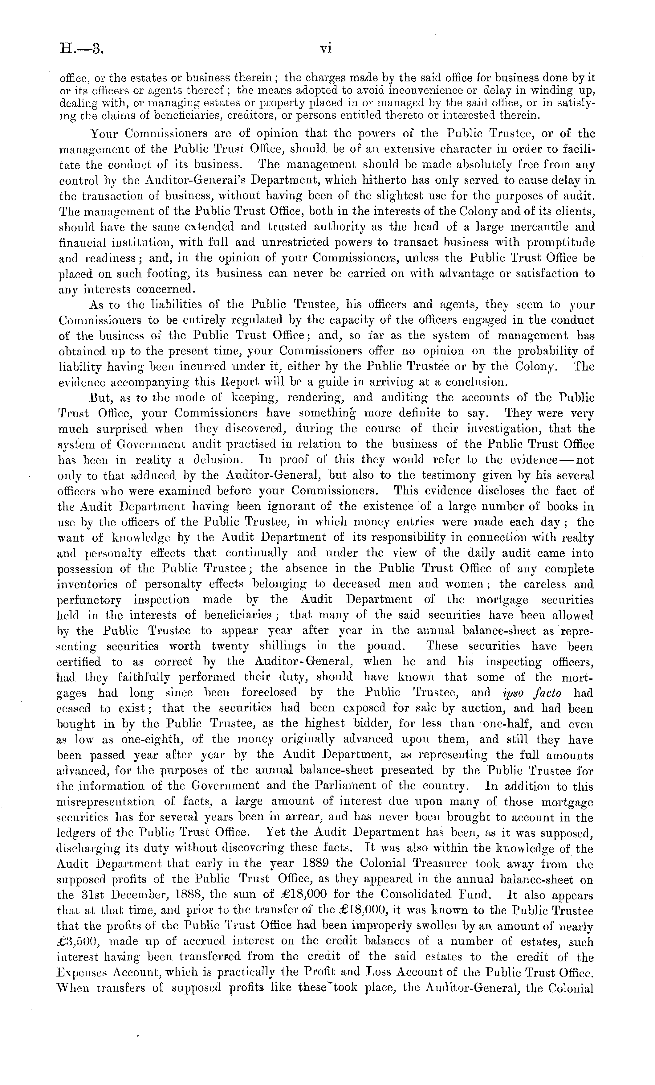 office, or the estates or business therein; the charges made by the said office for business done by it or its officers or agents thereof ; the means adopted to avoid inconvenience or delay in winding up, dealing with, or managing estates or property placed in or managed by the said office, or in satisfying the claims of beneficiaries, creditors, or persons entitled thereto or interested therein. Your Commissioners are of opinion that the powers of the Public Trustee, or of the management of the Public Trust Office, should be of an extensive character in order to facilitate the conduct of its business. The management should be made absolutely free from any control by the Auditor-General's Department, which hitherto has only served to cause delay in the transaction of business, without having been of the slightest use for the purposes of audit. The management of the Public Trust Office, both in the interests of the Colony and of its clients, should have the same extended and trusted authority as the head of a large mercantile and financial institution, with full and unrestricted powers to transact business with promptitude and readiness; and, in the opinion of your Commissioners, unless the Public Trust Office be placed on such footing, its business can never be carried on with advantage or satisfaction to any interests concerned. As to the liabilities of the Public Trustee, his officers and agents, they seem to your Commissioners to be entirely regulated by the capacity of the officers engaged in the conduct of the business of the Public Trust Office; and, so far as the system of management has obtained up to the present time, your Commissioners offer no opinion on the probability of liability having been incurred under it, either by the Public Trustee or by the Colony. The evidence accompanying this Report will be a guide in arriving at a conclusion. But, as to the mode of keeping, rendering, and auditing the accounts of the Public Trust Office, your Commissioners have something more definite to say. They were very much surprised when they discovered, during the course of their investigation, that the system of Government audit practised in relation to the business of the Public Trust Office has been in reality a delusion. In proof of this they would refer to the evidence' —not only to that adduced by the Auditor-General, but also to the testimony given by his several officers who were examined before your Commissioners. This evidence discloses the fact of the Audit Department having been ignorant of the existence of a large number of books in use by the officers of the Public Trustee, in which money entries were made each day ; the want of knowledge by the Audit Department of its responsibility in connection with realty and personalty effects that continually and under the view of the daily audit came into possession of the Public Trustee ; the absence in the Public Trust Office of any complete inventories of personalty effects belonging to deceased men and women ; the careless and perfunctory inspection made by the Audit Department of the mortgage securities held in the interests of beneficiaries ; that many of the said securities have been allowed by the Public Trustee to appear year after year in the annual balance-sheet as representing securities worth twenty shillings in the pound. These securities have been certified to as correct by the Auditor-General, when he and his inspecting officers, had they faithfully performed their duty, should have known that some of the mortgages had long since been foreclosed by the Public Trustee, and ipso facto had ceased to exist; that the securities had been exposed for sale by auction, and had been bought in by the Public Trustee, as the highest bidder, for less than one-half, and even as low as one-eighth, of the money originally advanced upon them, and still they have been passed year after year by the Audit Department, as representing the full amounts advanced, for the purposes of the annual balance-sheet presented by the Public Trustee for the information of the Government and the Parliament of the country. In addition to this misrepresentation of facts, a large amount of interest due upon many of those mortgage securities has for several years been in arrear, and has never been brought to account in the ledgers of the Public Trust Office. Yet the Audit Department has been, as it was supposed, discharging its duty without discovering these facts. It was also within the knowledge of the Audit Department that early in the year 1889 the Colonial Treasurer took away from the supposed profits of the Public Trust Office, as they appeared in the annual balance-sheet on the 31st December, 1888, the sum of .€lB,OOO for the Consolidated Fund. It also appears that at that time, and prior to the transfer of the £18,000, it was known to the Public Trustee that the profits of the Public Trust Office had been improperly swollen by an amount of nearly £3,500, made up of accrued interest on the credit balances of a number of estates, such interest having been transferred from the credit of the said estates to the credit of the Expenses Account, which is practically the Profit and Loss Account of the Public Trust Office. When transfers of supposed profits like these~took place, the Auditor-General, the Colonial