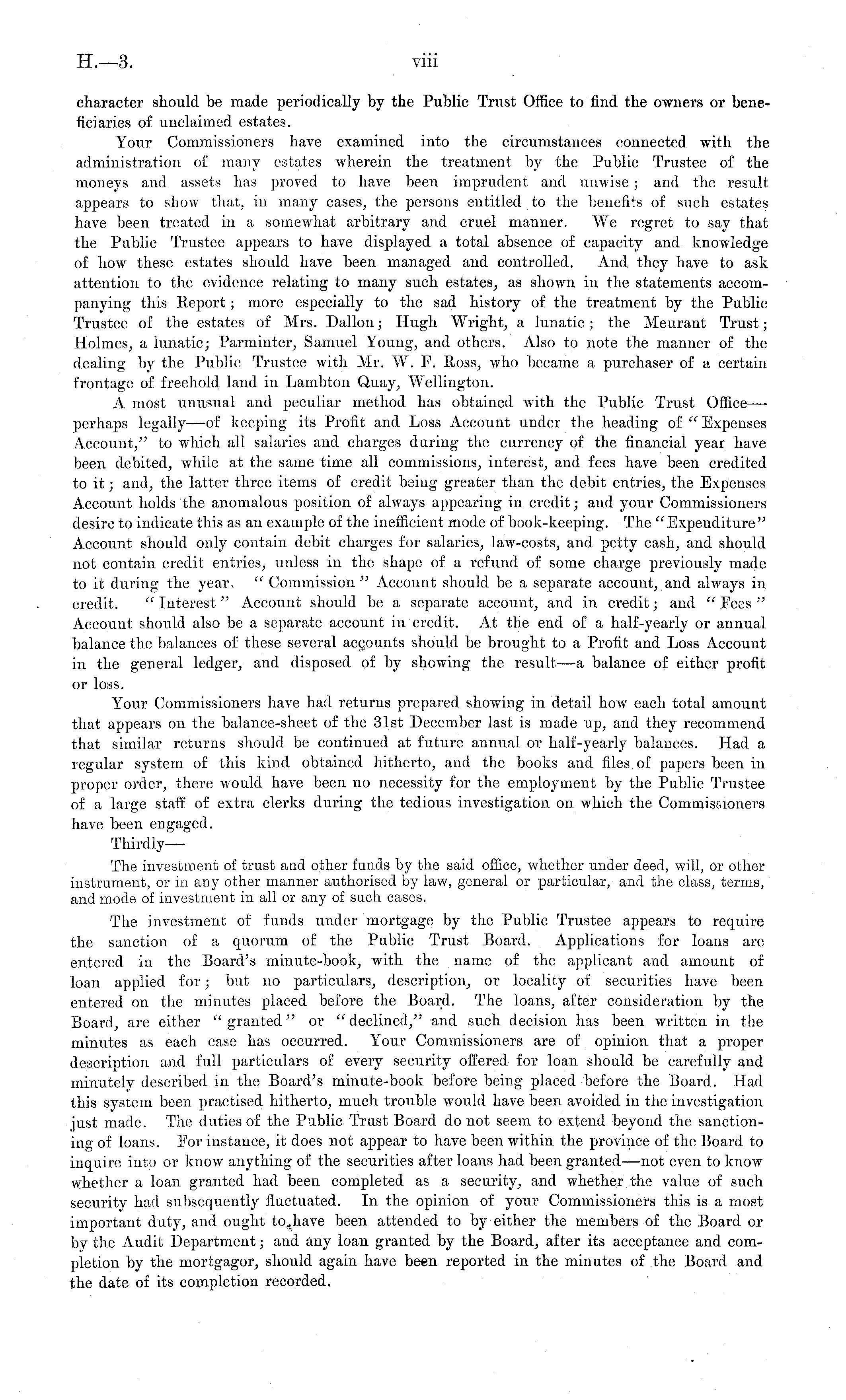 character should be made periodically by the Public Trust Office to find the owners or beneficiaries of unclaimed estates. Your Commissioners have examined into the circumstances connected with the administration of many estates wherein the treatment by the Public Trustee of the moneys and assets has proved to have been imprudent and unwise; and the result appears to show that, in many eases, the persons entitled to the benefits of such estates have been treated in a somewhat arbitrary and cruel manner. We regret to say that the Public Trustee appears to have displayed a total absence of capacity and knowledge of how these estates should have been managed and controlled. And they have to ask attention to the evidence relating to many such estates, as shown in the statements accompanying this Report; more especially to the sad history of the treatment by the Public Trustee of the estates of Mrs. Dallon; Hugh Wright, a lunatic; the Meurant Trust; Holmes, a lunatic; Parmiuter, Samuel Young, and others. Also to note the manner of the dealing by the Public Trustee with Mr. W. F. Ross, who became a purchaser of a certain frontage of freehold land in Lambton Quay, Wellington. A most unusual and peculiar method has obtained with the Public Trust Office—■ perhaps legally —of keeping its Profit and Loss Account under the heading of "Expenses Account," to which all salaries and charges during the currency of the financial year have been debited, while at the same time all commissions, interest, and fees have been credited to it; and, the latter three items of credit being greater than the debit entries, the, Expenses Account holds the anomalous position of always appearing in credit; and your Commissioners desire to indicate this as an example of the inefficient mode of book-keeping. The "Expenditure" Account should only contain debit charges for salaries, law-costs, and petty cash, and should not contain credit entries, unless in the shape of a refund of some charge previously made to it during the year. " Commission " Account should be a separate account, and always in credit. " Interest" Account should be a separate account, and in credit; and " Fees " Account should also be a separate account in credit. At the end of a half-yearly or annual balance the balances of these several accounts should be brought to a Profit and Loss Account in the general ledger, and disposed of by showing the result—a balance of cither profit or loss. Your Commissioners have had returns prepared showing in detail how each total amount that appears on the balance-sheet of the 31st December last is made up, and they recommend that similar returns should be continued at future annual or half-yearly balances. Had a regular system of this kind obtained hitherto, and the books and files of papers been in proper order, there would have been no necessity for the employment by the Public Trustee of a large staff of extra clerks during the tedious investigation on which the Commissioners have been engaged. Thirdly— The investment of trust and other funds by the said office, whether under deed, will, or other instrument, or in any other manner authorised by law, general or particular, and the class, terms, and mode of investment in all or any of such cases. The investment of funds under mortgage by the Public Trustee appears to require the sanction of a quorum of the Public Trust Board. Applications for loans are entered in the Board's minute-book, with the name of the applicant and amount of loan applied for; but no particulars, description, or locality of securities have been entered on the minutes placed before the Board. The loans, after consideration by the Board, are either " granted" or " declined," and such decision has been written in the minutes as each case has occurred. Your Commissioners are of opinion that a proper description and full particulars of every security offered for loan should be carefully and minutely described in the Board's minute-book before being placed before the Board. Had this system been practised hitherto, much trouble would have been avoided in the investigation just made. The duties of the Public Trust Board do not seem to extend beyond the sanctioning of loans. For instance, it does not appear to have been within the province of the Board to inquire into or know anything of the securities after loans had been granted —not even to know whether a loan granted had been completed as a security', and whether the value of such security had subsequently fluctuated. In the opinion of your Commissioners this is a most important duty, and ought to^have been attended to by either the members of the Board or by the Audit Department; and any loan granted by the Board, after its acceptance and completion by the mortgagor, should again have been reported in the minutes of the Board and the date of its completion recorded.