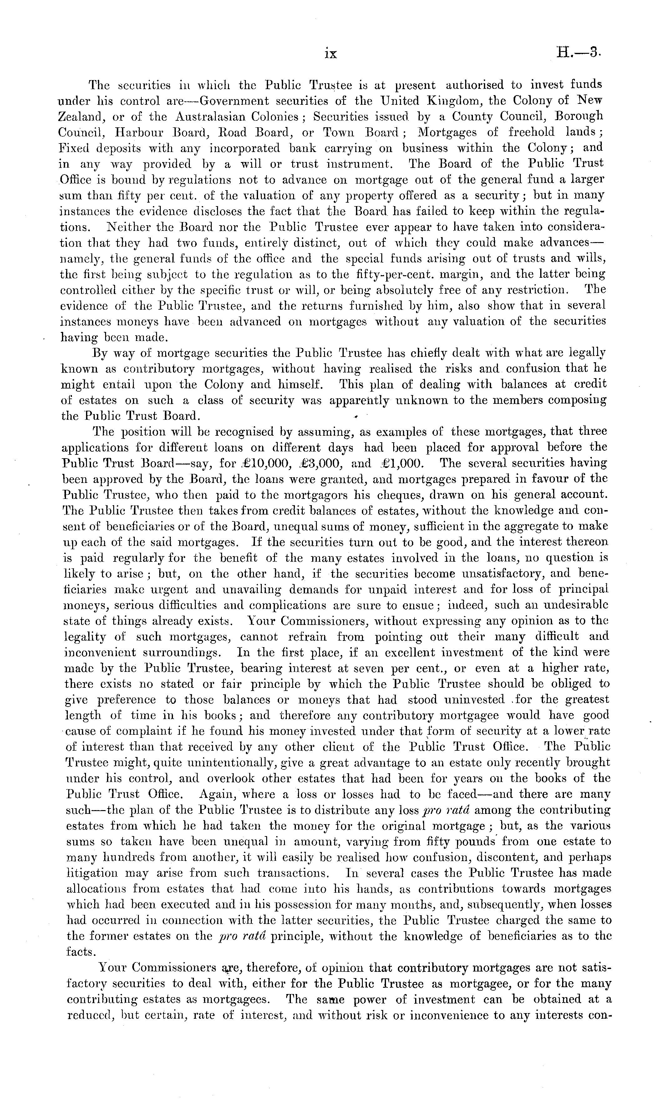 The securities in which the Public Trustee is at present authorised to invest funds under his control are —Government securities of the United Kingdom, the Colony of New Zealand, or of the Australasian Colonies ; Securities issued, by a County Council, Borough Council, Harbour Board, Road Board, or Town Board ; Mortgages of freehold lands; Fixed deposits with any incorporated bank carrying on business within the Colony; and in any r way provided by a will or trust instrument. The Board of the Public Trust Office is bound by regulations not to advance on mortgage out of the general fund a larger sum than fifty per cent, of the valuation of any property offered as a security; but in many instances the evidence discloses the fact that the Board has failed to keep within the regulations. Neither the Board nor the Public Trustee ever appear to have taken into consideration that they had two funds, entirely distinct, out of which theyr could make advances — namely, the general funds of the office and the special funds arising out of trusts and wills, the first being subject to the regulation as to the fifty-per-cent. margin, and the latter being controlled either by the specific trust or will, or being absolutely free of any restriction. The evidence of the Public Trustee, and the returns furnished by him, also show that in several instances moneys have been advanced on mortgages without any valuation of the securities having been made. By way of mortgage securities the Public Trustee has chiefly dealt with what are legally known as contributory mortgages, without having realised the risks and confusion that he might entail upon the Colony and himself. This plan of dealing with balances at credit of estates on such a class of security was apparently unknown to the members composing the Public Trust Board. The position will be recognised by assuming, as examples of these mortgages, that three applications for different loans on different days had been placed for approval before the Public Trust Board—say, for £10,000, £3,000, and £1,000. The several securities having been approved by the Board, the loans were granted, and mortgages prepared in favour of the Public Trustee, who then paid to the mortgagors his cheques, drawn on his general account. The Public Trustee then takes from credit balances of estates, without the knowledge and consent of beneficiaries or of the Board, unequal sums of money, sufficicmt in the aggregate to make up each of the said mortgages. If the securities turn out to be good, and the interest thereon is paid regularly for the benefit of the many estates involved in the loans, no question is likely to arise ; but, on the other hand, if the securities become unsatisfactory, and beneficiaries make urgent and unavailing demands for unpaid interest and for loss of principal moneys, serious difficulties and complications are sure to ensue; indeed, such an undesirable state of things already exists. Your Commissioners, without expressing any opinion as to the legality of such mortgages, cannot refrain from pointing out their many difficult and inconvenient surroundings. In the first place, if an excellent investment of the kind were made by the Public Trustee, bearing interest at seven per cent., or even at a higher rate, there exists no stated or fair principle by which the Public Trustee should be obliged to give preference to those balances or moneys that had stood uninvested for the greatest length of time in his books; and therefore any contributory mortgagee would have good cause of complaint if he found his money invested under that form of security at a lower rate of interest than that received by any other client of the Public Trust Office. The Public Trustee might, quite unintentionally, give a great advantage to an estate only recently brought under his control, and overlook other estates that had been for y rears on the books of the Public Trust Office. Again, where a loss or losses had to be faced—and there are many such—the plan of the Public Trustee is to distribute any loss pro rata among the contributing estates from which he had taken the money for the original mortgage ; but, as the various sums so taken have been unequal in amount, varying from fifty pounds from one estate to many hundreds from another, it will easily be realised how confusion, discontent, and perhaps litigation may arise from such transactions. In several cases the Public Trustee has made allocations from estates that had come into his hands, as contributions towards mortgages which had been executed and. in his possession for many months, and, subsequently, when losses had occurred in connection with the latter securities, the Public Trustee charged the same to the former estates on the pro rata principle, without the knowledge of beneficiaries as to the facts. Your Commissioners axe, therefore, of opinion that contributory mortgages are not satisfactory securities to deal with, either for the Public Trustee as mortgagee, or for the many contributing estates as mortgagees. The same power of investment can be obtained at a reduced, but certain, rate of interest, and without risk or inconvenience to anyr interests con-