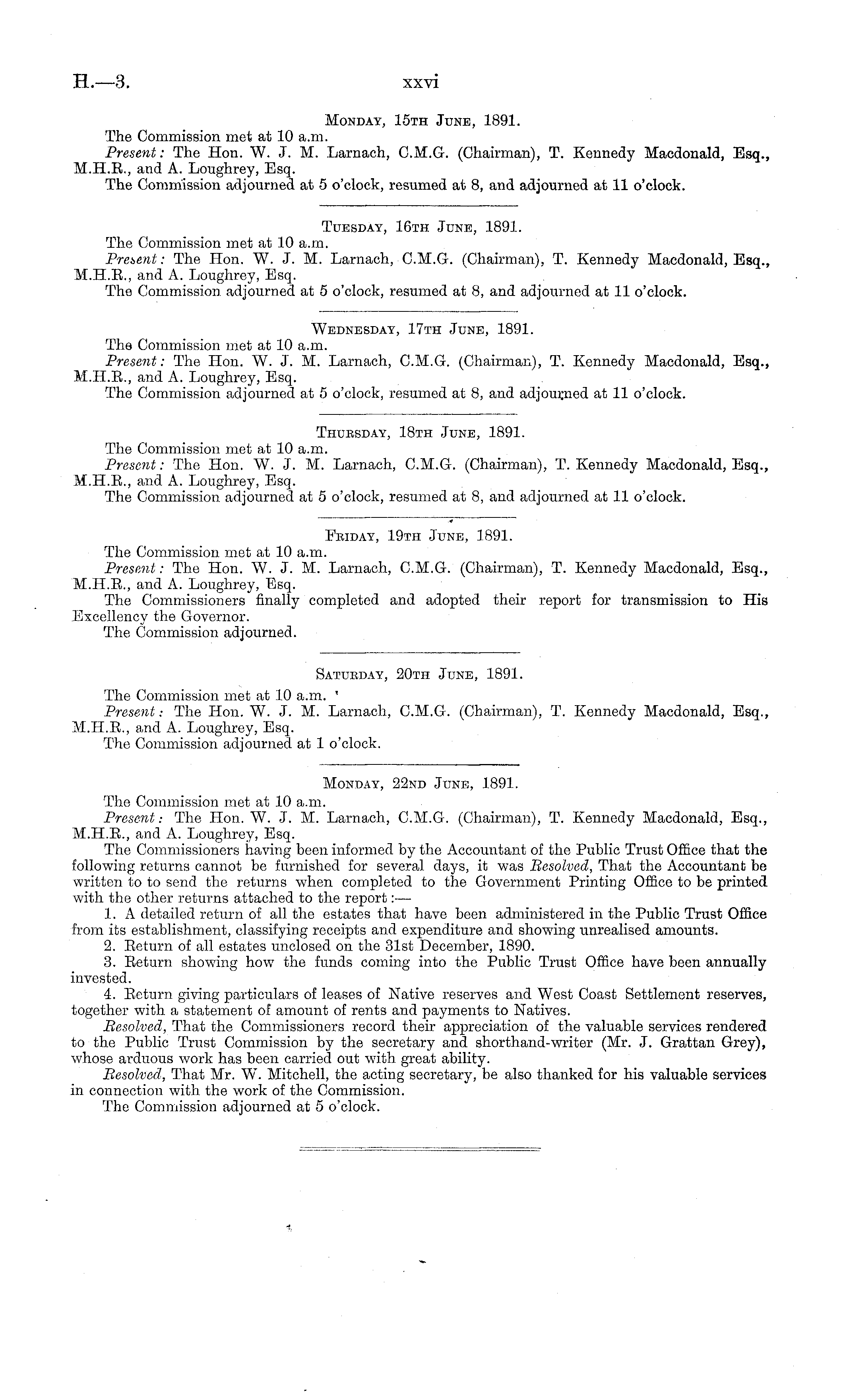 Saturday, 20th June, 1891. The Commission met at 10 a.m. ' Present: The Hon. W. J. M. Larnach, C.M.G. (Chairman), T. Kennedy Macdonald, Esq., M.H.R., and A. Loughrey, Esq. The Commission adjourned at 1 o'clock.