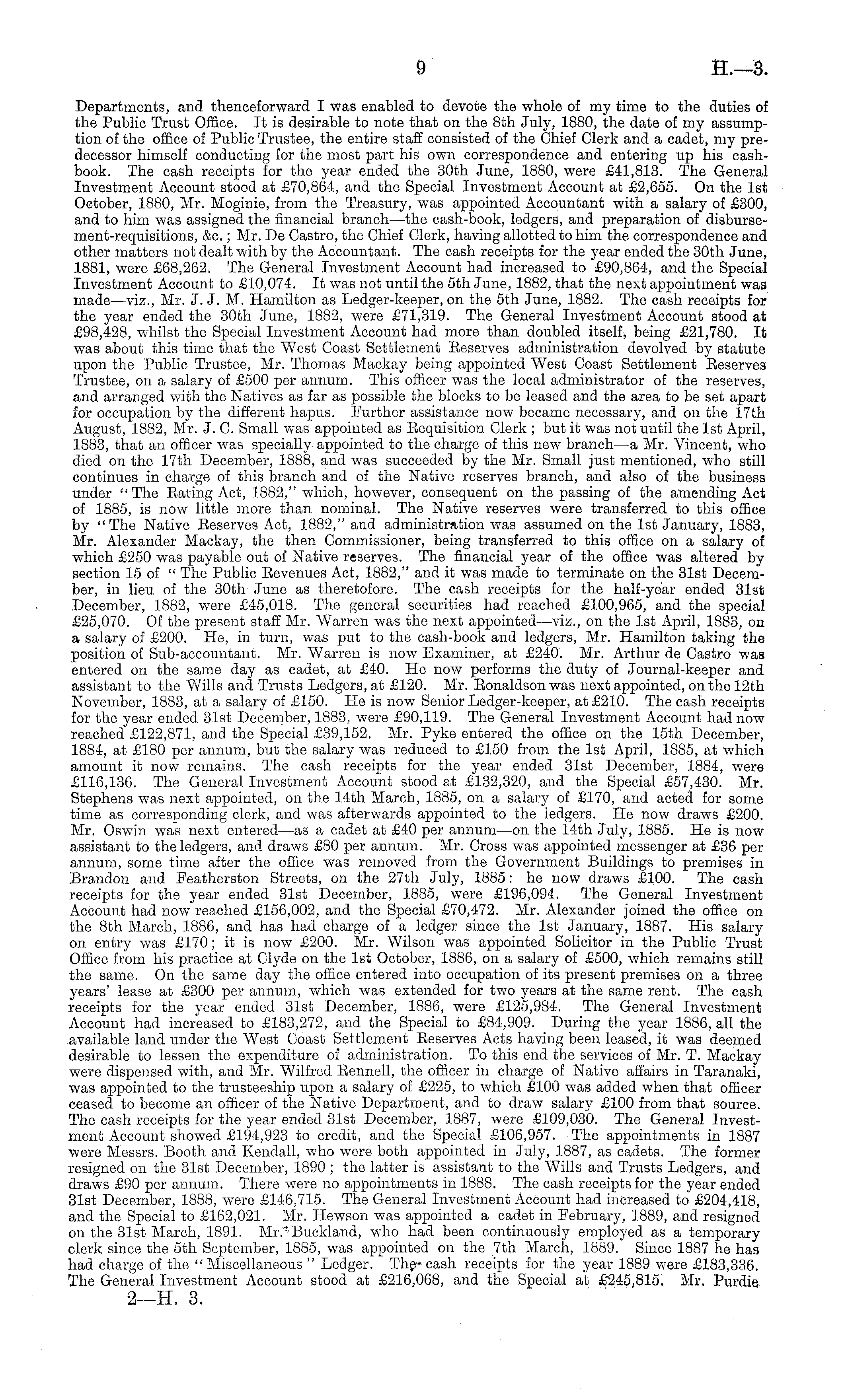 Departments, and thenceforward I was enabled to devote the whole of my time to the duties of the Public Trust Office. It is desirable to note that on the Bth July, 1880, the date of my assumption of the office of Public Trustee, the entire staff consisted of the Chief Clerk and a cadet, my predecessor himself conducting for the most part his own correspondence and entering up his cashbook. The cash receipts for the year ended the 30th June, 1880, were £41,813. The General Investment Account stood at £70,864, and the Special Investment Account at £2,655. On the Ist October, 1880, Mr. Moginie, from the Treasury, was appointed Accountant with a salary of £300, and to him was assigned the financial branch—the cash-book, ledgers, and preparation of disburse-ment-requisitions, &c.; Mr. De Castro, the Chief Clerk, having allotted to him the correspondence and other matters not dealt with by the Accountant. The cash receipts for the year ended the 30th June, 1881, were £68,262. The General Investment Account had increased to £90,864, and the Special Investment Account to £10,074. It was not until the sth June, 1882, that the next appointment was made—viz., Mr. J. J. M. Hamilton as Ledger-keeper, on the sth June, 1882. The cash receipts for the year ended the 30th June, 1882, were £71,319. The General Investment Account stood at £98,428, whilst the Special Investment Account had more than doubled itself, being £21,780. It was about this time that the West Coast Settlement Eeserves administration devolved by statute upon the Public Trustee, Mr. Thomas Mackay being appointed West Coast Settlement Eeserves Trustee, on a salary of £500 per annum. This officer was the local administrator of the reserves, and arranged with the Natives as far as possible the blocks to be leased and the area to be set apart for occupation by the different hapus. Further assistance now became necessary, and on the 17th August, 1882, Mr. J. C. Small was appointed as Eequisition Clerk ; but it was not until the Ist April, 1883, that an officer was specially appointed to the charge of this new branch—a Mr. Vincent, who died on the 17th December, 1888, and was succeeded by the Mr. Small just mentioned, who still continues in charge of this branch and of the Native reserves branch, and also of the business under "The Eating Act, 1882," which, however, consequent on the passing of the amending Act of 1885, is now little more than nominal. The Native reserves were transferred to this office by "The Native Eeserves Act, 1882," and administration was assumed on the Ist January, 1883, Mr. Alexander Mackay, the then Commissioner, being transferred to this office on a salary of which £250 was payable out of Native reserves. The financial year of the office was altered by section 15 of " The Public Eevenues Act, 1882," and it was made to terminate on the 31st December, in lieu of the 30th June as theretofore. The cash receipts for the half-year ended 31st December, 1882, were £45,018. The general securities had reached £100,965, and the special £25,070. Of the present staff Mr. Warren was the next appointed —viz., on the Ist April, 1883, on a salary of £200. He, in turn, was put to the cash-book and ledgers, Mr. Hamilton taking the position of Sub-accountant. Mr. Warren is now Examiner, at £240. Mr. Arthur de Castro was entered on the same day as cadet, at £40. He now performs the duty of Journal-keeper and assistant to the Wills and Trusts Ledgers, at £120. Mr. Eonaldson was next appointed, on the 12th November, 1883, at a salary of £150. He is now Senior Ledger-keeper, at £210. The cash receipts for the year ended 31st December, 1883, were £90,119. The General Investment Account had now reached £122,871, and the Special £39,152. Mr. Pyke entered the office on the 15th December, 1884, at £180 per annum, but the salary was reduced to £150 from the Ist April, 1885, at which amount it now remains. The cash receipts for the year ended 31st December, 1884, were £116,136. The General Investment Account stood at £132,320, and the Special £57,430. Mr. Stephens was next appointed, on the 14th March, 1885, on a salary of £170, and acted for some time as corresponding clerk, and was afterwards appointed to the ledgers. He now draws £200. Mr. Oswin was next entered—as a cadet at £40 per annum—on the 14-th July, 1885. He is now assistant to the ledgers, and draws £80 per annum. Mr. Cross was appointed messenger at £36 per annum, some time after the office was removed from the Government Buildings to premises in Brandon and Featherston Streets, on the 27th July, 1885: he now draws £100. The cash receipts for the year ended 31st December, 1885, were £196,094. The General Investment Account had now reached £156,002, and the Special £70,472. Mr. Alexander joined the office on the Bth March, 1886, and has had charge of a ledger since the Ist January, 1887. His salary on entry was £170; it is now £200. Mr. Wilson was appointed Solicitor in the Public Trust Office from his practice at Clyde on the Ist October, 1886, on a salary of £500, which remains still the same. On the same day the office entered into occupation of its present premises on a three years' lease at £300 per annum, which was extended for two years at the same rent. The cash receipts for the year ended 31st December, 1886, were £125,984. The General Investment Account had increased to £183,272, and the Special to £84,909. During the year 1886, all the available land under the West Coast Settlement Eeserves Acts having been leased, it was deemed desirable to lessen the expenditure of administration. To this end the services of Mr. T. Mackay were dispensed with, and Mr. Wilfred Eennell, the officer in charge of Native affairs in Taranaki, was appointed to the trusteeship upon a salary of £225, to which £100 was added when that officer ceased to become an officer of the Native Department, and to draw salary £100 from that source. T