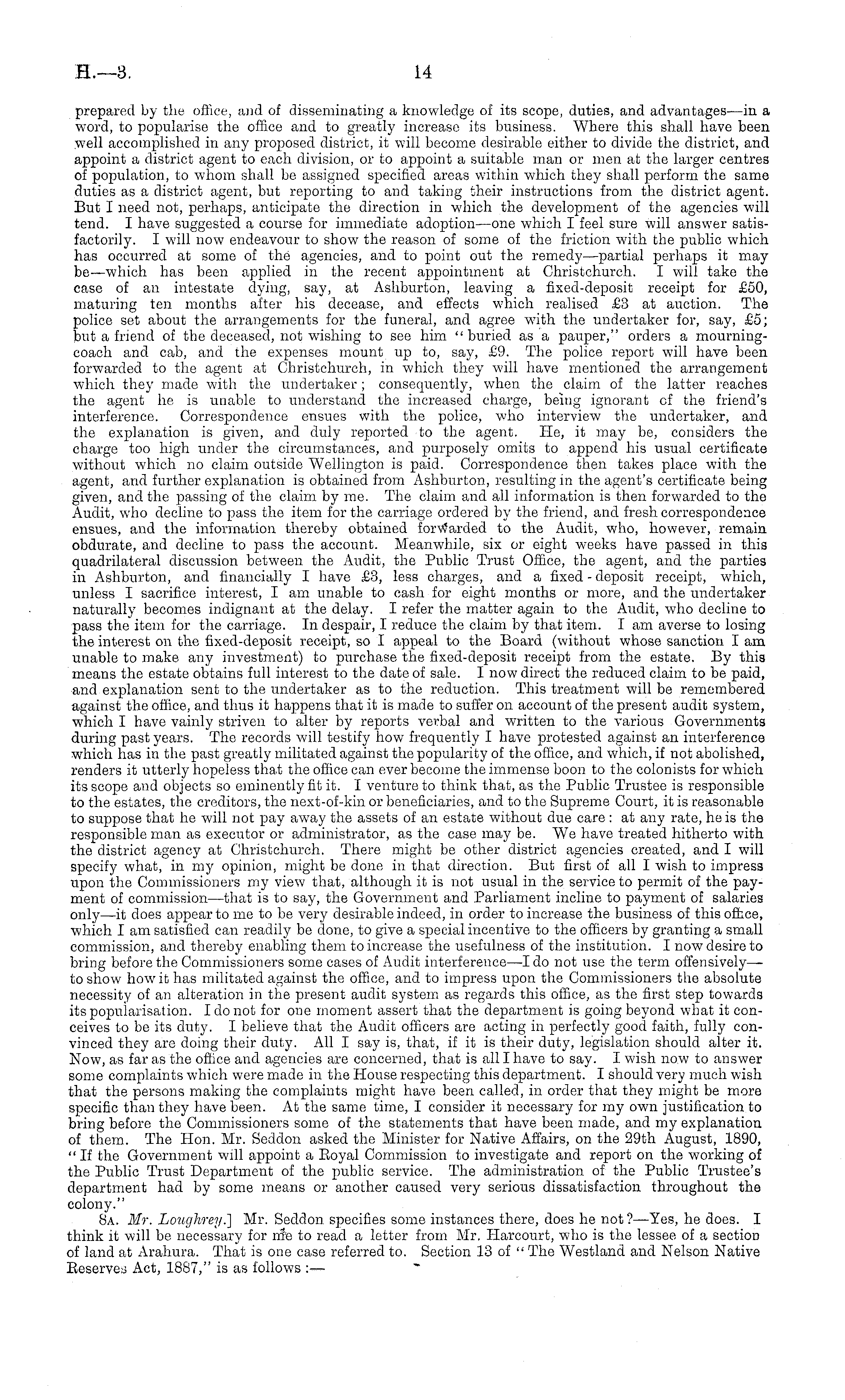 prepared by the office, and of disseminating a knowledge of its scope, duties, and advantages—in a word, to popularise the office and to greatly increase its business. Where this shall have been well accomplished in any proposed district, it will become desirable either to divide the district, and appoint a district agent to each division, or to appoint a suitable man or men at the larger centres of population, to whom shall be assigned specified areas within which they shall perform the same duties as a district agent, but reporting to and taking their instructions from the district agent. But I need not, perhaps, anticipate the direction in which the development of the agencies will tend. I have suggested a course for immediate adoption—one which I feel sure will answer satisfactorily. I will now endeavour to show the reason of some of the friction with the public which has occurred at some of the agencies, and to point out the remedy—partial perhaps it may be—which has been applied in the recent appointment at Christchurch. I will take the case of an intestate dying, say, at Ashburton, leaving a fixed-deposit receipt for £50, maturing ten months after his decease, and effects which realised £3 at auction. The police set about the arrangements for the funeral, and agree with the undertaker for, say, £5; but a friend of the deceased, not wishing to see him " buried as a pauper," orders a mourningcoach and cab, and the expenses mount up to, say, £9. The police report will have been forwarded to the agent at Christchurch, in which they will have mentioned the arrangement which they made with the undertaker; consequently, when the claim of the latter reaches the agent he is unable to understand the increased charge, being ignorant of the friend's interference. Correspondence ensues with the police, who interview the undertaker, and the explanation is given, and duly reported to the agent. He, it may be, considers the charge too high under the circumstances, and purposely omits to append his usual certificate without which no claim outside Wellington is paid. Correspondence then takes place with the agent, and further explanation is obtained from Ashburton, resulting in the agent's certificate being given, and the passing of the claim by me. The claim and all information is then forwarded to the Audit, who decline to pass the item for the carriage ordered by the friend, and fresh correspondence ensues, and the information thereby obtained forvvarded to the Audit, who, however, remain obdurate, and decline to pass the account. Meanwhile, six or eight weeks have passed in this quadrilateral discussion between the Audit, the Public Trust Office, the agent, and the parties in Ashburton, and financially I have £3, less charges, and a fixed - deposit receipt, which, unless I sacrifice interest, I am unable to cash for eight months or more, and the undertaker naturally becomes indignant at the delay. I refer the matter again to the Audit, who decline to pass the item for the carriage. In despair, I reduce the claim by that item. lam averse to losing the interest on the fixed-deposit receipt, so I appeal to the Board (without whose sanction I am unable to make any investment) to purchase the fixed-deposit receipt from the estate. By this means the estate obtains full interest to the date of sale. I now direct the reduced claim to be paid, and explanation sent to the undertaker as to the reduction. This treatment will be remembered against the office, and thus it happens that it is made to suffer on account of the present audit system, which I have vainly striven to alter by reports verbal and written to the various Governments during past years. The records will testify how frequently I have protested against an interference which has in the past greatly militated against the popularity of the office, and which, if not abolished, renders it utterly hopeless that the office can ever become the immense boon to the colonists for which its scope and objects so eminently fit it. I venture to think that, as the Public Trustee is responsible to the estates, the creditors, the next-of-kin or beneficiaries, and to the Supreme Court, it is reasonable to suppose that he will not pay away the assets of an estate without due care: at any rate, he is the responsible man as executor or administrator, as the case may be. We have treated hitherto with the district agency at Christchurch. There might be other district agencies created, and I will specify what, in my opinion, might be done in that direction. But first of all I wish to impress upon the Commissioners my view that, although it is not usual in the service to permit of the payment of commission—that is to say, the Government and Parliament incline to payment of salaries only—it does appear to me to be very desirable indeed, in order to increase the business of this office, which I am satisfied can readily be done, to give a special incentive to the officers by granting a small commission, and thereby enabling them to increase the usefulness of the institution. I now desire to bring before the Commissioners some cases of Audit interference —I do not use the term offensively— to show how it has militated against the office, and to impress upon the Commissioners the absolute necessity of an alteration in the present audit system as regards this office, as the first step towards its popularisation. Ido not for one moment assert that the department is going beyond what it conceives to be its duty. I believe that the Audit officers are acting in perfectly good faith, fully convinced they are doing their duty. All I say is, that, if it is their duty, legislation should alter it. Now, as far as the office and agencies are concerned, that is all I have to say. I wish now to answer some complaints which were made in the House respecting this department. I should very much wish that the persons making the complaints might have been called, in or