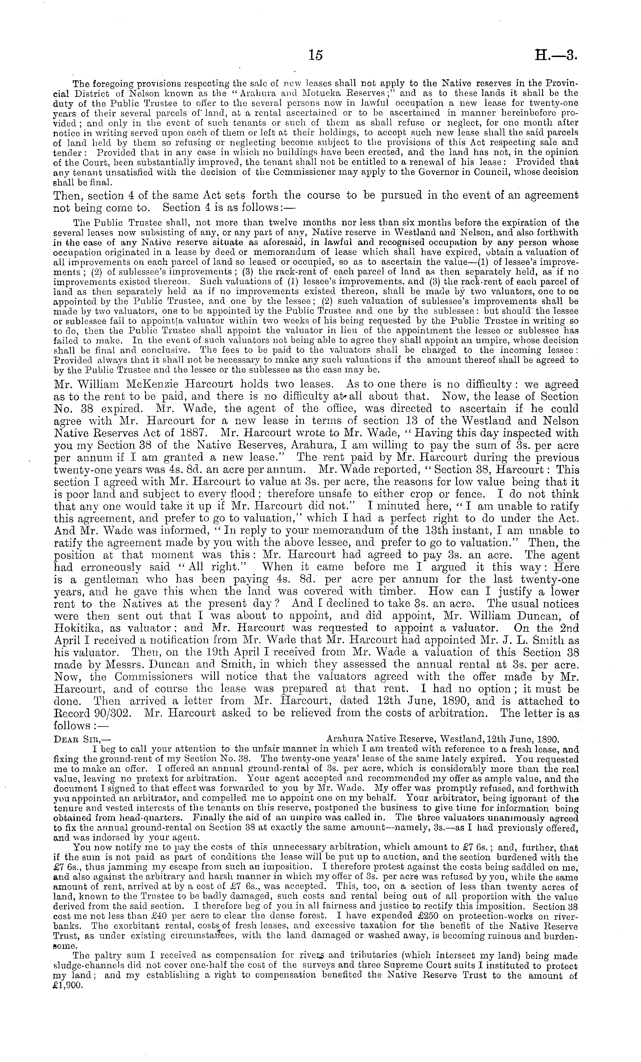The foregoing provisions respecting the sale of new leases shall not apply to the Native reserves in the Provincial District of Nelson known as the " Arahura and Motueka Eeserves;" and as to these lands it shall be the duty of the Public Trustee to offer to the several persons now in lawful occupation a new lease for twenty-one years of their several parcels of land, at a rental ascertained or to be ascertained in manner hereinbefore provided ; and only in the event of such tenants or such of them as shall refuse or neglect, for one month after notice in writing served upon each of them or left at their holdings, to accept such new lease shall the said parcels of land held by them so refusing or neglecting become subject to tho provisions of this Act respecting sale and tender : Provided that in any case in which no buildings have been erected, and the land has not, in the opinion of the Court, been substantially improved, the tenant shall not be entitled to a renewal of his lease : Provided that any tenant unsatisfied with the decision of the Commissioner may apply to the Governor in Council, whose decision shall be final. Then, section 4 of the same Act sets forth the course to be pursued in the event of an agreement not being come to. Section 4is as follows: — The Public Trustee shall, not more than twelve months nor less than six months before the expiration of the several leases now subsisting of any, or any part of any, Native reserve in Westland and Nelson, and also forthwith in the case of any Native reserve situate as aforesaid, in lawful and recognised occupation by any person whose occupation originated in a lease by deed or memorandum of lease which shall have expired, obtain a valuation of all improvements on each parcel of land so leased or occupied, so as to ascertain the value—(l) of lessee's improvements ; (2) of sublessee's improvements ; (3) the rack-rent of each parcel of land as then separately held, as if no improvements existed thereon. Such valuations of (1) lessee's improvements, and (3) the rack-rent of each parcel of land as then separately held as if no improvements existed thereon, shall be made by two valuators, one to De appointed by the Public Trustee, and one by the lessee; (2) such valuation of sublessee's improvements shall he made by two valuators, one to be appointed by the Public Trustee and one by the sublessee : but should' the lessee or sublessee fail to appointSa valuator within two weeks of his being requested by the Public Trustee in writing so to do, then the Public Trustee shall appoint the valuator in lieu of the appointment the lessee or sublessee has failed to make. In the event of such valuators not being able to agree they shall appoint an umpire, whose decision shall be final and conclusive. The fees to be paid to the valuators shall be charged to the incoming lessee: Provided always that it shall not be necessary to make any such valuations if the amount thereof shall be agreed to by the Public Trustee and the lessee or the sublessee as the case may be. Mr. William McKenzie Harcourt holds two leases. As to one there is no difficulty :we agreed as to the rent to be paid, and there is no difficulty at'all about that. Now, the lease of Section No. 38 expired. Mr. Wade, the agent of the office, was directed to ascertain if he could agree with Mr. Harcourt for a new lease in terms of section 13 of the Westland and Nelson Native Eeserves Act of 1887. Mr. Harcourt wrote to Mr. Wade, " Having this day inspected with you my Section 38 of the Native Eeserves, Arahura, I am willing to pay the sum of 3s. per acre per annum if lam granted a new lease." The rent paid by Mr. Harcourt during the previous twenty-one years was 4s. Bd. an acre per annum. Mr. Wade reported, " Section 38, Harcourt: This section I agreed with Mr. Harcourt to value at 3s. per acre, the reasons for low value being that it is poor land and subject to every flood; therefore unsafe to either crop or fence. I do not think that any one would take it up if Mr. Harcourt did not." I minuted here, " I am unable to ratify this agreement, and prefer to go to valuation," which I had a perfect right to do under the Act. And Mr. Wade was informed, " In reply to your memorandum of the 13th instant, I am unable to ratify the agreement made by you with the above lessee, and prefer to go to valuation." Then, the position at that moment was this : Mr. Harcourt had agreed to pay 3s. an acre. The agent had erroneously said "All right." When it came before me I argued it this way: Here is a gentleman who has been paying 4s. Bd. per acre per annum for the last twenty-one years, and he gave this when the land was covered with timber. How can I justify a lower rent to the Natives at the present day ? And I declined to take 3s. an acre. The usual notices were then sent out that I was about to appoint, and did appoint, Mr. William Duncan, of Hokitika, as valuator; and Mr. Harcourt was requested to appoint a valuator. On the 2nd April I received a notification from Mr. Wade that Mr. Harcourt had appointed Mr. J. L. Smith as his valuator. Then, on the 19th April I received from Mr. Wade a valuation of this Section 38 made by Messrs. Duncan and Smith, in which they assessed the annual rental at 3s. per acre. Now, the Commissioners will notice that the valuators agreed with the offer made by Mr. Harcourt, and of course the lease was prepared at that rent. I had no option; it must be done. Then arrived a letter from Mr. Harcourt, dated 12th June, 1890, and is attached to Eecord 90/302. Mr. Harcourt asked to be relieved from the costs of arbitration. The letter is as follows :— Deab Sib, — Arahura Native Reserve, Westland, 12th June, 1890. I beg to call your attention to the unfair manner in which I am treated with reference to a fresh lease, and fixing the ground-rent of my Section No. 38. The twenty-one years' lease of the same lately expired. You requested me to make an offer. I offered an annual 