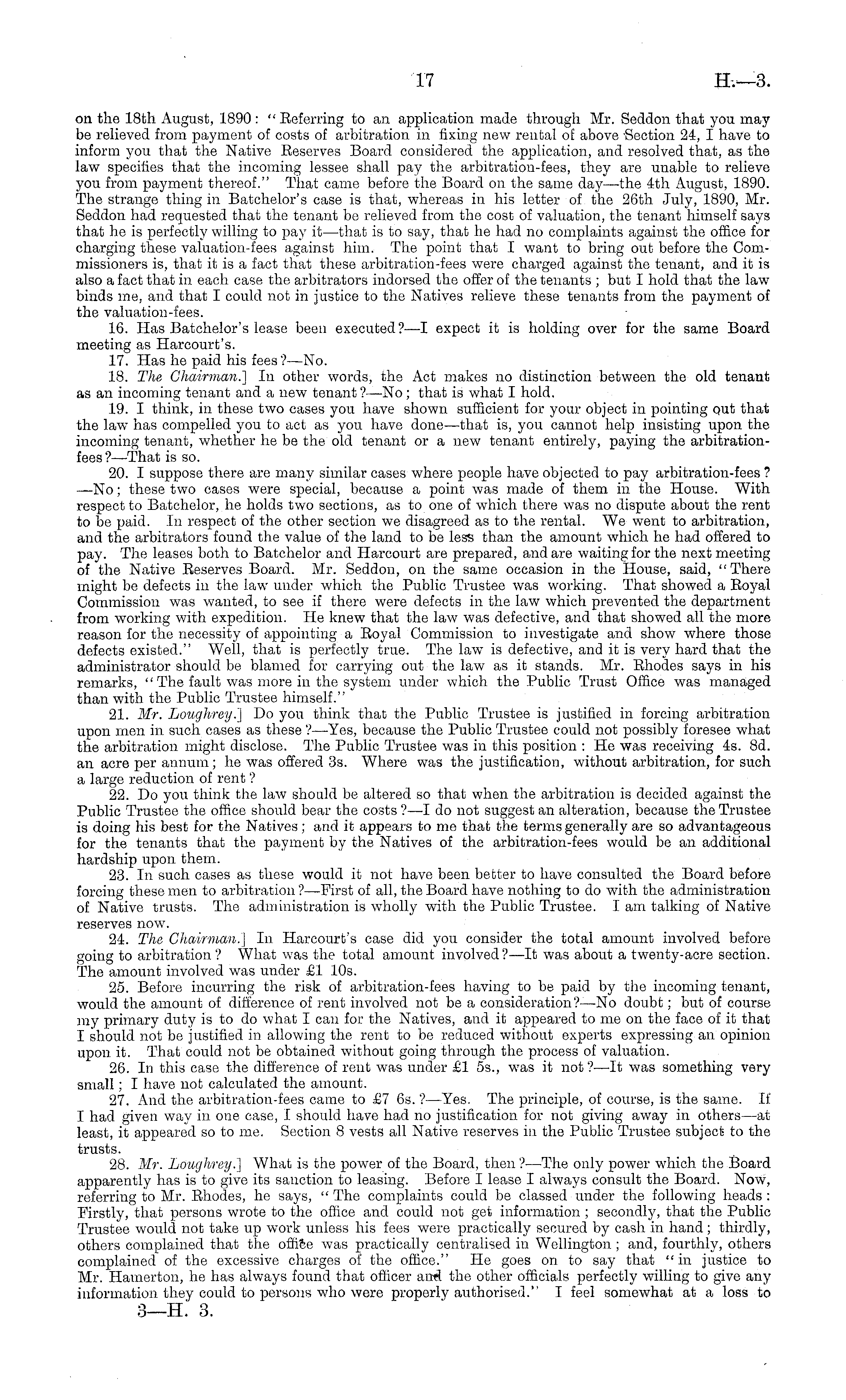 on the 18th August, 1890: " Eeferring to an application made through Mr. Seddon that you may be relieved from payment of costs of arbitration in fixing new rental of above Section 24, I have to inform you that the Native Eeserves Board considered the application, and resolved that, as the law specifies that the incoming lessee shall pay the arbitration-fees, they are unable to relieve you from payment thereof." That came before the Board on the same day —the 4th August, 1890. The strange thing in Batchelor's case is that, whereas in his letter of the 26th July, 1890, Mr. Seddon had requested that the tenant be relieved from the cost of valuation, the tenant himself says that he is perfectly willing to pay it—that is to say, that he had no complaints against the office for charging these valuation-fees against him. The point that I want to bring out before the Commissioners is, that it is a fact that these arbitration-fees were charged against the tenant, and it is also a fact that in each case the arbitrators indorsed the offer of the tenants ; but I hold that the law binds me, and that I could not in justice to the Natives relieve these tenants from the payment of the valuation-fees. 16. Has Batchelor's lease been executed?—l expect it is holding over for the same Board meeting as Harcourt's. 17. Has he paid his fees?— No. 18. The Chairman.] In other words, the Act makes no distinction between the old tenant as an incoming tenant and a new tenant ?—No; that is what I hold. 19. I think, in these two cases you have shown sufficient for your object in pointing out that the law has compelled you to act as you have done—that is, you cannot help insisting upon the incoming tenant, whether he be the old tenant or a new tenant entirely, paying the arbitrationfees? —That is so. 20. I suppose there are many similar cases where people have objected to pay arbitration-fees ? —No; these two cases were special, because a point was made of them in the House. With respect to Batchelor, he holds two sections, as to one of which there was no dispute about the rent to be paid. In respect of the other section we disagreed as to the rental. We went to arbitration, and the arbitrators found the value of the land to be less than the amount which he had offered to pay. The leases both to Batchelor and Harcourt are prepared, and are waiting for the next meeting of the Native Eeserves Board. Mr. Seddon, on the same occasion in the House, said, "There might be defects in the law under which the Public Trustee was working. That showed a Eoyal Commission was wanted, to see if there were defects in the law which prevented the department from working with expedition. He knew that the law was defective, and that showed all the more reason for the necessity of appointing a Eoyal Commission to investigate and show where those defects existed." Well, that is perfectly true. The law is defective, and it is very hard that the administrator should be blamed for carrying out the law as it stands. Mr. Ehodes says in his remarks, " The fault was more in the system under which the Public Trust Office was managed than with the Public Trustee himself." 21. Mr. Loughrey.] Do you think that the Public Trustee is justified in forcing arbitration upon men in such cases as these ?—Yes, because the Public Trustee could not possibly foresee what the arbitration might disclose. The Public Trustee was in this position :He was receiving 4s. Bd. an acre per annum ; he was offered 3s. Where was the justification, without arbitration, for such a large reduction of rent ? 22. Do you think the law should be altered so that when the arbitration is decided against the Public Trustee the office should bear the costs ?—I do not suggest an alteration, because the Trustee is doing his best for the Natives; and it appears to me that the terms generally are so advantageous for the tenants that the payment by the Natives of the arbitration-fees would be an additional hardship upon them. 23. In such cases as these would it not have been better to have consulted the Board before forcing these men to arbitration ? —First of all, the Board have nothing to do with the administration of Native trusts. The administration is wholly with the Public Trustee. lam talking of Native reserves now. 24. The Chairman.] In Harcourt's case did you consider the total amount involved before going to arbitration? What was the total amount involved? —It was about a twenty-acre section. The amount involved was under £1 10s. 25. Before incurring the risk of arbitration-fees having to be paid by the incoming tenant, would the amount of difference of rent involved not be a consideration?—No doubt; but of course my primary duty is to do what I can for the Natives, and it appeared to me on the face of it that I should not be justified in allowing the rent to be reduced without experts expressing an opinion upon. it. That could not be obtained without going through the process of valuation. 26. In this case the difference of rent was under £1 55., was it not?—lt was something very small; I have not calculated the amount. 27. And the arbitration-fees came to £7 6s. ?—Yes. The principle, of course, is the same. If I had given way in one case, I should have had no justification for not giving away in others—at least, it appeared so to me. Section 8 vests all Native reserves in the Public Trustee subject to the trusts. 28. Mr. Loughrey.} What is the power of the Board, then?— The only power which the Board apparently has is to give its sanction to leasing. Before I lease I always consult the Board. Now, referring to Mr. Ehodes, he says, " The complaints could be classed under the following heads : Firstly, that persons wrote to the office and could not get information ; secondly, that the Public Trustee would not take up work unless his fees were practically secured by cash in hand ; thirdly, others complained that the office was practically centrali