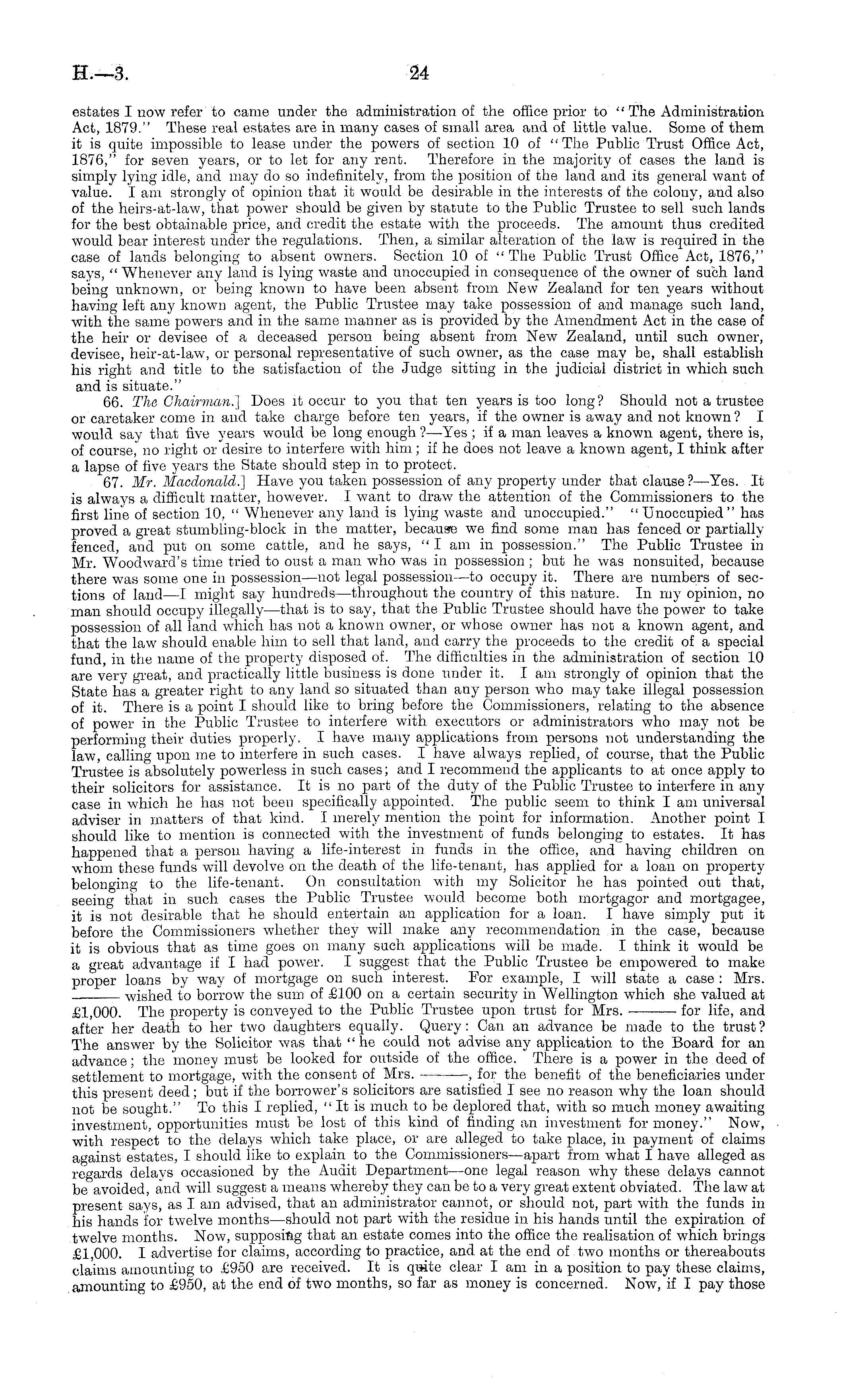 estates I now refer to came under the administration of the office prior to " The Administration Act, 1879." These real estates are in many cases of small area and of little value. Some of them it is quite impossible to lease under the powers of section 10 of "The Public Trust Office Act, 1876," for seven years, or to let for any rent. Therefore in the majority of cases the land is simply lying idle, and may do so indefinitely, from the position of the land and its general want of value. lam strongly of opinion that it would be desirable in the interests of the colony, and also of the heirs-at-law, that power should be given by statute to the Public Trustee to sell such lands for the best obtainable price, and credit the estate with the proceeds. The amount thus credited would bear interest under the regulations. Then, a similar alteration of the law is required in the case of lands belonging to absent owners. Section 10 of "The Public Trust Office Act, 1876," says, " Whenever any land is lying waste and unoccupied in consequence of the owner of such land being unknown, or being known to have been absent from New Zealand for ten years without having left any known agent, the Public Trustee may take possession of and manage such land, with the same powers and in the same manner as is provided by the Amendment Act in the case of the heir or devisee of a deceased person being absent from New Zealand, until such owner, devisee, heir-at-law, or personal representative of such owner, as the case may be, shall establish his right and title to the satisfaction of the Judge sitting in the judicial district in which such and is situate." 66. The Chairman.} Does it occur to you that ten years is too long? Should not a trustee or caretaker come in and take charge before ten years, if the owner is away and not known ? I would say that five years would be long enough ?—Yes ; if a man loaves a known agent, there is, of course, no right or desire to interfere with him; if he does not leave a known agent, I think after a lapse of five years the State should step in to protect. 67. Mr. Macdonald.} Have you taken possession of any property under that clause?— Yes. It is always a difficult matter, however. I want to draw the attention of the Commissioners to the first line of section 10, " Whenever any land is lying waste and unoccupied." " Unoccupied" has proved a great stumbling-block in the matter, because we find some man has fenced or partially fenced, and put on some cattle, and he says, " I am in possession." The Public Trustee in Mr. Woodward's time tried to oust a man who was in possession ; but he was nonsuited, because there was some one in possession—not legal possession—to occupy it. There are numbers of sections of land —I might say hundreds —throughout the country of this nature. In my opinion, no man should occupy illegally —that is to say, that the Public Trustee should have the power to take possession of all land which has not a known owner, or whose owner has not a known agent, and that the law should enable him to sell that land, and carry the proceeds to the credit of a special fund, in the name of the property disposed of. The difficulties in the administration of section 10 are very great, and practically little business is done under it. I am strongly of opinion that the State has a greater right to any land so situated than any person who may take illegal possession of it. There is a point I should like to bring before the Commissioners, relating to the absence of power in the Public Trustee to interfere with executors or administrators who may not be performing their duties properly. I have many applications from persons not understanding the law, calling upon me to interfere in such cases. I have always replied, of course, that the Public Trustee is absolutely powerless in such cases; and I recommend the applicants to at once apply to their solicitors for assistance. It is no part of the duty of the Public Trustee to interfere in any case in which he has not been specifically appointed. The public seem to think lam universal adviser in matters of that kind. I merely mention the point for information. Another point I should like to mention is connected with the investment of funds belonging to estates. It has happened that a person having a life-interest in funds in the office, and having children on whom these funds will devolve on the death of the life-tenant, has applied for a loan on property belonofng to the life-tenant. On consultation with my Solicitor he has pointed out that, seeing that in such cases the Public Trustee would become both mortgagor and mortgagee, it is not desirable that he should entertain an application for a loan. I have simply put it before the Commissioners whether they will make any recommendation in. the case, because it is obvious that as time goes on many such applications will be made. I think it would be a great advantage if I had power. I suggest that the Public Trustee be empowered to make proper loans by way of mortgage on such interest. For example, I will state a case : Mrs. wished to borrow the sum of £100 on a certain security in Wellington which she valued at £1,000. The property is conveyed to the Public Trustee upon trust for Mrs. for life, and after her death to her two daughters equally. Query: Can an advance be made to the trust? The answer by the Solicitor was that " he could not advise any application to the Board for an advance; the money must be looked for outside of the office. There is a power in the deed of settlement to mortgage, with the consent of Mrs. , for the benefit of the beneficiaries under this present deed; but if the borrower's solicitors are satisfied I see no reason why the loan should not be sought." To this I replied, "It is much to be deplored that, with so much money awaiting investment, opportunities must be lost of this kind of finding an investment for money." Now, with respect to the delay