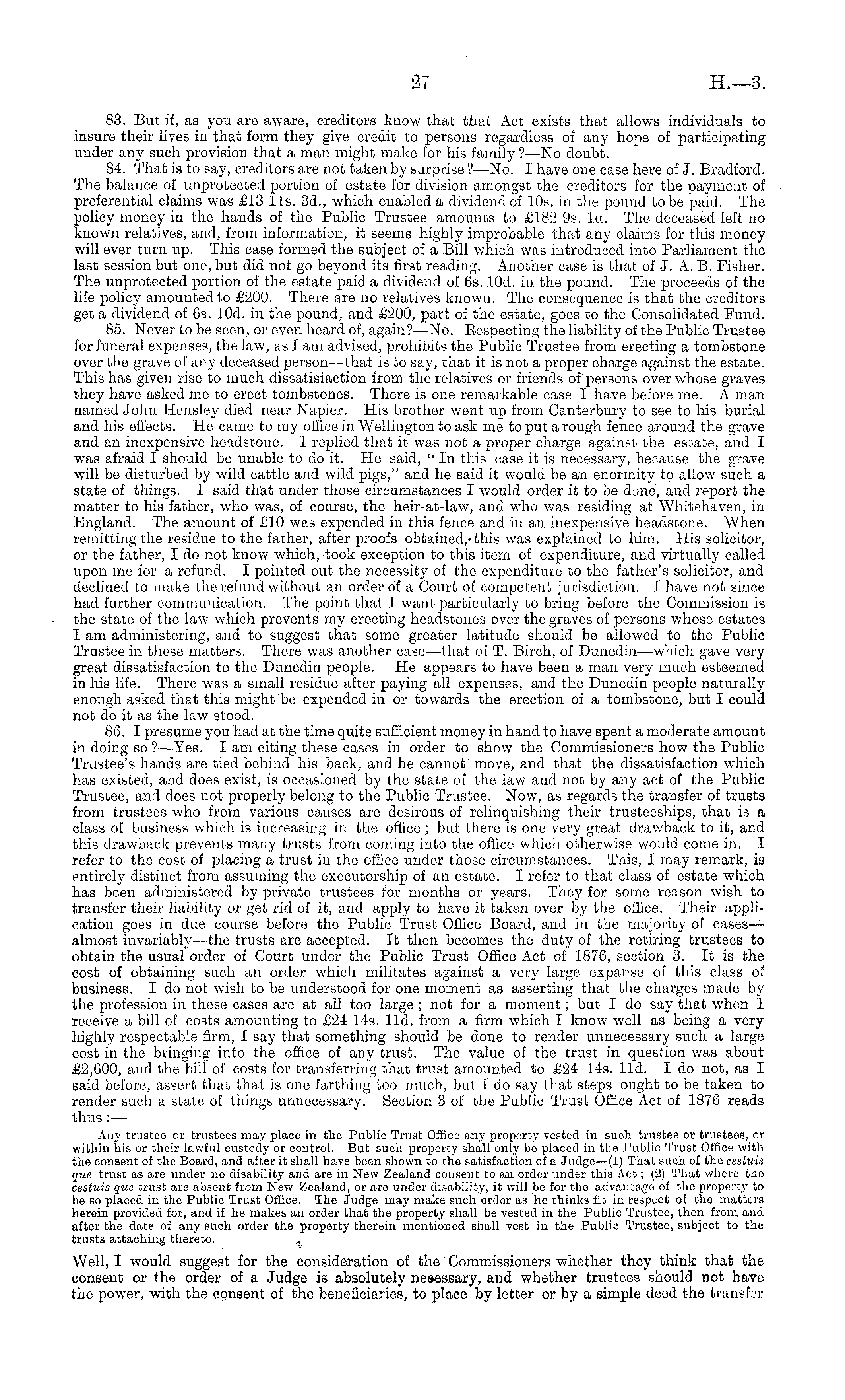 83. But if, as you are aware, creditors know that that Act exists that allows individuals to insure their lives in that form they give credit to persons regardless of any hope of participating under any such provision that a man might make for his family ? —No doubt. 84. That is to say, creditors are not taken by surprise ?—No. I have one case here of J. Bradford. The balance of unprotected portion of estate for division amongst the creditors for the payment of preferential claims was £13 lis. 3d., which enabled a dividend of 10s. in the pound to be paid. The policy money in the hands of the Public Trustee amounts to £182 9s. Id. The deceased left no known relatives, and, from information, it seems highly improbable that any claims for this money will ever turn up. This case formed the subject of a Bill which was introduced into Parliament the last session but one, but did not go beyond its first reading. Another case is that of J. A. B. Fisher. The unprotected portion of the estate paid a dividend of 6s. lOd. in the pound. The proceeds of the life policy amounted to £200. There are no relatives known. The consequence is that the creditors get a dividend of 6s. lOd. in the pound, and £200, part of the estate, goes to the Consolidated Fund. 85. Never to be seen, or even heard of, again?— No. Eespecting the liability of the Public Trustee for funeral expenses, the law, as I am advised, prohibits the Public Trustee from erecting a tombstone over the grave of any deceased person —that is to say, that it is not a proper charge against the estate. This has given rise to much dissatisfaction from the relatives or friends of persons over whose graves they have asked me to erect tombstones. There is one remarkable case I have before me. A man named John Hensley died near Napier. His brother went up from Canterbury to see to his burial and his effects. He came to my office in Wellington to ask me to put a rough fence around the grave and an inexpensive headstone. I replied that it was not a proper charge against the estate, and I was afraid I should be unable to do it. He said, "In this case it is necessary, because the grave will be disturbed by wild cattle and wild pigs," and he said it would be an enormity to allow such a state of things. I said that under those circumstances I would order it to be done, and report the matter to his father, who was, of course, the heir-at-law, and who was residing at Whitehaven, in England. The amount of £10 was expended in this fence and in an inexpensive headstone. When remitting the residue to the father, after proofs obtained,'this was explained to him. His solicitor, or the father, I do not know which, took exception to this item of expenditure, and virtually called upon me for a refund. I pointed out the necessity of the expenditure to the father's solicitor, and declined to make the refund without an order of a Court of competent jurisdiction. I have not since had further communication. The point that I want particularly to bring before the Commission is the state of the law which, prevents my erecting headstones over the graves of persons whose estates I am administering, and to suggest that some greater latitude should be allowed to the Public Trustee in these matters. There was another case —that of T. Birch, of Dunedm—which gave very great dissatisfaction to the Dunedin people. He appears to have been a man very much esteemed in his life. There was a small residue after paying all expenses, and the Dunedin people naturally enough asked that this might be expended in or towards the erection of a tombstone, but I could not do it as the law stood. 86. I presume you had at the time quite sufficient money in hand to have spent a moderate amount in doing so ?—-Yes. I am citing these cases in order to show the Commissioners how the Public Trustee's hands are tied behind his back, and he cannot move, and that the dissatisfaction which has existed, and does exist, is occasioned by the state of the law and not by any act of the Public Trustee, and does not properly belong to the Public Trustee. Now, as regards the transfer of trusts from trustees who from various causes are desirous of relinquishing their trusteeships, that is a class of business which is increasing in the office ; but there is one very great drawback to it, and this drawback prevents many trusts from coming into the office which otherwise would come in. I refer to the cost of placing a trust in the office under those circumstances. This, I may remark, is entirely distinct from assuming the executorship of an estate. I refer to that class of estate which has been administered by private trustees for months or years. They for some reason wish to transfer their liability or get rid of it, and apply to have it taken over by the office. Their application goes in due course before the Public Trust Office Board, and in the majority of cases— almost invariably—the trusts are accepted. It then becomes the duty of the retiring trustees to obtain the usual order of Court under the Public Trust Office Act of 1876, section 3. It is the cost of obtaining such an order which militates against a very large expanse of this class of business. I do not wish to be understood for one moment as asserting that the charges made by the profession in these cases are at all too large ; not for a moment; but I do say that when I receive a bill of costs amounting to £24 14s. lid. from a firm which I know well as being a very highly respectable firm, I say that something should be done to render unnecessary such a large cost in the bringing into the office of any trust. The value of the trust in question was about £2,600, and the bill of costs for transferring that trust amounted to £24 14s. lid. Ido not, as I said before, assert that that is one farthing too much, but I do say that steps ought to be taken to render such a state of things unnecessary. Section 3of the Public Trust Office Act of 18