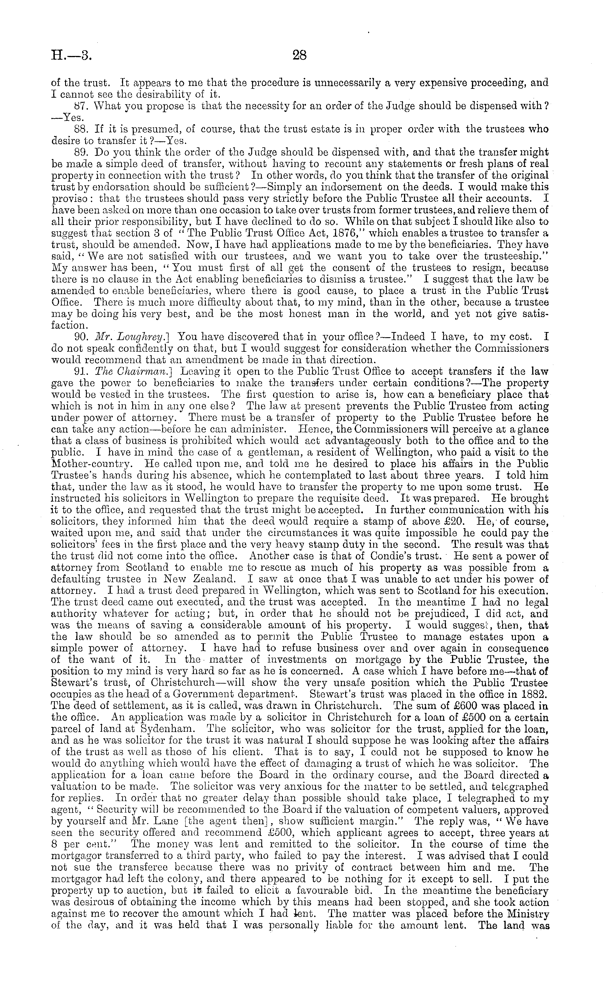 of the trust. It appears to me that the procedure is unnecessarily a very expensive proceeding, and I cannot see the desirability of it. 87. What you propose is that the necessity for an order of the Judge should be dispensed with? —Yes. 88. If it is presumed, of course, that the trust estate is in proper order with the trustees who desire to transfer it ? —Yes. 89. Do you think the order of the Judge should be dispensed with, and that the transfer might be made a simple deed of transfer, without having to recount any statements or fresh plans of real property in connection with the trust ? In other words, do you think that the transfer of the original trust by endorsation should be sufficient ?—Simply an indorsement on the deeds. I would make this proviso : that the trustees should pass very strictly before the Public Trustee all their accounts. I have been asked on more than one occasion to take over trusts from former trustees, and relieve them of all their prior responsibility, but I have declined to do so. While on that subject I should like also to suggest that section 3 of " The Public Trust Office Act, 1876," which enables a trustee to transfer a trust, should be amended. Now, I have had applications made to me by the beneficiaries. They have said, " We are not satisfied with our trustees, and we want you to take over the trusteeship." My answer has been, " You must first of all get the consent of the trustees to resign, because there is no clause in the Act enabling beneficiaries to dismiss a trustee." I suggest that the law be amended to enable beneficiaries, where there is good cause, to place a trust in the Public Trust Office. There is much more difficulty about that, to my mind, than in the other, because a trustee may be doing his very best, and be the most honest man in the world, and yet not give satisfaction. 90. Mr. Loughrey.] You have discovered that in your office?—lndeed I have, to my cost. I do not speak confidently on that, but I would suggest for consideration whether the Commissioners would recommend that an amendment be made in that direction. 91. The Chairman.] Leaving it open to the Public Trust Office to accept transfers if the law gave the power to beneficiaries to make the transfers under certain conditions?—-The property would be vested in the trustees. The first question to arise is, how can a beneficiary place that which is not in him in any one else ? The law at present prevents the Public Trustee from acting under power of attorney. There must be a transfer of property to the Public Trustee before he can take any action—before he can administer. Hence, the Commissioners will perceive at a glance that a class of business is prohibited which would act advantageously both to the office and to the public. I have in mind the case of a gentleman, a resident of Wellington, who paid a visit to the Mother-country. He called upon me, and told me he desired to place his affairs in the Public Trustee's hands during his absence, which he contemplated to last about three years. I told him that, under the law as it stood, he would have to transfer the property to me upon some trust. He instructed his solicitors in Wellington to prepare the requisite deed. It was prepared. He brought it to the office, and requested that the trust might be accepted. In further communication with his solicitors, they informed him that the deed would require a stamp of above £20. He, of course, waited upon me, and said that under the circumstances it was quite impossible he could pay the solicitors' fees in the first place and the very heavy stamp duty in the second. The result was that the trust did not come into the office. Another case is that of Condie's trust. He sent a power of attorney from Scotland to enable me to rescue as much of his property as was possible from a defaulting trustee in New Zealand. I saw at once that I was unable to act under his power of attorney. I had a trust deed prepared in Wellington, which was sent to Scotland for his execution. The trust deed came out executed, and the trust was accepted. In the meantime I had no legal authority whatever for acting; but, in order that he should not be prejudiced, I did act, and was the means of saving a considerable amount of his property. I would suggest, then, that the law should be so amended as to permit the Public Trustee to manage estates upon a simple power of attorney. I have had to refuse business over and over again in consequence of the want of it. In the matter of investments on mortgage by the Public Trustee, the position to my mind is very hard so far as he is concerned. A case which I have before me—that of Stewart's trust, of Christchurch—will show the very unsafe position which the Public Trustee occupies as the head of a Government department. Stewart's trust was placed in the office in 1882. The deed of settlement, as it is called, was drawn in Christchurch. The sum of £600 was placed in the office. An application was made by a solicitor in Christchurch for a loan of £500 on a certain parcel of land at Sydenham. The solicitor, who was solicitor for the trust, applied for the loan, and as he was solicitor for the trust it was natural I should suppose he was looking after the affairs of the trust as well as those of his client. That is to say, I could not be supposed to know he would do anything which would have the effect of damaging a trust of which he was solicitor. The application for a loan came before the Board in the ordinary course, and the Board directed a valuation to be made. The solicitor was very anxious for the matter to be settled, and telegraphed for replies. In order that no greater delay than possible should take place, I telegraphed to my agent, " Security will be recommended to the Board if the valuation of competent valuers, approved by yourself and Mr. Lane [the agent then], show sufficient margin." The reply was, "We have seen the security offered and recommen