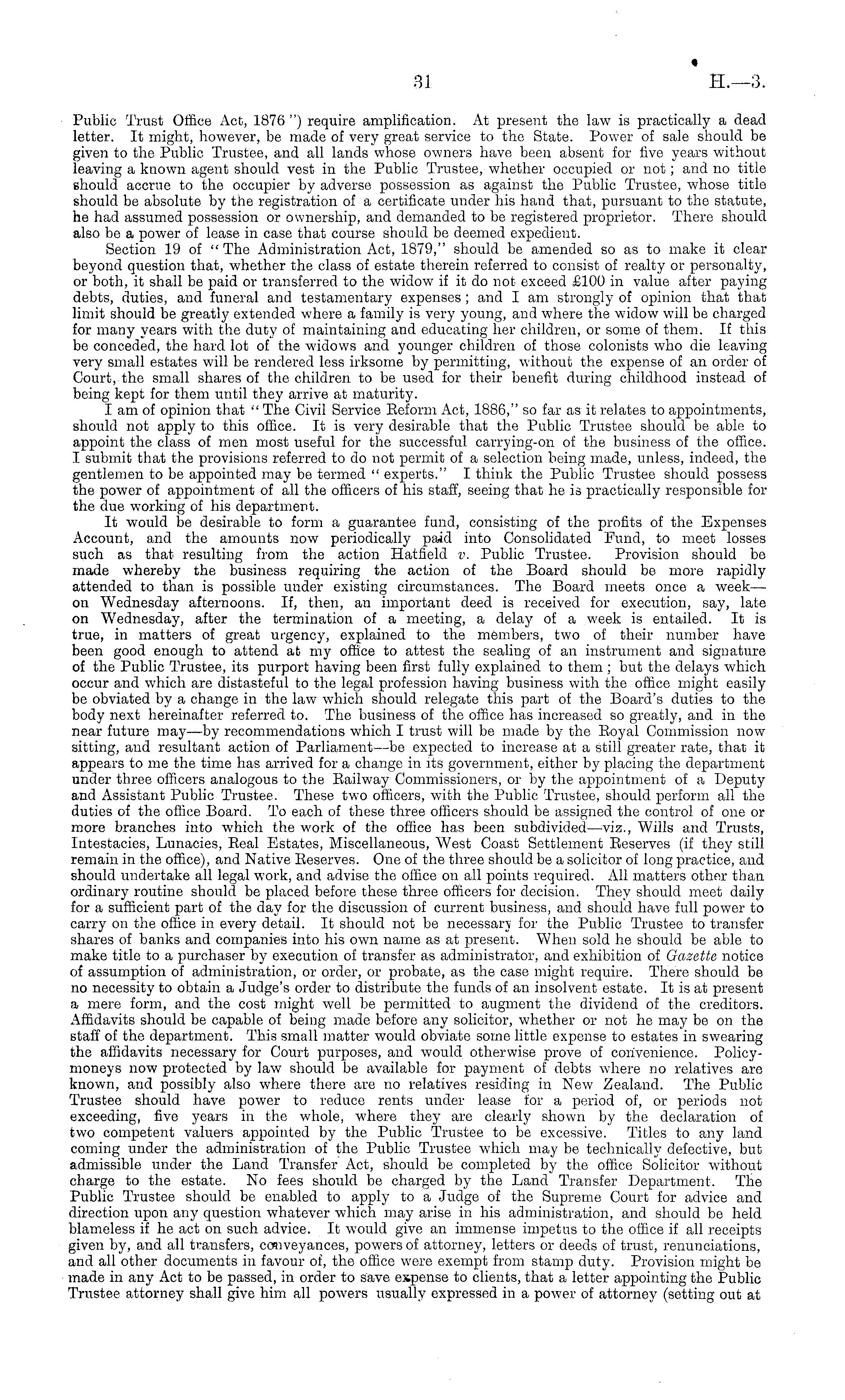 Public Trust Office Act, 1876 ") l'equire amplification. At present the law is practically a dead letter. It might, however, be made of very great service to the State. Power of sale should be given to the Public Trustee, and all lands whose owners have been absent for five years without leaving a known agent should vest in the Public Trustee, whether occupied or not ; and no title should accrue to the occupier by adverse possession as against the Public Trustee, whose title should be absolute by the registration of a certificate under his hand that, pursuant to the statute, he had assumed possession or ownership, and demanded to be registered proprietor. There should also be a power of lease in case that course should be deemed expedient. Section 19 of "The Administration Act, 1879," should be amended so as to make it clear beyond question that, whether the class of estate therein referred to consist of realty or personalty, or both, it shall be paid or transferred to the widow if it do not exceed £100 in value after paying debts, duties, and funeral and testamentary expenses ; and I am strongly of opinion that that limit should be greatly extended where a family is very young, and where the widow will be charged for many years with the duty of maintaining and educating her children, or some of them. If this be conceded, the hard lot of the widows and younger children of those colonists who die leaving very small estates will be rendered less irksome by permitting, without the expense of an order of Court, the small shares of the children to be used for their benefit during childhood instead of being kept for them until they arrive at maturity. I am of opinion that " The Civil Service Reform Act, 1886," so far as it relates to appointments, should not apply to this office. It is very desirable that the Public Trustee should be able to appoint the class of men most useful for the successful carrying-on of the business of the office. I submit that the provisions referred to do not permit of a selection being made, unless, indeed, the gentlemen to be appointed may be termed " experts." I think the Public Trustee should possess the power of appointment of all the officers of his staff, seeing that he is practically responsible for the due working of his department. It would be desirable to form a guarantee fund, consisting of the profits of the Expenses Account, and the amounts now periodically paid into Consolidated Fund, to meet losses such as that resulting from the action Hatfield v. Public Trustee. Provision should be made whereby the business requiring the action of the Board should be more rapidly attended to than is possible under existing circumstances. The Board meets once a week— on Wednesday afternoons. If, then, an important deed is received for execution, say, late on Wednesday, after the termination of a meeting, a delay of a week is entailed. It is true, in matters of great urgency, explained to the members, two of their number have been good enough to attend at my office to attest the sealing of an instrument and signature of the Public Trustee, its purport having been first fully explained to them ; but the delays which occur and which are distasteful to the legal profession having business with the office might easily be obviated by a change in the law which should relegate this part of the Board's duties to the body next hereinafter referred to. The business of the office has increased so greatly, and in the near future may—by recommendations which I trust will be made by the Eoyal Commission now sitting, and resultant action of Parliament—be expected to increase at a still greater rate, that it appears to me the time has arrived for a change in its government, either by placing the department under three officers analogous to the Eailway Commissioners, or by the appointment of a Deputy and Assistant Public Trustee. These two officers, with the Public Trustee, should perform all the duties of the office Board. To each of these three officers should be assigned the control of one or more branches into which the work of the office has been subdivided—viz., Wills and Trusts, Intestacies, Lunacies, Eeal Estates, Miscellaneous, West Coast Settlement Eeserves (if they still remain in the office), and Native Eeserves. One of the three should be a solicitor of long practice, and should undertake all legal work, and advise the office on all points required. All matters other than ordinary routine should be placed before these three officers for decision. They should .meet daily for a sufficient part of the day for the discussion of current business, and should have full power to carry on the office in every detail. It should not be necessarj for the Public Trustee to transfer shares of banks and companies into his own name as at present. When sold he should be able to make title to a purchaser by execution of transfer as administrator, and exhibition of Gazette notice of assumption of administration, or order, or probate, as the case might require. There should be no necessity to obtain a Judge's order to distribute the funds of an insolvent estate. It is at present a mere form, and the cost might well be permitted to augment the dividend of the creditors. Affidavits should be capable of being made before any solicitor, whether or not he may be on the staff of the department. This small matter would obviate some little expense to estates in swearing the affidavits necessary for Court purposes, and would otherwise prove of convenience. Policymoneys now protected by law should be available for payment of debts where no relatives are known, and possibly also where there are no relatives residing in New Zealand. The Public Trustee should have power to reduce rents under lease for a period of, or periods not exceeding, five years in the whole, where they are clearly shown by the declaration of two competent valuers appointed by the Public Trustee to be excessive. Titles to an