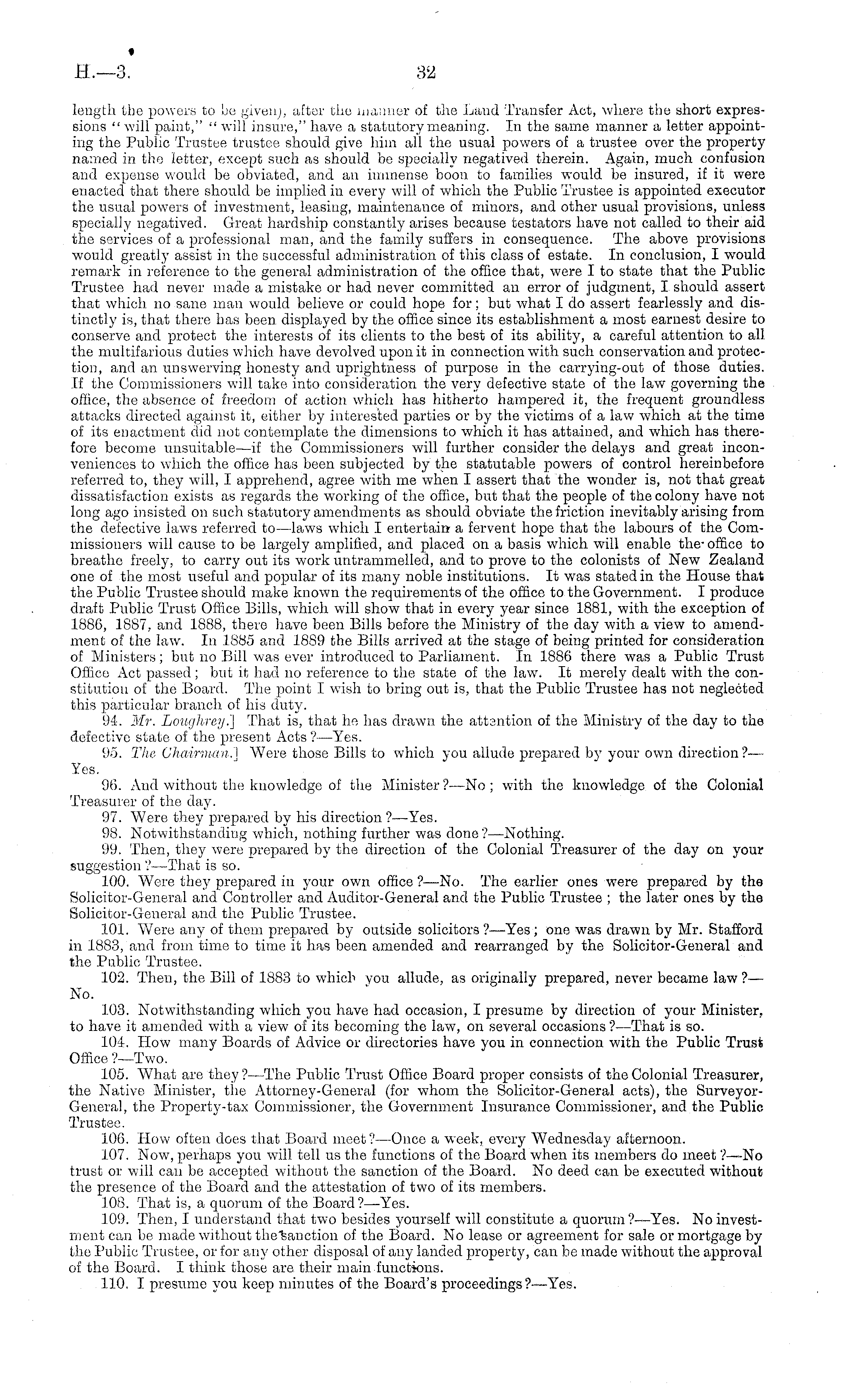 length the powers to bo given), after the manner of the Land Transfer Act, where the short expressions " will paint," " will insure," have a statutory meaning. In the same manner a letter appointing the Public Trustee trustee should give him all the usual powers of a trustee over the property named in the letter, except such as should be specially negatived therein. Again, much confusion and expense would be obviated, and an immense boon to families would be insured, if it were enacted that there should be implied in every will of which the Public Trustee is appointed executor the usual powers of investment, leasing, maintenance of minors, and other usual provisions, unless specially negatived. Great hardship constantly arises because testators have not called to their aid the services of a professional man, and the family suffers in consequence. The above provisions would greatly assist in the successful administration of this class of estate. In conclusion, I would remark in reference to the general administration of the office that, were I to state that the Public Trustee had never made a mistake or had never committed an error of judgment, I should assert that which no sane man would believe or could hope for; but what Ido assert fearlessly and distinctly is, that there has been displayed by the office since its establishment a most earnest desire to conserve and protect the interests of its clients to the best of its ability, a careful attention to all the multifarious duties which have devolved upon it in connection with such conservation and protection, and an unswerving honesty and uprightness of purpose in the carrying-out of those duties. If the Commissioners will take into consideration the very defective state of the law governing the office, the absence of freedom of action which has hitherto hampered it, the frequent groundless attacks directed against it, either by interested parties or by the victims of a law which at the time of its enactment did not contemplate the dimensions to which it has attained, and which has therefore become unsuitable—if the Commissioners will further consider the delays and great inconveniences to which the office has been subjected by the statutable powers of control hereinbefore referred to, they will, I apprehend, agree with me when I assert that the wonder is, not that great dissatisfaction exists as regards the working of the office, but that the people of the colony have not long ago insisted on such statutory amendments as should obviate the friction inevitably arising from the defective laws referred to —laws which I entertain a fervent hope that the labours of the Commissioners will cause to be largely amplified, and placed on a basis which will enable the- office to breathe freely, to carry out its work untrammelled, and to prove to the colonists of New Zealand one of the most useful and popular of its many noble institutions. It was stated in the House that the Public Trustee should make known the requirements of the office to the Government. I produce draft Public Trust Office Bills, which will show that in every year since 1881, with the exception of 1886, 1887, and 1888, there have been Bills before the Ministry of the day with a view to amendment of the law. In 1885 and 1889 the Bills arrived at the stage of being printed for consideration of Ministers; but no Bill was ever introduced to Parliament. In 1886 there was a Public Trust Office Act passed; but it had no reference to the state of the law. It merely dealt with the constitution of the Board. The point I wish to bring out is, that the Public Trustee has not neglected this particular branch of his duty. 94. Mr. Loughrey.] That is, that he has drawn the attention of the Ministry of the day to the defective state of the present Acts ?—Yes. 95. The Chairman.} Were those Bills to which you aliude prepared by your own direction?— Yes. 96. And without the knowledge of the Minister ?—No; with the knowledge of the Colonial Treasurer of the day. 97. Were they prepared by his direction?— Yes. 98. Notwithstanding which, nothing further was done ?—Nothing. 99. Then, they were prepared by the direction of the Colonial Treasurer of the day on your suggestion ?—That is so. 100. Were they prepared in your own office ? —No. The earlier ones were prepared by the Solicitor-General and Controller and Auditor-General and the Public Trustee ; the later ones by the Solicitor-General and the Public Trustee. 101. Were any of them prepared by outside solicitors? —Yes; one was drawn by Mr. Stafford in 1883, and from time to time it has been amended and rearranged by the Solicitor-General and the Public Trustee. 102. Then, the Bill of 1883 to which you allude, as originally prepared, never became law ?— No. 103. Notwithstanding which you have had occasion, I presume by directiou of your Minister, to have it amended with a view of its becoming the law, on several occasions ? —That is so. 104. How many Boards of Advice or directories have you in connection with the Public Trust Office ?—Two. 105. What are they?— The Public Trust Office Board proper consists of the Colonial Treasurer, the Native Minister, the Attorney-General (for whom the Solicitor-General acts), the SurveyorGeneral, the Property-tax Commissioner, the Government Insurance Commissioner, and the Public Trustee. 106. How often does that Board meet ?—Once a week, every Wednesday afternoon. 107. Now, perhaps you will tell us the functions of the Board when its members do meet ?—No trust or will can be accepted without the sanction of the Board. No deed can be executed without the presence of the Board and the attestation of two of its members. 108. That is, a quorum of the Board?— Yes. 109. Then, I understand that two besides yourself will constitute a quorum ? —Yes. No investment can be made without the'feanction of the Board. No lease or agreement for sale or mortgage by the Public Trustee, or for any ot