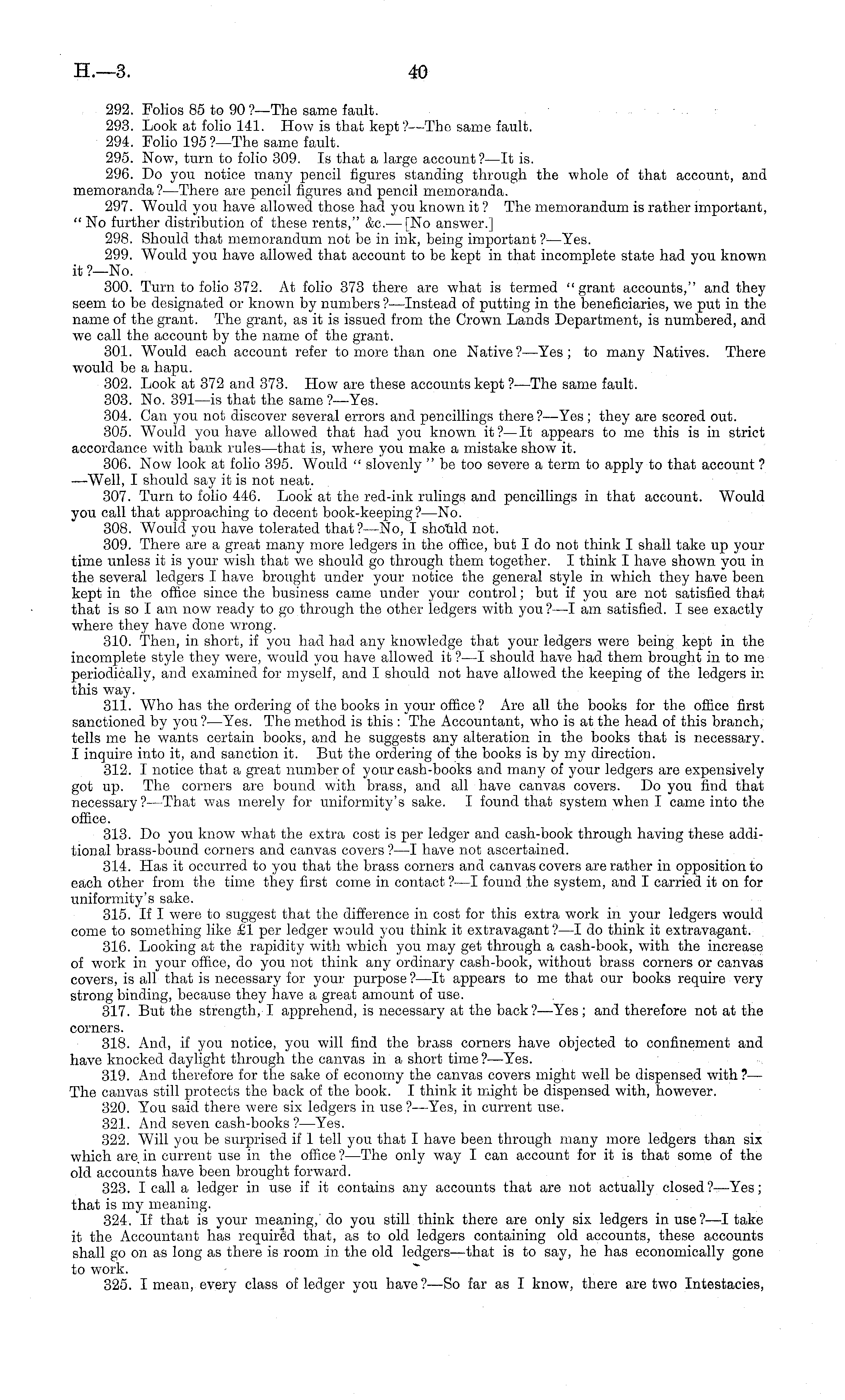 292. Folios 85 to 90?— The same fault. 293. Look at folio 141. How is that kept ?—The same fault. 294. Folio 195?— The same fault. 295. Now, turn to folio 309. Is that a large account ? —lt is. 296. Do you notice many pencil figures standing through the whole of that account, and memoranda?— There are pencil figures and pencil memoranda. 297. Would you have allowed those had you known it ? The memorandum is rather important, "No further distribution of these rents," &c. — [No answer.] 298. Should that memorandum not be in ink, being important ? —Yes. 299. Would you have allowed that account to be kept in that incomplete state had you known it ?—No. 300. Turn to folio 372. At folio 373 there are what is termed "grant accounts," and they seem to be designated or known by numbers ?—lnstead of putting in the beneficiaries, we put in the name of the grant. The grant, as it is issued from the Crown Lands Department, is numbered, and we call the account by the name of the grant. 301. Would each account refer to more than one Native? —Yes; to many Natives. There would be a hapu. 302. Look at 372 and 373. How are these accounts kept ?—The same fault. 303. No. 391—is that the same ?—Yes. 304. Can you not discover several errors and pencillings there?— Yes; they are scored out. 305. Would you have allowed that had you known it?—lt appears to me this is in strict accordance with bank rules —that is, where you make a mistake show it. 306. Now look at folio 395. Would " slovenly " be too severe a term to apply to that account ? —Well, I should say it is not neat. 307. Turn to folio 446. Look at the red-ink rulings and pencillings in that account. Would you call that approaching to decent book-keeping?— No. 308. Would you have tolerated that?—No, I should not. 309. There are a great many more ledgers in the office, but I do not think I shall take up your time unless it is your wish that we should go through them together. I think I have shown you in the several ledgers I have brought under your notice the general style in which they have been kept in the office since the business came under your control; but if you are not satisfied that that is so lam now ready to go through the other ledgers with you ?—I am satisfied. I see exactly where they have done wrong. 310. Then, in short, if you had had any knowledge that your ledgers were being kept in the incomplete style they were, would you have allowed it ?—I should have had them brought in to me periodically, and examined for myself, and I should not have allowed the keeping of the ledgers in this way. 311. Who has the ordering of the books in your office ? Are all the books for the office first sanctioned by you?— Yes. The method is this : The Accountant, who is at the head of this branch, tells me he wants certain books, and he suggests any alteration in the books that is necessary. I inquire into it, and sanction it. But the ordering of the books is by my direction. 312. I notice that a great number of your cash-books and many of your ledgers are expensively got up. The corners are bound with brass, and all have canvas covers. Do you find that necessary? —That was merely for uniformity's sake. I found that system when I came into the office. 313. Do you know what the extra cost is per ledger and cash-book through having these additional brass-bound corners and canvas covers ?—I have not ascertained. 314. Has it occurred to you that the brass corners and canvas covers are rather in opposition to each other from the time they first come in contact ?—I found the system, and I carried it on for uniformity's sake. 315. If I were to suggest that the difference in cost for this extra work in your ledgers would come to something like £1 per ledger would you think it extravagant?—l do think it extravagant. 316. Looking at the rapidity with which you may get through a cash-book, with the increase of work in your office, do you not think any ordinary cash-book, without brass corners or canvas covers, is all that is necessary for your purpose ? —lt appears to me that our books require very strong binding, because they have a great amount of use. 317. But the strength, I apprehend, is necessary at the back?— Yes; and therefore not at the corners. 318. And, if you notice, you will find the brass corners have objected to confinement and have knocked daylight through the canvas in a short time?— Yes. 319. And therefore for the sake of economy the canvas covers might well be dispensed with ? — The canvas still protects the back of the book. I think it might be dispensed with, however. 320. You said there were six ledgers in use? —Yes, in current use. 321. And seven cash-books ? —Yes. 322. Will you be surprised if 1 tell you that I have been through many more ledgers than six which are in current use in the office ? —The only way I can account for it is that some of the old accounts have been brought forward. 323. I call a ledger in use if it contains any accounts that are not actually closed?- —Yes; that is my meaning. 324. If that is your meaning, do you still think there are only six ledgers in use?—l take it the Accountant has required that, as to old ledgers containing old accounts, these accounts shall go on as long as there is room in the old ledgers —that is to say, he has economically gone to work. 325. I mean, every class of ledger you have?—So far as I know, there are two Intestacies,