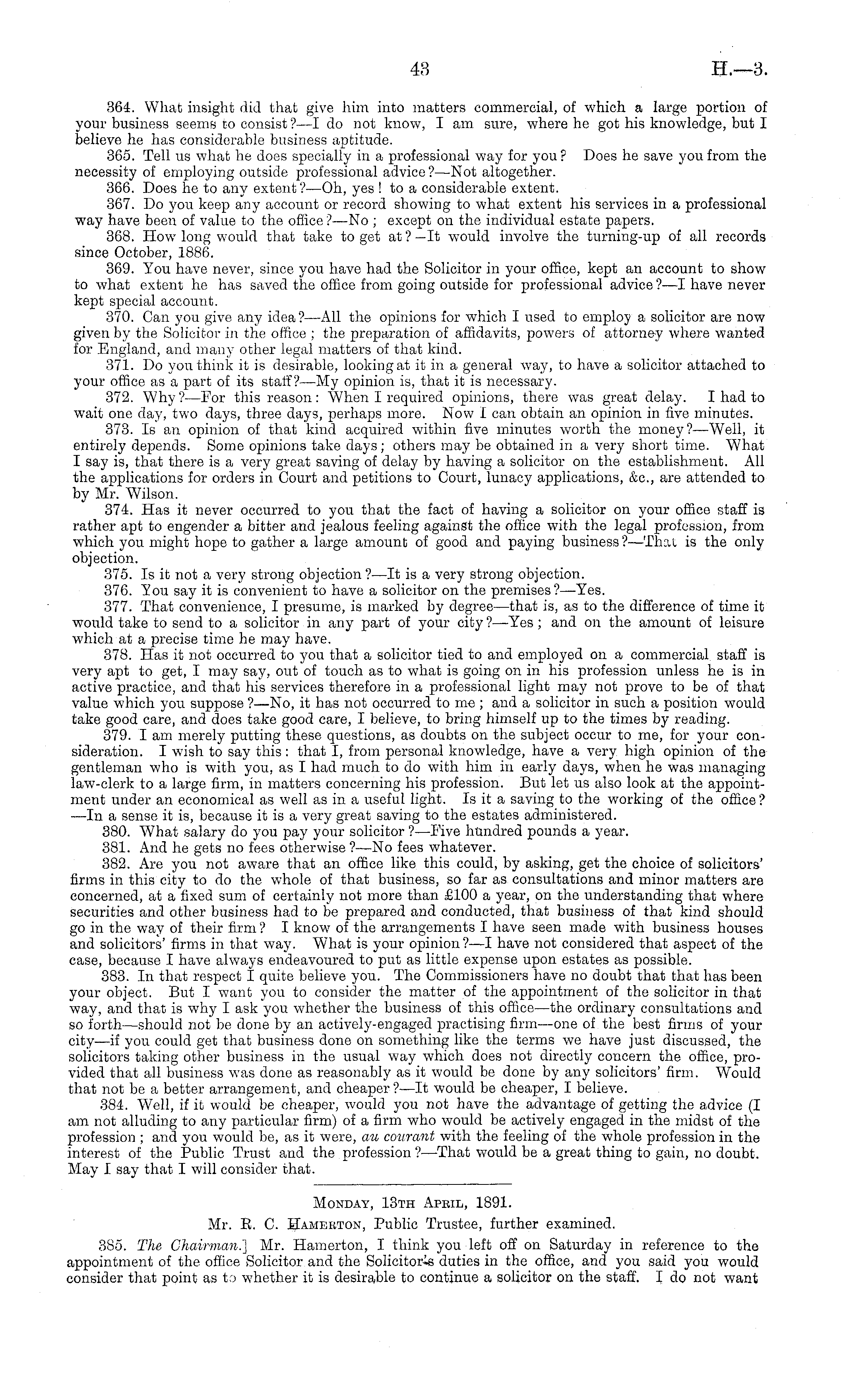 Monday, 13th Apeil, 1891. Mr. E. C. Hameeton, Public Trustee, further examined. 385. The Chairman.] Mr. Hamerton, I think you left off on Saturday in reference to the appointment of the office Solicitor and the Solicitor'-s duties in the office, and you said you would consider that point as to whether it is desirable to continue a solicitor on the staff. Ido not want