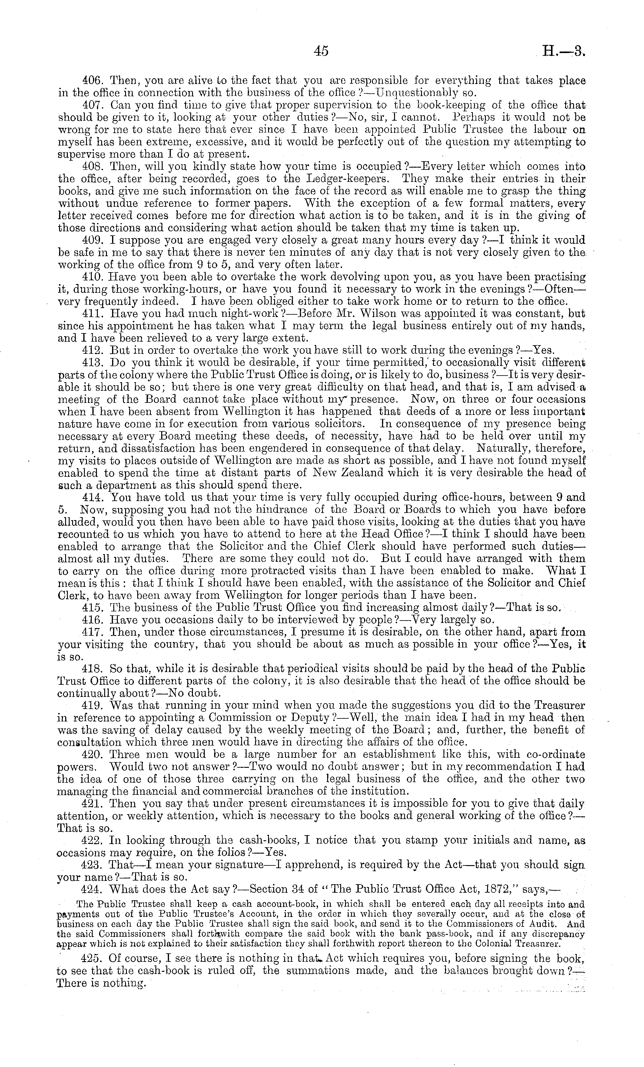 406. Then, you are alive to the fact that you arc responsible for everything that takes place in the office in connection with the business of the office ?—Unquestionably so. 407. Can you find time to give that proper supervision to the book-keeping of the office that should be given to it, looking at your other duties ? —No, sir, I cannot. Perhaps it would not be wrong for me to state here that ever since I have been appointed Public Trustee the labour on myself has been extreme, excessive, and it would be perfectly out of the question my attempting to supervise more than I do at present. 408. Then, will you kindly state how your time is occupied ?—Every letter which comes into the office, after being recorded, goes to the Ledger-keepers. They make their entries in their books, and give me such information on the face of the record as will enable me to grasp the thing without undue reference to former papers. With the exception of a few formal matters, every letter received comes before me for direction what action is to be taken, and it is in the giving of those directions and considering what action should be taken that my time is taken up. 409. I suppose you are engaged very closely a great many hours every day ?—I think it would be safe in me to say that there is never ten minutes of any day that is not very closely given to the, working of the office from 9 to 5, and very often later. 410. Have you been able to overtake the work devolving upon you, as you have been practising it, during those working-hours, or have you found it necessary to work in the evenings ? —Often— very frequently indeed. I have been obliged either to take work home or to return to the office. 411. Have you had much night-work?— Before Mr. Wilson, was appointed it was constant, but since his appointment he has taken what I may term the legal business entirely out of my hands, and I have been relieved to a very large extent. 412. But in order to overtake the work you have still to work during the evenings ?—Yes. 413. Do you think it would be desirable, if your time permitted, to occasionally visit different parts of the colony where the Public Trust Office is doing, or is likely to do, business ? —lt is very desirable it should be so; but there is one very great difficulty on that head, and that is, lam advised a meeting of the Board cannot take place without my presence. Now, on three or four occasions when I have been absent from Wellington it has happened that deeds of a more or less important nature have come in for execution from various solicitors. In consequence of my presence being necessary at every Board meeting these deeds, of necessity, have had to be held over until my return, and dissatisfaction has been engendered in consequence of that delay. Naturally, therefore, my visits to places outside of Wellington are made as short as possible, and I have not found myself enabled to spend the time at distant parts of New Zealand which it is very desirable the head of such a department as this should spend there. 414. You have told us that your time is very fully occupied during office-hours, between 9 and 5. Now, supposing you had not the hindrance of the Board, or Boards to which you have before alluded, would you then have been able to have paid those visits, looking at the duties that you have recounted to us which you have to attend to here at the Head. Office ? —I think I should have been enabled to arrange that the Solicitor and the Chief Clerk should have performed such duties— almost all my duties. There are some they could not do. But I could have arranged with them to carry on the office during more protracted visits than I have been enabled to make. What I mean is this : that I think I should have been enabled, with the assistance of the Solicitor and Chief Clerk, to have been away from Wellington for longer periods than I have been. 415. The business of the Public Trust Office you find increasing almost daily?— That is so. 416. Have you occasions daily to be interviewed by people?— Very largely so. 417. Then, under those circumstances, I presume it is desirable, on the other hand, apart from your visiting the country, that you should be about as much as possible in your office ?—Yes, it is so. 418. So that, while it is desirable that periodical visits should be paid by the head of the Public Trust Office to different parts of the colony, it is also desirable that the head of the office should be continually about?—No doubt. 419. Was that running in your mind when yon. made the suggestions you did to the Treasurer in reference to appointing a Commission or Deputy ?—Well, the main idea I had in my head then was the saving of delay caused by the weekly meeting of the Board ; and, further, the benefit of consultation which three men would have in directing the affairs of the office. 420. Three men would be a large number for an establishment like this, with co-ordinate powers. Would two not answer ?—Two would no doubt answer; but in my recommendation I had the idea of one of those three carrying on the legal business of the office, and the other two managing the financial and commercial branches of the institution. 421. Then you say that under present circumstances it is impossible for you to give that daily attention, or weekly attention, which is necessary to the books and general working of the office ?— That is so. 422. In looking through the cash-books, I notice that you stamp your initials and name, as occasions may require, on the folios?— Yes. 423. That—l mean your signature—l apprehend, is required by the Act—that you should sign your name?— That is so. 424. What does the Act say ?—Section 34 of " The Public Trust Office Act, 1872," says,— . The Public Trustee shall keep a cash account-book, in which shall be entered each day all receipts into and payments out of the Public Trustee's Account, in the order in which they severally occur, a