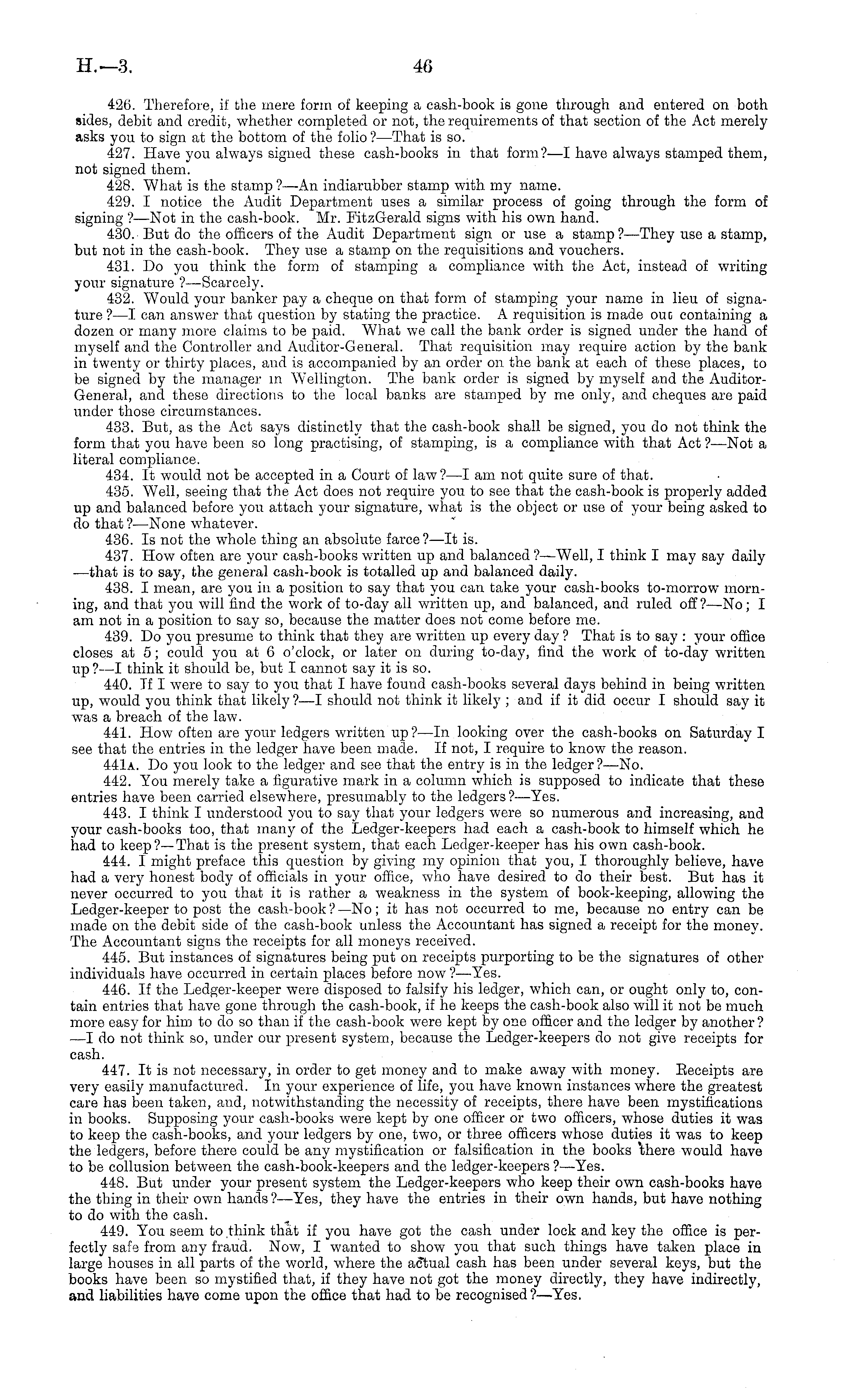 426. Therefore, if the mere form of keeping a cash-book is gone through and entered on both sides, debit and credit, whether completed or not, the requirements of that section of the Act merely asks you to sign at the bottom of the folio ? —That is so. 427. Have you always signed these cash-books in that form?—l have always stamped them, not signed them. 428. What is the stamp? —An indiarubber stamp with my name. 429. I notice the Audit Department uses a similar process of going through the form of signing ?—Not in the cash-book. Mr. FitzGerald signs with his own hand. 430. But do the officers of the Audit Department sign or use a stamp ?—They use a stamp, but not in the cash-book. They use a stamp on the requisitions and vouchers. 431. Do you think the form of stamping a compliance with the Act, instead of writing your signature ? —Scarcely. 432. Would your banker pay a cheque on that form of stamping your name in lieu of signature ? —I can answer that question by stating the practice. A requisition is made out containing a dozen or many more claims to be paid. What we call the bank order is signed under the hand of myself and the Controller and Auditor-General. That requisition may require action by the bank in twenty or thirty places, and is accompanied by an order on the bank at each of these places, to be signed by the manager in Wellington. The bank order is signed by myself and the AuditorGeneral, and these directions to the local banks are stamped by me only, and cheques are paid under those circumstances. 433. But, as the Act says distinctly that the cash-book shall be signed, you do not think the form that you have been so long practising, of stamping, is a compliance with that Act ? —Not a literal compliance. 434. It would not be accepted in a Court of law?—l am not quite sure of that. 435. Well, seeing that the Act does not require you to see that the cash-book is properly added up and balanced before you attach your signature, what is the object or use of your being asked to do that ?—None whatever. 436. Is not the whole thing an absolute farce?—lt is. 437. How often are your cash-books written up and balanced ? —Well, I think I may say daily —that is to say, the general cash-book is totalled up and balanced daily. 438. I mean, are you in a position to say that you can take your cash-books to-morrow morning, and that you will find the work of to-day all written up, and balanced, and ruled off ?—No; I am not in a position to say so, because the matter does not come before me. 439. Do you presume to think that they are written up every day ? That is to say : your office closes at 5; could you at 6 o'clock, or later on during to-day, find the work of to-day written up ? —I think it should be, but I cannot say it is so. 440. If I were to say to you that I have found cash-books several days behind in being written up, would you think that likely ?—I should not think it likely ; and if it did occur I should say it was a breach of the law. 441. How often are your ledgers written up?—ln looking over the cash-books on Saturday I see that the entries in the ledger have been made. If not, I require to know the reason. 441 a. Do you look to the ledger and see that the entry is in the ledger ?—No. 442. You merely take a figurative mark in a column which is supposed to indicate that these entries have been carried elsewhere, presumably to the ledgers?— Yes. 443. I think I understood you to say that your ledgers were so numerous and increasing, and your cash-books too, that many of the Ledger-keepers had each a cash-book to himself which he had to keep?— That is the present system, that each Ledger-keeper has his own cash-book. 444. I might preface this question by giving my opinion that you, I thoroughly believe, have had a very honest body of officials in your office, who have desired to do their best. But has it never occurred to you that it is rather a weakness in the system of book-keeping, allowing the Ledger-keeper to post the cash-book ? —No; it has not occurred to me, because no entry can be made on the debit side of the cash-book unless the Accountant has signed a receipt for the money. The Accountant signs the receipts for all moneys received. 445. But instances of signatures being put on receipts purporting to be the signatures of other individuals have occurred in certain places before now?— Yes. 446. If the Ledger-keeper were disposed to falsify his ledger, which can, or ought only to, contain entries that have gone through the cash-book, if he keeps the cash-book also will it not be much more easy for him to do so than if the cash-book were kept by one officer and the ledger by another ? —I do not think so, under our present system, because the Ledger-keepers do not give receipts for cash. 447. It is not necessary, in order to get money and to make away with money. Eeceipts are very easily manufactured. In your experience of life, you have known instances where the greatest care has been taken, and, notwithstanding the necessity of receipts, there have been mystifications in books. Supposing your cash-books were kept by one officer or two officers, whose duties it was to keep the cash-books, and your ledgers by one, two, or three officers whose duties it was to keep the ledgers, before there could be any mystification or falsification in the books there would have to be collusion between the cash-book-keepers and the ledger-keepers ? —Yes. 448. But under your present system the Ledger-keepers who keep their own cash-books have the thing in their own hands ?—Yes, they have the entries in their own hands, but have nothing to do with the cash. 449. You seem to think that if you have got the cash under lock and key the office is perfectly safe from any fraud. Now, I wanted to show you that such things have taken place in large houses in all parts of the world, where the actual cash has been under several keys, but the books have 