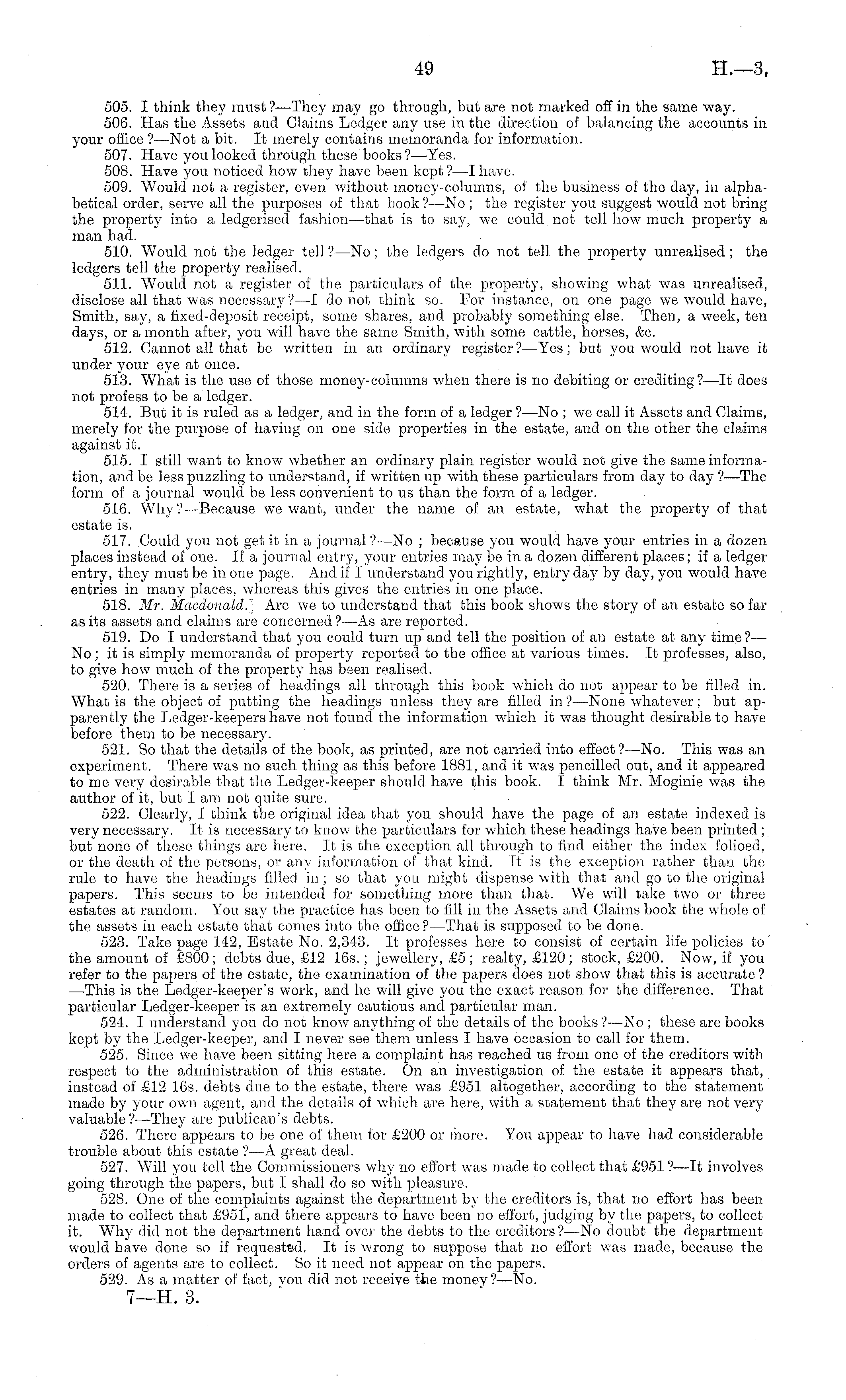 505. I think they must ?—They may go through, but are not marked off in the same way. 506. Has the Assets and Claims Ledger any use in the direction of balancing the accounts in your office ?—Not a bit. It merely contains memoranda for information. 507. Have you looked through these books?— Yes. 508. Have you noticed how they have been kept?—l have. 509. Would not a register, even without money-columns, of the business of the day, in alphabetical order, serve all the purposes of that book ?—No ; the register you suggest would not bring the property into a ledgerised fashion —that is to say, we could not tell how much property a man had. 510. Would not the ledger tell ?—No ; the ledgers do not tell the property unrealised ; the ledgers tell the property realised. 511. Would not a register of the particulars of the property, showing what was unrealised, disclose all that was necessary ?—I do not think so. For instance, on one page we would have, Smith, say, a fixed-deposit receipt, some shares, and probably something else. Then, a week, ten days, or a month after, you will have the same Smith, with some cattle, horses, &c. 512. Cannot all that be written in an ordinary register?— Yes; but you would not have it under your eye at once. 513. What is the use of those money-columns when there is no debiting or crediting?—lt does not profess to be a ledger. 514. But it is ruled as a ledger, and in the form of a ledger ? —No ; we call it Assets and Claims, merely for the purpose of having on one side properties in. the estate, and on the other the claims against it. 515. I still want to know whether an ordinary plain register would not give the same information, and be less puzzling to understand, if written up with these particulars from day to day ?—The form of a journal would be less convenient to us than the form of a ledger. 516. Why?— Because we want, under the name of an estate, what the property of that estate is. 517. Could you not get it in a journal ? —No ; because you would have your entries in a dozen places instead of one. If a journal entry, your entries may be in a dozen different places; if a ledger entry, they must be in one page. And if I understand you rightly, entry day by day, you would have entries in many places, whereas this gives the entries in one place. 518. Mr. Macdonald.} Are we to understand that this book shows the story of an estate so far as its assets and claims are concerned? —As are reported. 519. Do I understand that you could turn up and tell the position of an estate at any time ? — No; it is simply memoranda of property reported to the office at various times. It professes, also, to give how much of the property has been realised. 520. There is a series of headings all through this book which do not appear to be filled in. What is the object of putting the headings unless they are filled in ?—None whatever: but apparently the Ledger-keepers have not found the information which it was thought desirable to have before them to be necessary. 521. So that the details of the book, as printed, are not carried into effect?— No. This was an experiment. There was no such thing as this before 1881, and it was pencilled out, and it appeared to me very desirable that the Ledger-keeper should have this book. I think Mr. Moginie was the author of it, but I am not quite sure. 522. Clearly, I think the original idea that you should have the page of an estate indexed is very necessary. It is necessary to know the particulars for which these headings have been printed ; but none of these things are here. It is the exception all through to find either the index folioed, or the death of the persons, or any information of that kind. It is the exception rather than the rule to have the headings filled in; so that you might dispense with that and go to the original papers. This seems to be intended for something more than that. We will take two or three estates at random. You say the practice has been to fill in the Assets and Claims book the whole of the assets hi each estate that comes into the office?— That is supposed to be done. 523. Take page 142, Estate No. 2,343. It professes here to consist of certain life policies to the amount of £800; debts due, £12 165.; jewellery, £5; realty, £120; stock, £200. Now, if you refer to the papers of the estate, the examination of the papers does not show that this is accurate ? —This is the Ledger-keeper's work, and he will give you the exact reason for the difference. That particular Ledger-keeper is an extremely cautious and particular man. 524. I understand you do not know anything of the details of the books ?—No ; these are books kept by the Ledger-keeper, and I never see them unless I have occasion to call for them. 525. Since we have been sitting here a complaint has reached us from one of the creditors with respect to the administration of this estate. On an investigation of the estate it appears that, instead of £12 16s. debts due to the estate, there was £951 altogether, according to the statement made by your own agent, and the details of which are here, with a statement that they are not very valuable? —They are publican's debts. 526. There appears to be one of them for £200 or more. You appear to have had considerable trouble about this estate ?—A great deal. 527. Will you tell the Commissioners why no effort was made to collect that £951 ?—lt involves going through the papers, but I shall do so with pleasure. 528. One of the complaints against the department by the creditors is, that no effort has been made to collect that £951, and there appears to have been no effort, judging by the papers, to collect it. Why did not the department hand over the debts to the creditors?—No doubt the department would have done so if requested. It is wrong to suppose that no effort was made, because the orders of agents are to collect. So it need not appear on the papers. 529. As a