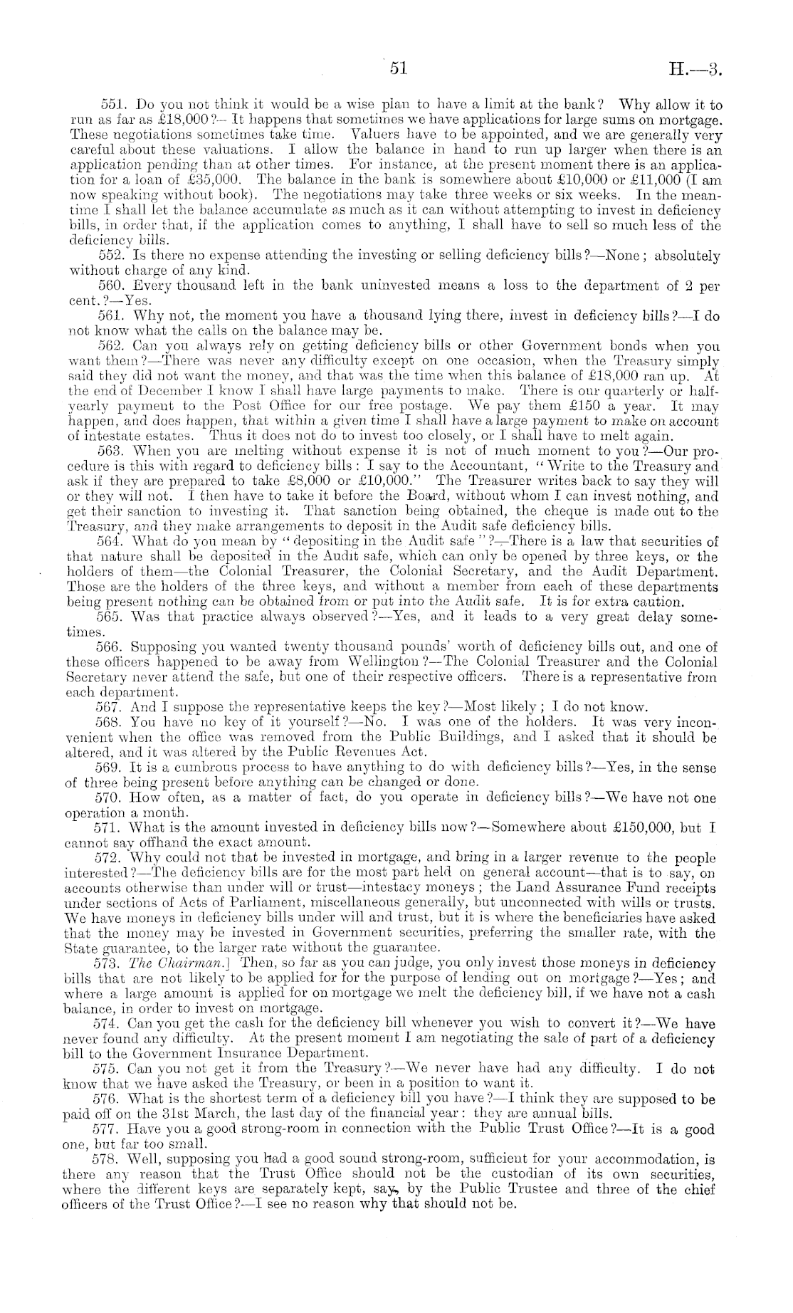 551. Do you not think it would be a wise plan to have a limit at the bank? Why allow it to run as far as £18,000 ?— It happens that sometimes we have applications for large sums on mortgage. These negotiations sometimes take time. Valuers have to be appointed, and we are generally very careful about these valuations. I allow the balance in hand to run up larger when there is an application pending than at other times. For instance, at the present moment there is an application for a loan of £35,000. The balance in the bank is somewhere about £10,000 or £11,000 (I am now speaking without book). The negotiations may take three weeks or six weeks. In the meantime I shall let the balance accumulate as much as it can without attempting to invest in deficiency bills, in order that, if the application comes to anything, I shall have to sell so much less of the deficiency bills. 552. Is there no expense attending the investing or selling deficiency bills?— None; absolutely without charge of any kind. 560. Every thousand left in the bank uninvested means a loss to the department of 2 per cent.? —Yes. 561. Why not, the moment you have a thousand lying there, invest in deficiency bills?—l do not know what the calls on the balance may be. 562. Can you always rely on getting deficiency bills or other Government bonds when you want them? —There was never any difficulty except on one occasion, when the Treasury simply said they did not want the money, and that was the time when this balance of £13,000 ran up. At the end of December I know I shall have large payments to make. There is our quarterly or halfyearly payment to the Eost Office for our free postage. We pay them £150 a year. It may happen, and does happen, that within a given time I shall have a large payment to make on account of intestate estates. Thus it does not do to invest too closely, or I shall have to melt again. 563. When you are melting without expense it is not of much moment to you?— Our procedure is this with regard to deficiency bills : I say to the Accountant, " Write to the Treasury and ask if they are prepared to take £8,000 or £10,000." The Treasurer writes back to say they will or they will not. I then have to take it before the Board, without whom I can invest nothing, and get their sanction to investing it. That sanction being obtained, the cheque is made out to the Treasury, and they make arrangements to deposit in the Audit safe deficiency bills. 564. What do you mean by " depositing in the Audit safe " ? —There is a law that securities of that nature shall be deposited in the Audit safe, which can only be opened by three keys, or the holders of them—the Colonial Treasurer, the Colonial Secretary, and the Audit Department. Those are the holders of the three keys, and without a member from each of these departments being present nothing can be obtained from or put into the Audit safe. It is for extra caution. 565. Was that practice always observed ?—Yes, and it leads to a very great delay sometimes. 566. Supposing you wanted twenty thousand pounds' worth of deficiency bills out, and one of these officers happened to be away from Wellington ?—The Colonial Treasurer and the Colonial Secretary never attend the safe, but one of their respective officers. There is a representative from each department. 567. And I suppose the representative keeps the key ? —Most likely ; I do not know. 568. You have no key of it yourself?— No. I was one of the holders. It was very inconvenient when the office was removed from the Fublic Buildings, and I asked that it should be altered, and it was altered by the Fublic Eevenues Act. 569. It is a cumbrous process to have anything to do with deficiency bills?— Yes, in the sense of three being present before anything can be changed or done. 570. How often, as a matter of fact, do you operate in deficiency bills ?—We have not one operation a month. 571. What is the amount invested in deficiency bills now?— Somewhere about £150,000, but I cannot say offhand the exact amount. 572. Why could not that be invested in mortgage, and bring in a larger revenue to the people interested ?—The deficiency bills are for the most part held on general account—that is to say, on accounts otherwise than under will or trust —intestacy moneys ; the Land Assurance Fund receipts under sections of Acts of Parliament, miscellaneous generally, but unconnected with wills or trusts. We have moneys in deficiency bills under will and trust, but it is where the beneficiaries have asked that the money may be invested in Government securities, preferring the smaller rate, with the State guarantee, to the larger rate without the guarantee. 573. The Chairman.] Then, so far as you can judge, you only invest those moneys in deficiency bills that are not likely to be applied for for the purpose of lending out on mortgage ?—Yes ; and where a large amount is applied for on mortgage we melt the deficiency bill, if we have not a cash balance, in order to invest on mortgage. 574. Can you get the cash for the deficiency bill whenever you wish to convert it?—We have never found any difficulty. At the present moment lam negotiating the sale of part of a deficiency bill to the Government Insurance Department. 575. Can you not get it from the Treasury?—We never have had any difficulty. I do not know that we have asked the Treasury, or been in a position to want it. 576. What is the shortest term of a deficiency bill you have ?—I think they are supposed to be paid off on the 31st March, the last clay of the financial year: they are annual bills. 577. Have you a good strong-room, in connection with the Public Trust Office?—lt is a good one, but far too small. 578. Well, supposing you had a good sound strong-room, sufficient for your accommodation, is there any reason that the Trust Office should not be the custodian of its own securities, where the different keys are separately kept, say, by 