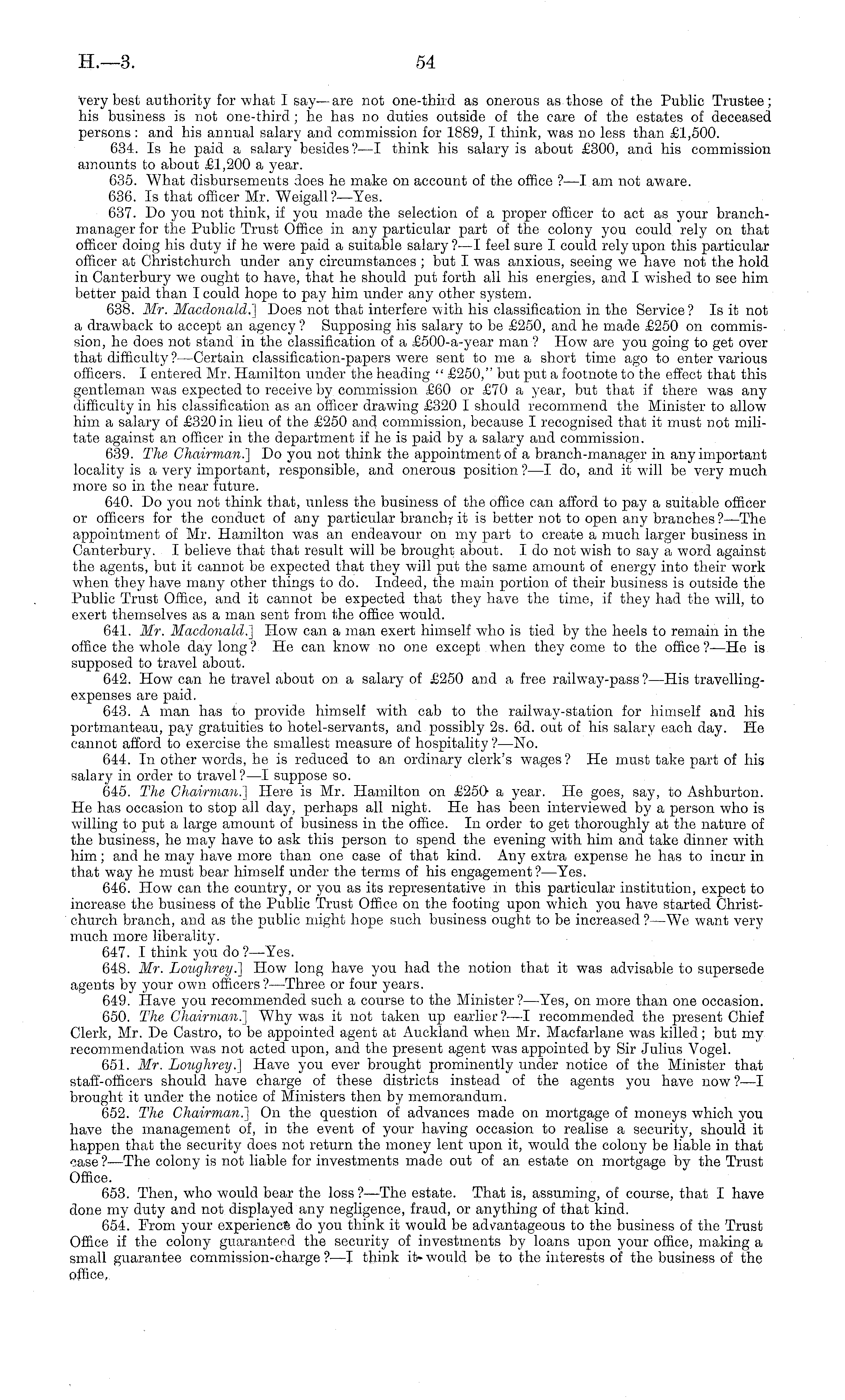 very best authority for what I say—are not one-third as onerous as those of the Public Trustee; his business is not one-third ; he has no duties outside of the care of the estates of deceased persons : and his annual salary and commission for 1889, I think, was no less than £1,500. 634. Is he paid a salary besides?—l think his salary is about £300, and his commission amounts to about £1,200 a year. 635. What disbursements does he make on account of the office ?—I am not aware. 636. Is that officer Mr. Weigall?—Yes. 637. Do you not think, if you made the selection of a proper officer to act as your branchmanager for the Public Trust Office in any particular part of the colony you could rely on that officer doing his duty if he were paid a suitable salary?—l feel sure I could rely upon this particular officer at Christchurch under any circumstances ; but I was anxious, seeing we have not the hold in Canterbury we ought to have, that he should put forth all his energies, and I wished to see him better paid than I could hope to pay him under any other system. 638. Mr. Macdonald.] Does not that interfere with his classification in the Service? Is it not a drawback to accept an agency ? Supposing his salary to be £250, and he made £250 on commission, he does not stand in the classification of a £500-a-year man ? How are you going to get over that difficulty ? —Certain classification-papers were sent to me a short time ago to enter various officers. I entered Mr. Hamilton under the heading " £250," but put a footnote to the effect that this gentleman was expected to receive by commission £60 or £70 a year, but that if there was any difficulty in his classification as an officer drawing £320 I should recommend the Minister to allow him a salary of £320 in lieu of the £250 and commission, because I recognised that it must not militate against an officer in the department if he is paid by a salary and commission. 639. The Chairman.] Do you not think the appointment of a branch-manager in any important locality is a very important, responsible, and onerous position ?—I do, and it will be very much more so in the near future. 640. Do you not think that, unless the business of the office can afford to pay a suitable officer or officers for the conduct of any particular branch? it is better not to open any branches ?—The appointment of Mr. Hamilton was an endeavour on my part to create a much larger business in Canterbury. I believe that that result will be brought about. Ido not wish to say a word against the agents, but it cannot be expected that they will put the same amount of energy into their work when they have many other things to do. Indeed, the main portion of their business is outside the Public Trust Office, and it cannot be expected that they have the time, if they had the will, to exert themselves as a man sent from the office would. 641. Mr. Macdonald.} How can a man exert himself who is tied by the heels to remain in the office the whole day long ? He can know no one except when they come to the office ?—He is supposed to travel about. 642. How can he travel about on a salary of £250 and a free railway-pass? —His travellingexpenses are paid. 643. A man has to provide himself with cab to the railway-station for himself and his portmanteau, pay gratuities to hotel-servants, and possibly 2s. 6d. out of his salary each day. He cannot afford to exercise the smallest measure of hospitality ?—No. 644. In other words, he is reduced to an ordinary clerk's wages? He must take part of his salary in order to travel? —I suppose so. 645. The Chairman.] Here is Mr. Hamilton on £250 a year. He goes, say, to Ashburton. He has occasion to stop all day, perhaps all night. He has been interviewed by a person who is willing to put a large amount of business in the office. In order to get thoroughly at the nature of the business, he may have to ask this person to spend the evening with him and take dinner with him; and he may have more than one case of that kind. Any extra expense he has to incur in that way he must bear himself under the terms of his engagement? —Yes. 646. How can the country, or you as its representative m this particular institution, expect to increase the business of the Public Trust Office on the footing upon which you have started Christchurch branch, and as the public might hope such business ought to be increased ?—We want very much more liberality. 647. I think you do ? —Yes. 648. Mr. Lotighrey.] How long have you had the notion that it was advisable to supersede agents by your own officers?— Three or four years. 649. Have you recommended such a course to the Minister?— Yes, on more than one occasion. 650. The Chairman.] Why was it not taken up earlier ?—I recommended the present Chief Clerk, Mr. De Castro, to be appointed agent at Auckland when Mr. Macfarlane was killed; but my recommendation was not acted upon, and the present agent was appointed by Sir Julius Vogel. 651. Mr. Loughrey.] Have you ever brought prominently under notice of the Minister that staff-officers should have charge of these districts instead of the agents you have now ?—I brought it under the notice of Ministers then by memorandum. 652. The Chairman.] On the question of advances made on mortgage of moneys which you have the management of, in the event of your having occasion to realise a security, should it happen that the security does not return the money lent upon it, would the colony be liable in that case? —The colony is not liable for investments made out of an estate on mortgage by the Trust Office. 653. Then, who would bear the loss?— The estate. That is, assuming, of course, that I have done my duty and not displayed any negligence, fraud, or anything of that kind. 654. Prom your experience do you think it would be advantageous to the business of the Trust Office if the colony guaranteed the security of investments by loans upon your office, ma