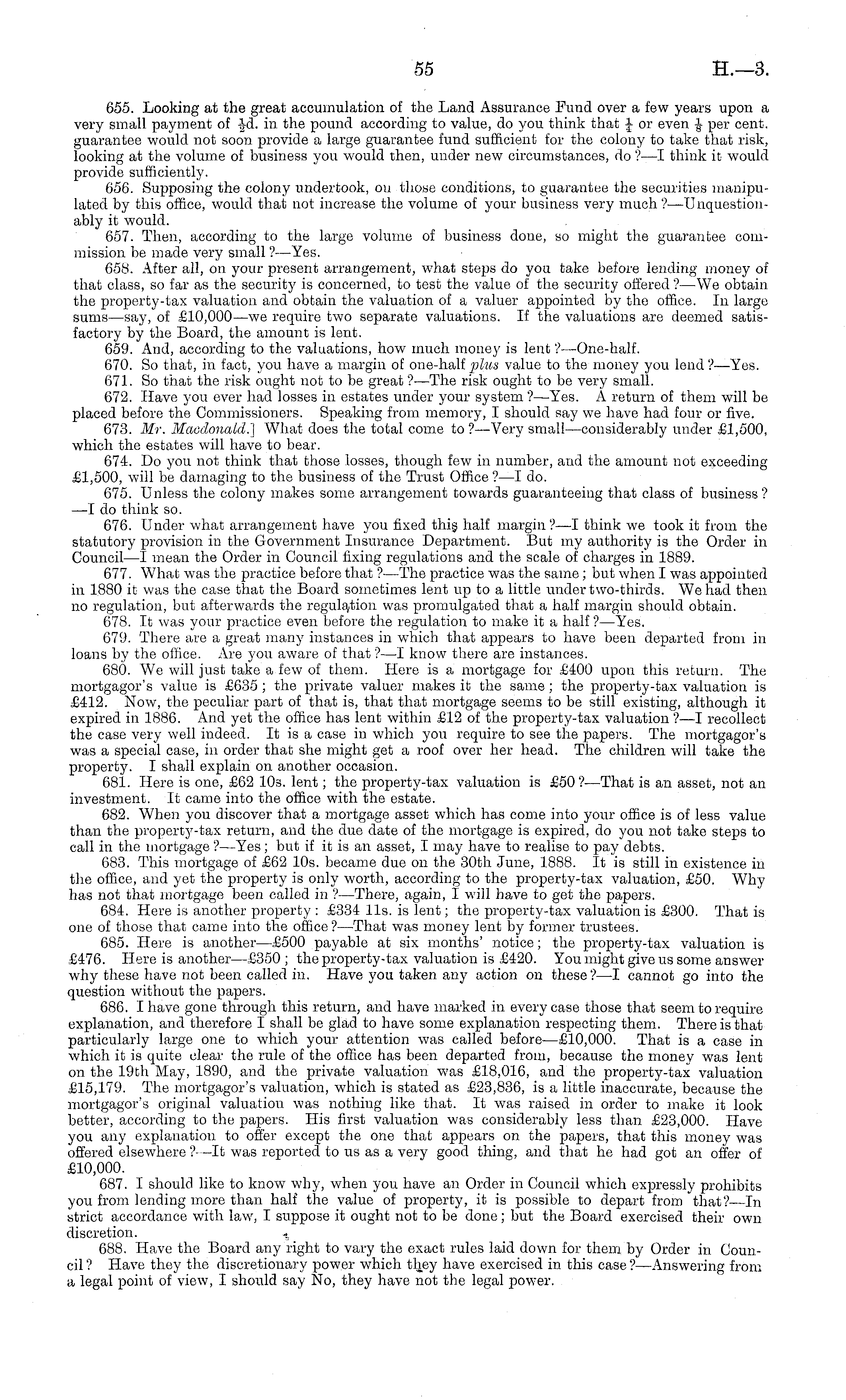 655. Looking at the great accumulation of the Land Assurance Fund over a few years upon a very small payment of -Jd. in the pound according to value, do you think that J or even £ per cent, guarantee would not soon provide a large guarantee fund sufficient for the colony to take that risk, looking at the volume of business you would then, under new circumstances, do ?—I think it would provide sufficiently. 656. Supposing the colony undertook, on those conditions, to guarantee the securities manipulated by this office, would that not increase the volume of your business very much ?—Unquestionably it would. 657. Then, according to the large volume of business done, so might the guarantee commission be made very small ?—Yes. 658. After all, on your present arrangement, what steps do you take before lending money of that class, so far as the security is concerned, to test the value of the security offered ?—We obtain the property-tax valuation and obtain the valuation of a valuer appointed by the office. In large sums—say, of £10,000 —we require two separate valuations. If the valuations are deemed satisfactory by the Board, the amount is lent. 659. And, according to the valuations, how much money is lent ?—One-half. 670. So that, in fact, you have a margin of one-half plus value to the money you lend ?—Yes. 671. So that the risk ought not to be great ?—The risk ought to be very small. 672. Have you ever had losses in estates under your system ? —Yes. A return of them will be placed before the Commissioners. Speaking from memory, I should say we have had four or five. 673. Mr. Macdonald.] What does the total come to?— Very small —considerably under £1,500, which the estates will have to bear. 674. Do you not think that those losses, though few in number, and the amount not exceeding £1,500, will be damaging to the business of the Trust Office ?—I do. 675. Unless the colony makes some arrangement towards guaranteeing that class of business ? —I do think so. 676. Under what arrangement have you fixed this half margin ?—I think we took it from the statutory provision in the Government Insurance Department. But my authority is the Order in Council —I mean the Order in Council fixing regulations and the scale of charges in 1889. 677. What was the practice before that ? —The practice was the same ; but when I was appointed in 1880 it was the case that the Board sometimes lent up to a little under two-thirds. We had then no regulation, but afterwards the regulation was promulgated that a half margin should obtain. 678. It was your practice even before the regulation to make it a half ? —Yes. 679. There are a great many 7 instances in which that appears to have been departed from in loans by the office. Are you aware of that ?—I know there are instances. 680. We will just take a few of them. Here is a mortgage for £400 upon this return. The mortgagor's value is £635 ; the private valuer makes it the same ; the property-tax valuation is £412. Now, the peculiar part of that is, that that mortgage seems to be still existing, although it expired in 1886. And yet the office has lent within £12 of the property-tax valuation ?—I recollect the case very well indeed. It is a case in which you require to see the papers. The mortgagor's was a special case, in order that she might get a roof over her head. The children will take the property. I shall explain on another occasion. 681. Here is one, £62 10s. lent; the property-tax valuation is £50? —That is an asset, not an investment. It came into the office with the estate. 682. When you discover that a mortgage asset which has come into your office is of less value than the property-tax return, and the due date of the mortgage is expired, do you not take steps to call in the mortgage ?—Yes; but if it is an asset, I may have to realise to pay debts. 683. This mortgage of £62 10s. became due on the 30th June, 1888. It is still in existence in the office, and yet the property is only worth, according to the property-tax valuation, £50. Why has not that mortgage been called in ?—There, again, I will have to get the papers. 684. Here is another property : £334 lis. is lent; the property-tax valuation is £300. That is one of those that came into the office?— That was money lent by former trustees. 685. Here is another—£soo payable at six months' notice; the property-tax valuation is £476. Here is another —£350 ; the property-tax valuation is £420. You might give us some answer why these have not been called in. Have you taken any action on these ? —I cannot go into the question without the papers. 686. I have gone through this return, and have marked in every case those that seem to require explanation, and therefore I shall be glad to have some explanation respecting them. There is that particularly large one to which your attention was called before—£lo,ooo. That is a case in which it is quite clear the rule of the office has been departed from, because the money was lent on the 19th May, 1890, and the private valuation was £18,016, and the property-tax valuation £15,179. The mortgagor's valuation, which is stated as £23,836, is a little inaccurate, because the mortgagor's original valuation was nothing like that. It was raised in order to make it look better, according to the papers. His first valuation was considerably less than £23,000. Have you any explanation to offer except the one that appears on the papers, that this money was offered elsewhere ?--It was reported to us as a very good thing, and that he had got an offer of £10,000. 687. I should like to know why, when you have an Order in Council which expressly prohibits you from lending more than half the value of property, it is possible to depart from that?—ln strict accordance with law, I suppose it ought not to be done; but the Board exercised their own discretion. . 688. Have the Board any right to vary the exact rules l