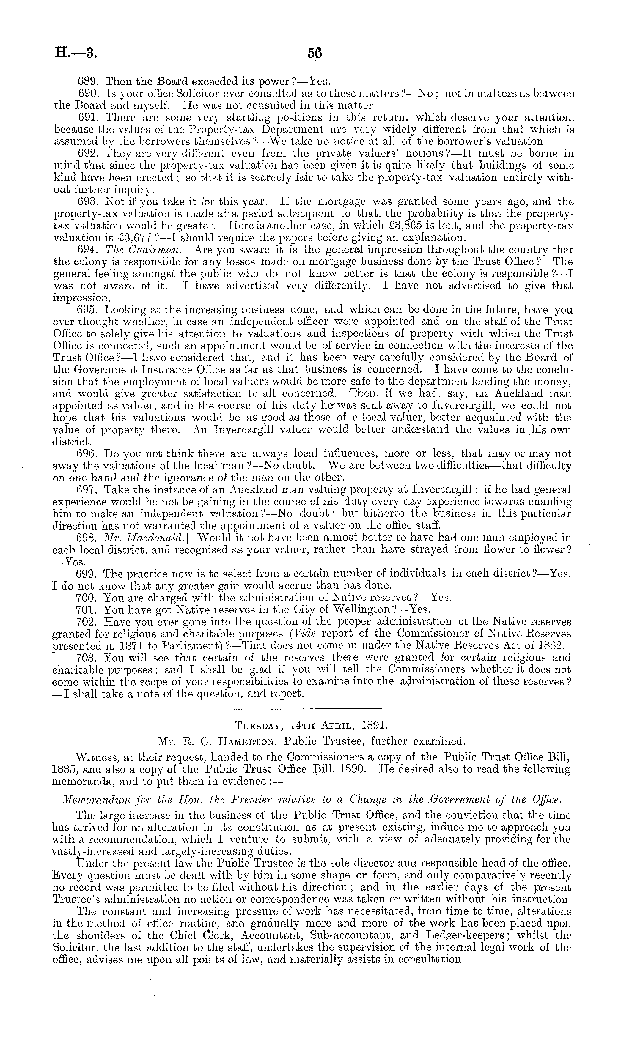 Tuesday, 14th April, 1891. Mr. R. C. Hameeton, Public Trustee, further examined. Witness, at their request, handed to the Commissioners a copy of the Public Trust Office Bill, 1885, and also a copy of the Public Trust Office Bill, 1890. He desired also to read the following memoranda, and to put them in evidence : — Memorandum for the Hon. the Premier relative to a Change in the .Government of the Office. The large increase in the business of the Public Trust Office, and the conviction that the time has arrived for an alteration in its constitution as at present existing, induce me to approach you with a recommendation, which I venture to submit, with a view of adequately providing for the vastly-increased and largely-increasing duties. Under the present law the Public Trustee is the sole director and responsible head of the office. Every question must be dealt with by him in some shape or form, and only comparatively recently no record was permitted to be filed without his direction; and in the earlier days of the present Trustee's administration no action or correspondence was taken or written without his instruction The constant and increasing pressure of work has necessitated, from time to time, alterations in the method of office routine, and gradually more and more of the work has been placed upon the shoulders of the Chief Clerk, Accountant, Sub-accountant, and Ledger-keepers; whilst the Solicitor, the last addition to the staff, undertakes the supervision of the internal legal work of the office, advises me upon all points of law, and materially assists in consultation.