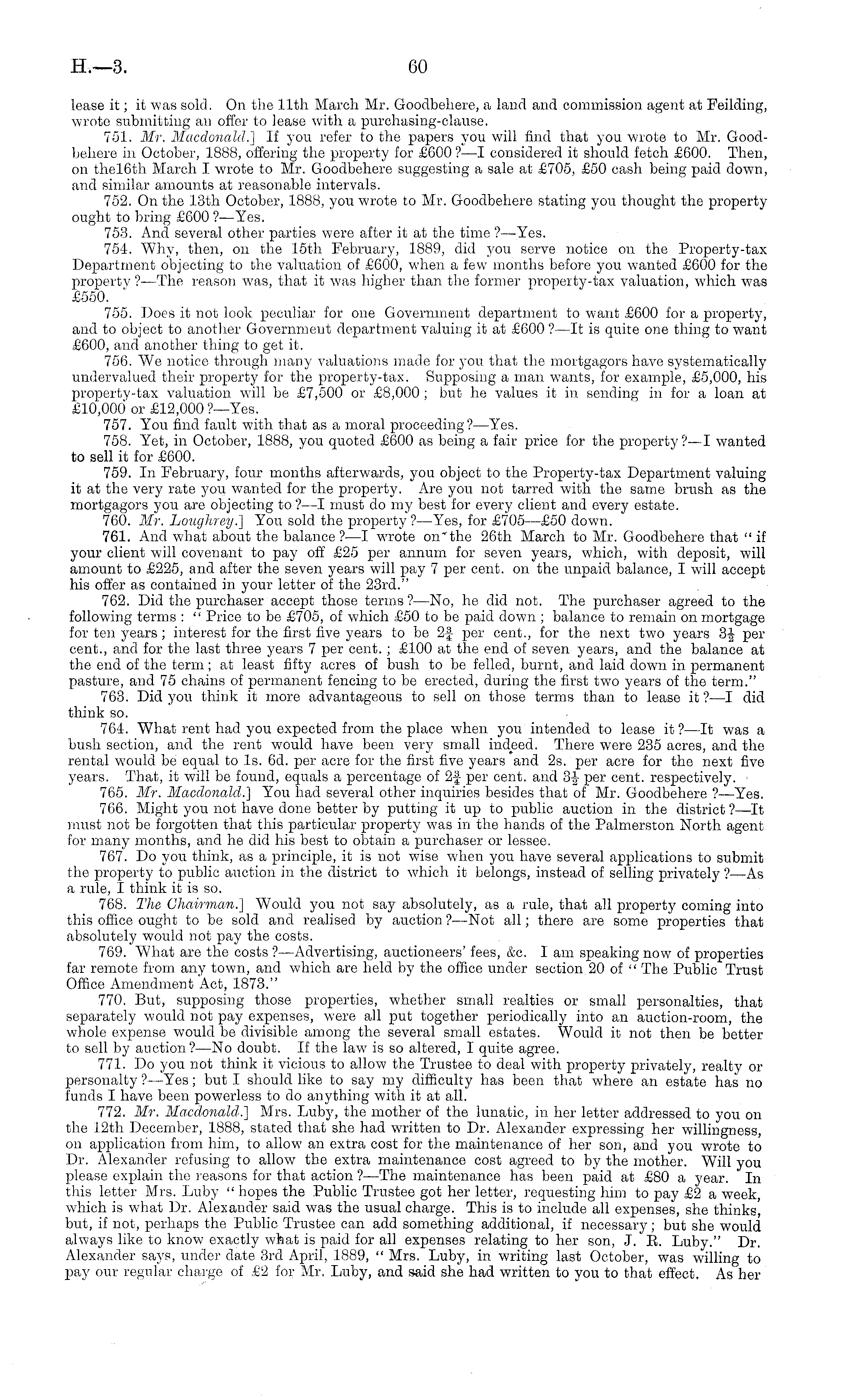 lease it; it was sold. On the 11th March Mr. Goodbehere, a land and commission agent at Feilding, wrote submitting an offer to lease with a purchasing-clause. 751. Mr. Macdonald.] If you refer to the papers you will find that you wrote to Mr. Goodbehere in October, 1888, offering the property for £600 ? —I considered it should fetch £600. Then, on thel6th March I wrote to Mr. Goodbehere suggesting a sale at £705, £50 cash being paid down, and similar amounts at reasonable intervals. 752. On the 13th October, 1888, you wrote to Mr. Goodbehere stating you thought the property ought to bring £600 ?—Yes. 753. And several other parties were after it at the time ?—Yes. 754. Why, then, on the 15th February, 1889, did you serve notice on the Property-tax Department objecting to the valuation of £600, when a few months before you wanted £600 for the property?— The reason was, that it was higher than the former property-tax valuation, which was £550. 755. Does it not look peculiar for one Government department to want £600 for a property, and to object to another Government department valuing it at £600 ?—lt is quite one thing to want £600, and another thing to get it. 756. We notice through many valuations made for you that the mortgagors have systematically undervalued their property for the property-tax. Supposing a man wants, for example, £5,000, his property-tax valuation will be £7,500 or £8,000 : but he values it in sending in for a loan at £10,000 or £12,000 ?—Yes. 757. You find fault with that as a moral proceeding? —Yes. 758. Yet, in October, 1888, you quoted £600 as being a fair price for the property?—l wanted to sell it for £600. 759. In February, four months afterwards, you object to the Property-tax Department valuing it at the very rate you wanted for the property. Are you not tarred with the same brush as the mortgagors you are objecting to ?—I must do my best for every client and every estate. 760. Mr. Loughrey.] You sold the property ?—Yes, for £705 —£50 down. 761. And what about the balance ?—I wrote on" the 26th March to Mr. Goodbehere that " if your client will covenant to pay off £25 per annum for seven years, which, with deposit, will amount to £225, and after the seven years will pay 7 per cent, on the unpaid balance, I will accept his offer as contained in your letter of the 23rd." 762. Did the purchaser accept those terms ?—No, he did not. The purchaser agreed to the following terms : " Price to be £705, of which £50 to be paid down ; balance to remain on. mortgage for ten years ; interest for the first five years to be 2f per cent., for the next two years 3-J per cent., and for the last three years 7 per cent. ; £100 at the end of seven years, and the balance at the end of the term; at least fifty acres of bush to be felled, burnt, and laid down in. permanent pasture, and 75 chains of permanent fencing to be erected, during the first two years of the term." 763. Did you think it more advantageous to sell on those terms than to lease it? —I did think so. 764. What rent had you expected from the place when you intended to lease it ? —lt was a bush section, and the rent would have been very small indeed. There were 235 acres, and the rental would be equal to Is. 6d. per acre for the first five years and 2s. per acre for the next five years. That, it will be found, equals a percentage of 2f per cent, and 3f per cent, respectively. ■ 765. Mr. Macdonald.] You had several other inquiries besides that of Mr. Goodbehere ?—Yes. 766. Might you not have done better by putting it up to public auction in the district ?—lt must not be forgotten that this particular property was in the hands of the Palmerston North agent for many months, and he did his best to obtain a purchaser or lessee. 767. Do you think, as a principle, it is not wise when you have several applications to submit the property to public auction in the district to which it belongs, instead of selling privately ? —As a rule, I think it is so. 768. The Chairman.] Would you not say absolutely, as a rule, that all property coming into this office ought to be sold and realised by auction ? —Not all; there are some properties that absolutely would not pay the costs. 769. What are the costs ? —Advertising, auctioneers' fees, &c. lam speaking now of properties far remote from any town, and which are held by the office under section 20 of " The Public Trust Office Amendment Act, 1873." 770. But, supposing those properties, whether small realties or small personalties, that separately would not pay expenses, were all put together periodically into an auction-room, the whole expense would be divisible among the several small estates. Would it not then be better to sell by auction? —No doubt. If the law is so altered, I quite agree. 771. Do you not think it vicious to allow the Trustee to deal with property privately, realty or personalty ?—Yes; but I should like to say my difficulty has been that where an estate has no funds I have been powerless to do anything with it at all. 772. Mr. Macdonald.] Mrs. Luby, the mother of the lunatic, in her letter addressed to you on the 12th December, 1888, stated that she had written to Dr. Alexander expressing her willingness, on application from him, to allow an extra cost for the maintenance of her son, and you wrote to Dr. Alexander refusing to allow the extra maintenance cost agreed to by the mother. Will you please explain the reasons for that action ? —The maintenance has been paid at £80 a year. In this letter Mrs. Luby " hopes the Public Trustee got her letter, requesting him to pay £2 a week, which is what Dr. Alexander said was the usual charge. This is to include all expenses, she thinks, but, if not, perhaps the Public Trustee can add something additional, if necessary ; but she would always like to know exactly what is paid for all expenses relating to her son, J. E. Luby." Dr. Alexander says, under date 