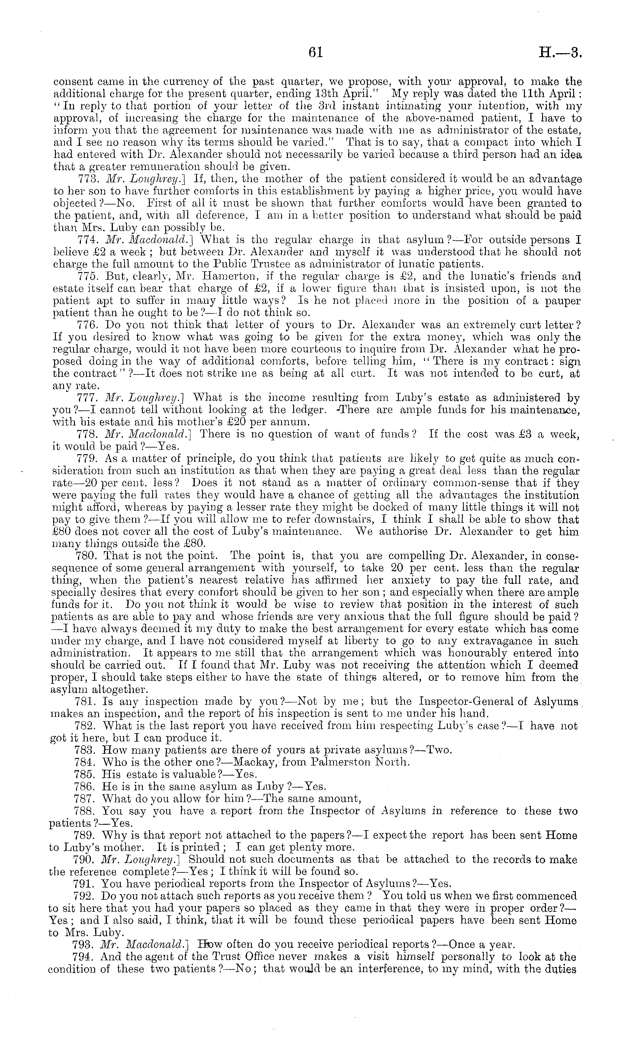 consent came in the currency of the past quarter, we propose, with your approval, to make the additional charge for the present quarter, ending 13th April." My reply was dated the 11th April : "In reply to that portion of your letter of the 3rd instant intimating your intention, with my approval, of increasing the charge for the maintenance of the above-named patient, I have to inform you that the agreement for maintenance was made with me as administrator of the estate, and I see no reason why its terms should be varied." That is to say, that a compact into which I had entered with Dr. Alexander should not necessarily be varied because a third person had an idea that a greater remuneration should be given. 773. Mr. Loughrey.] If, then, the mother of the patient considered it would be an advantage to her son to have further comforts in this establishment by paying a higher price, you would have objected ? —No. First of all it must be shown that further comforts would have been granted to the patient, and, with all deference, I am in a better position to understand what should be paid than Mrs. Luby can possibly be. 774. Mr. Macdonald.} What is the regular charge in that asylum ? —For outside persons I believe £2 a week ; but between Dr. Alexander and myself it was understood that he should not charge the full amount to the Public Trustee as administrator of lunatic patients. 775. But, clearly, Mr. Hamerton, if the regular charge is £2, and the lunatic's friends and estate itself can bear that charge of £2, if a lower figure than that is insisted upon, is not the patient apt to suffer in many little ways? Is he not placed more in the position of a pauper patient than he ought to be ?—I do not think so. 776. Do you not think that letter of yours to Dr. Alexander was an extremely curt letter ? If you desired to know what was going to be given for the extra money, which was only the regular charge, would it not have been more courteous to inquire from Dr. Alexander what he proposed doing in the way of additional comforts, before telling him, "There is my contract: sign the contract" ? —lt does not strike me as being at all curt. It was not intended to be curt, at any rate. 777. Mr. Loughrey.] What is the income resulting from Luby's estate as administered by you ?—I cannot tell without looking at the ledger. -There are ample funds for his maintenance, with bis estate and his mother's £20 per annum. 778. Mr. Macdonald.} There is no question of want of funds ? If the cost was £3 a week, it would be paid ?—Yes. 779. As a matter of principle, do you think that patients are likely to get quite as much consideration from such an institution as that when they are paying a great deal less than the regular rate —20 per cent, less? Does it not stand as a matter of ordinary common-sense that if they were paying the full rates they would have a chance of getting all the advantages the institution might afford, whereas by paying a lesser rate they might be docked of many little things it will not pay to give them ?—lf you will allow me to refer downstairs, I think I shall be able to show that £80 does not cover all the cost of Luby's maintenance. We authorise Dr. Alexander to get him many things outside the £80. 780. That is not the point. The point is, that you are compelling Dr. Alexander, in consosequence of some general arrangement with yourself, to take 20 per cent, less than the regular thing, when the patient's nearest relative has affirmed her anxiety to pay the full rate, and specially desires that every comfort should be given to her son ; and especially when there are ample funds for it. Do you not think it would be wise to review that position in the interest of such patients as are able to pay and whose friends are very anxious that the full figure should be paid ? —I have always deemed it my duty to make the best arrangement for every estate which has come under my charge, and I have not considered myself at liberty to go to any extravagance in such administration. It appears to me still that the arrangement which was honourably entered into should be carried out. If I found that Mr. Luby was not receiving the attention which I deemed proper, I should take steps either to have the state of things altered, or to remove him from the asylum altogether. 781. Is any inspection made by you?— Not by me; but the Inspector-General of Aslyums makes an inspection, and the report of his inspection is sent to me under his hand. 782. What is the last report you have received from him respecting Luby's case?—l have not got it here, but I can produce it. 783. How many patients are there of yours at private asylums? —Two. 784. Who is the other one?—Mackay, from Palmerston North. 785. His estate is valuable ?—Yes. 786. He is in the same asylum as Luby ?—Yes. 787. What do you allow for him?— The same amount, 788. You say you have a report from the Inspector of Asylums in reference to these two patients ? —Yes. 789. Why is that report not attached to the papers? —I expect the report has been sent Home to Luby's mother. It is printed ; I can get plenty more. 790. Mr. Loughrey.] Should not such documents as that be attached to the records to make the reference complete ?—Yes ; I think it will be found so. 791. You have periodical reports from the Inspector of Asylums?— Yes. 792. Do you not attach such reports as you receive them ? You told us when we first commenced to sit here that you had your papers so placed as they came hi that they were in proper order?—■ Yes ; and I also said, I think, that it will be found these periodical papers have been sent Home to Mrs. Luby. 793. Mr. Macdonald.] How often do you receive periodical reports?— Once a year. 794. And the agent of the Trust Office never makes a visit himself personally to look at the condition of these two patients ? —No ; that would be an interference, to my mind, with the duties